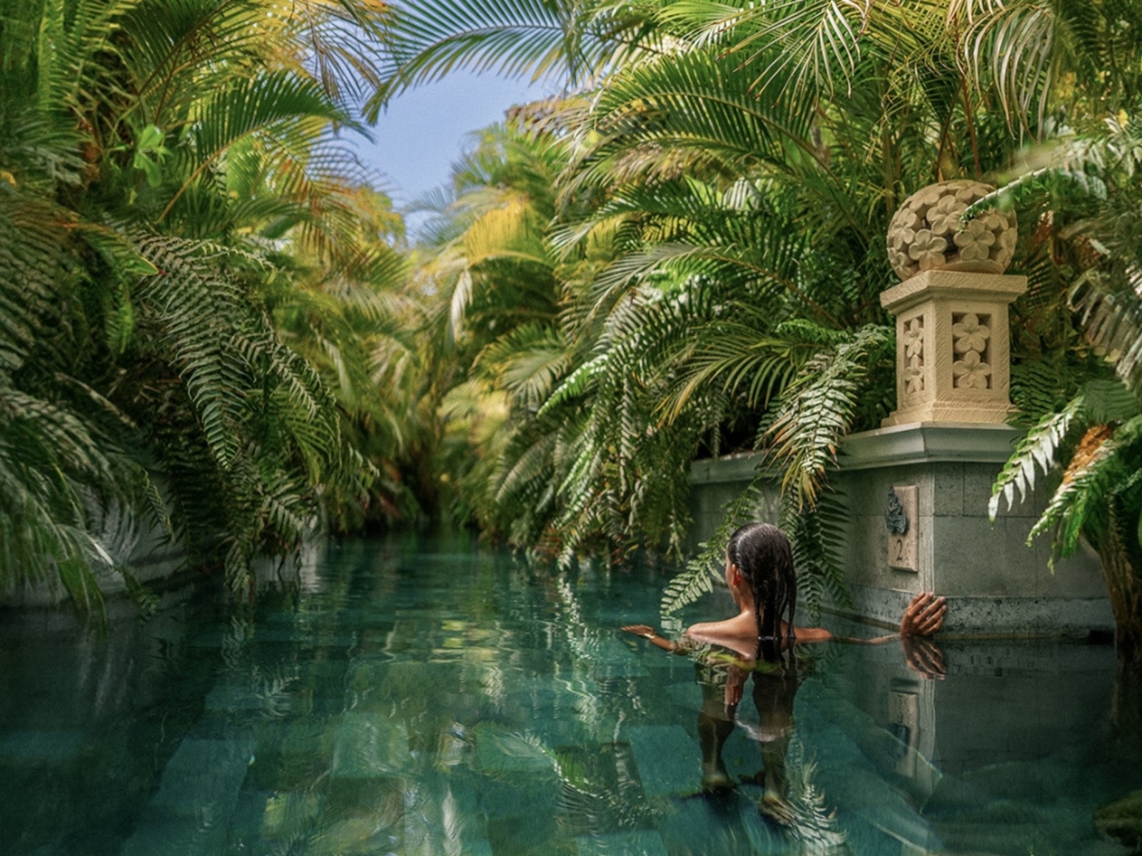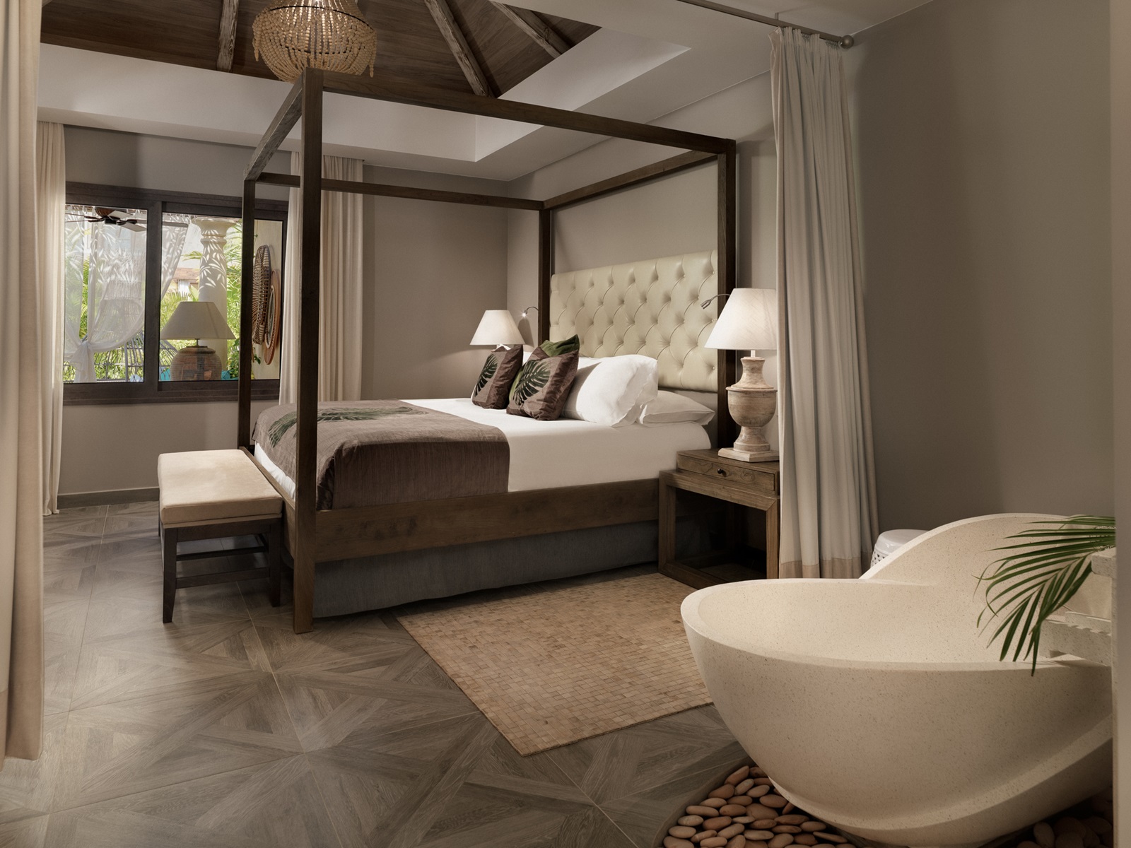 River Villas (120 m²) avec séjour et chambre à coucher séparée, terrasse spacieuse avec lounge, lit balinais et piscine swim-up avec accès direct à la rivière