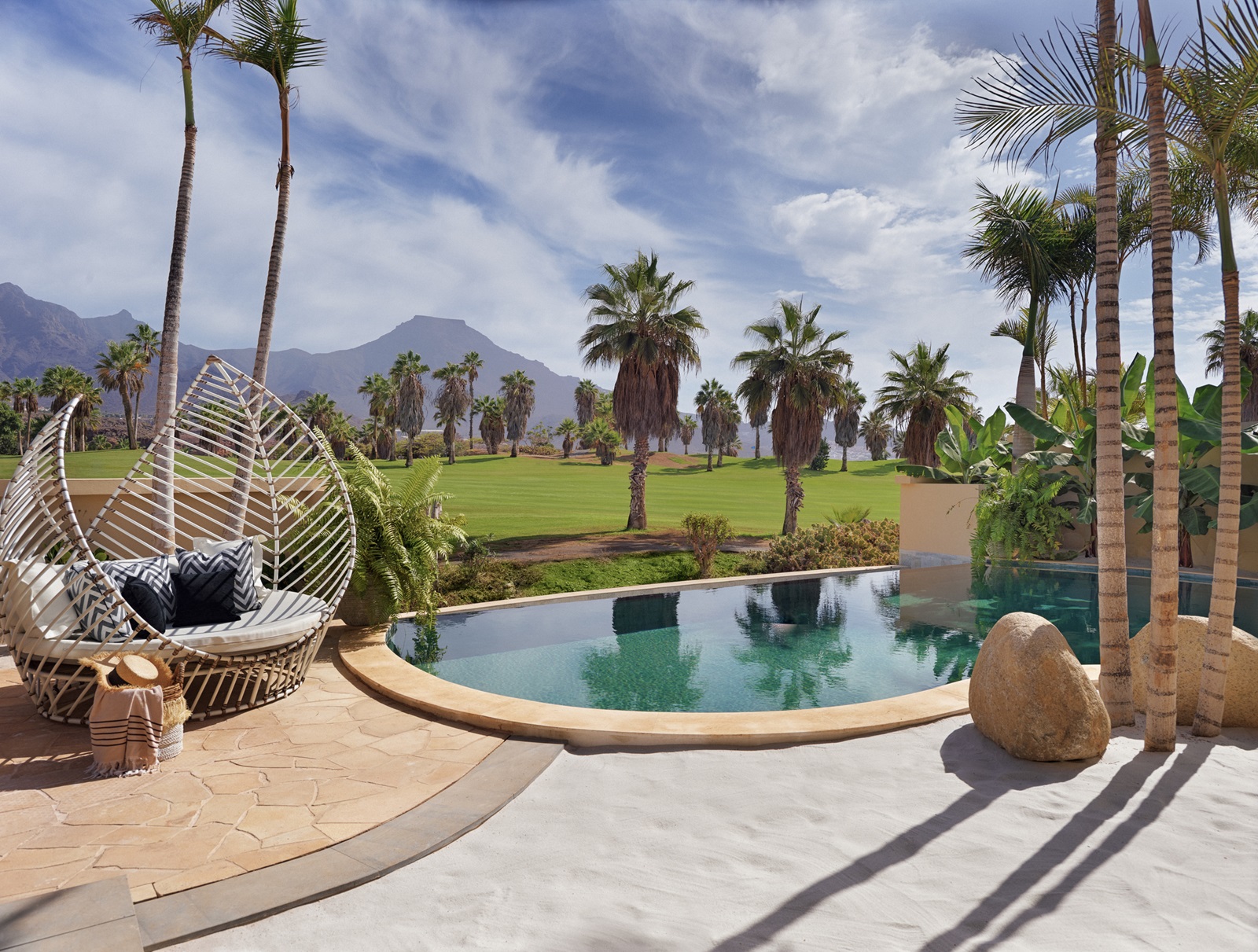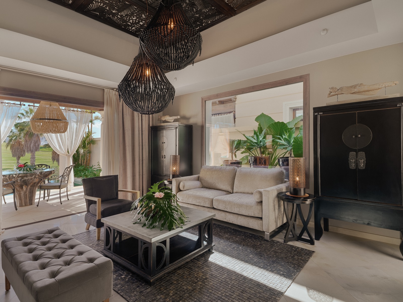 Grand Pool Villas (140 m²) avec séjour, chambre à coucher séparée, terrasse avec lounge, piscine privée et vue sur le terrain de golf