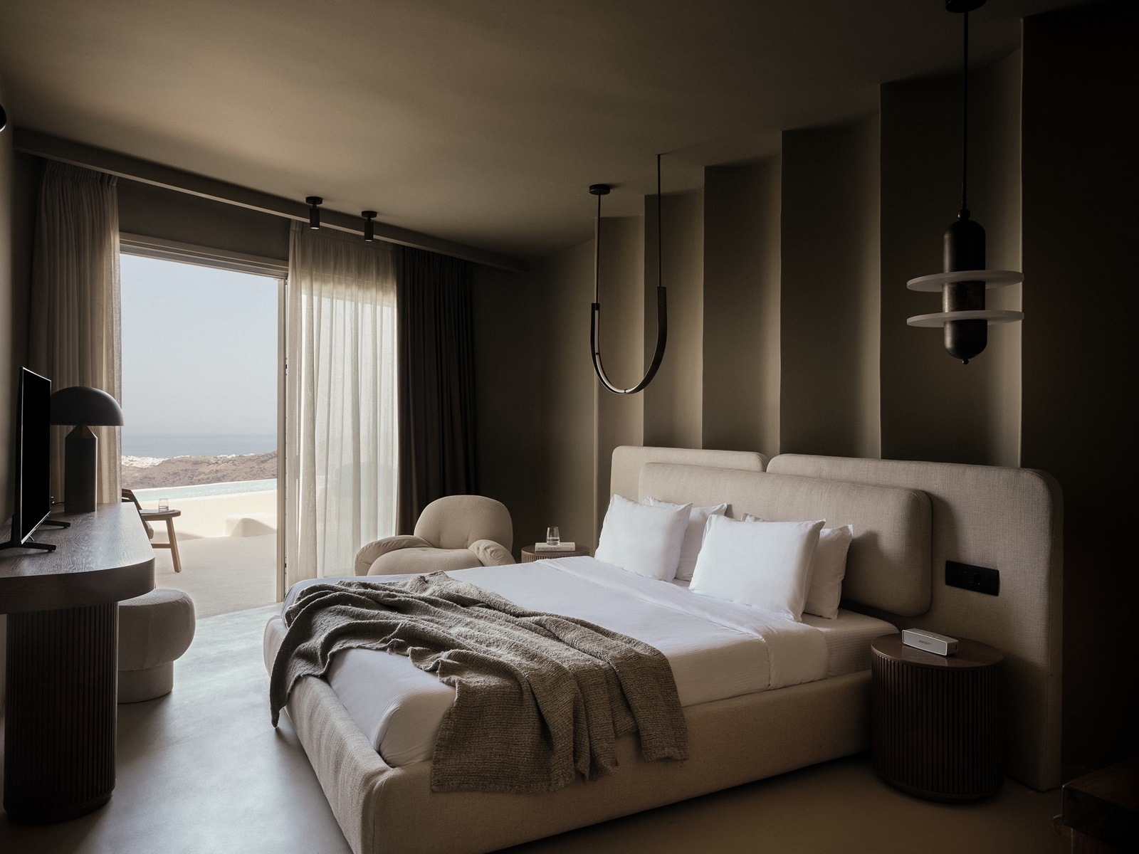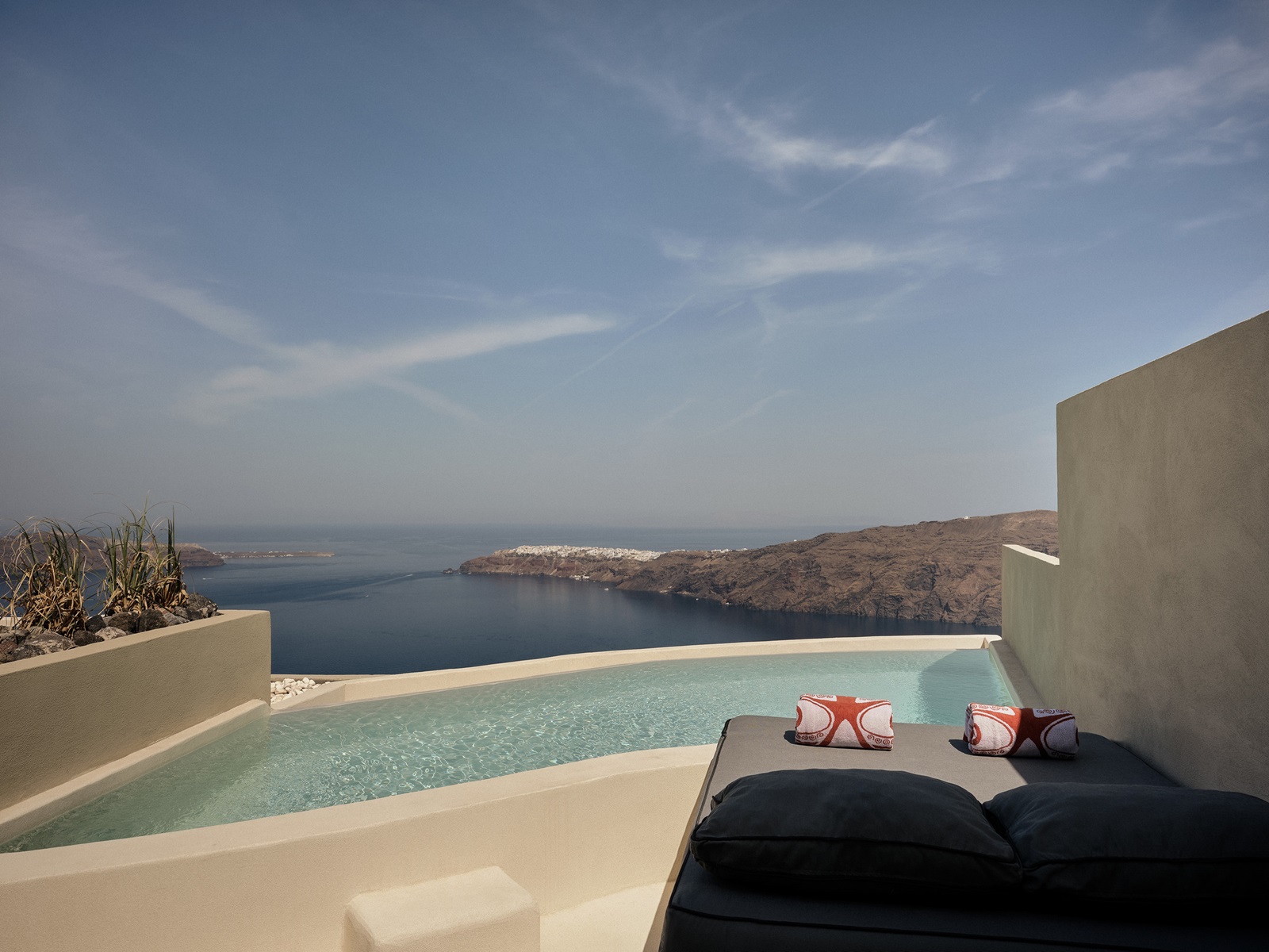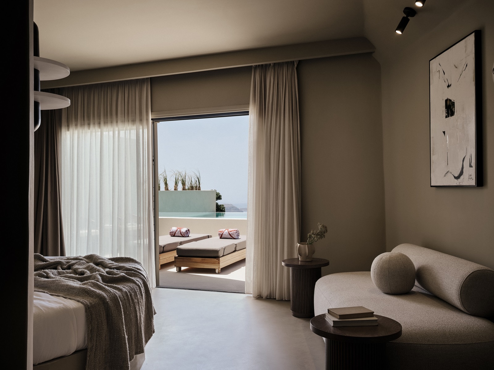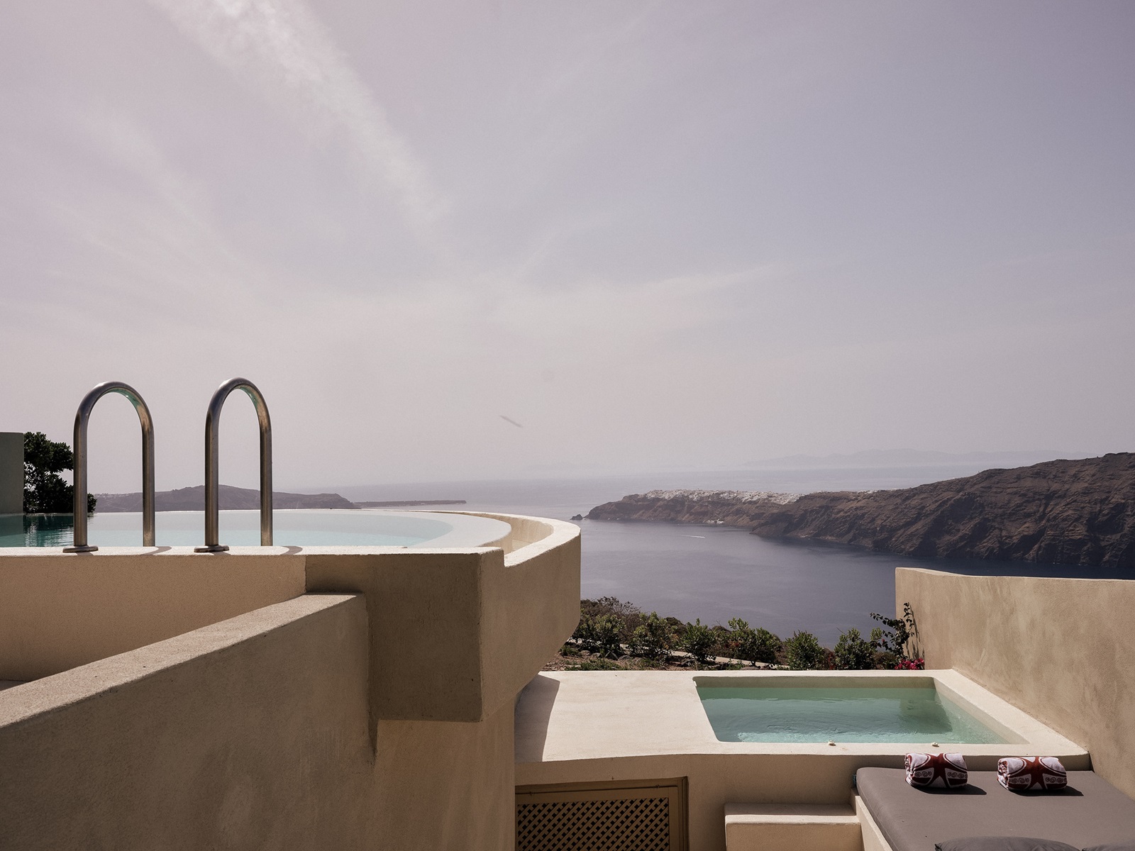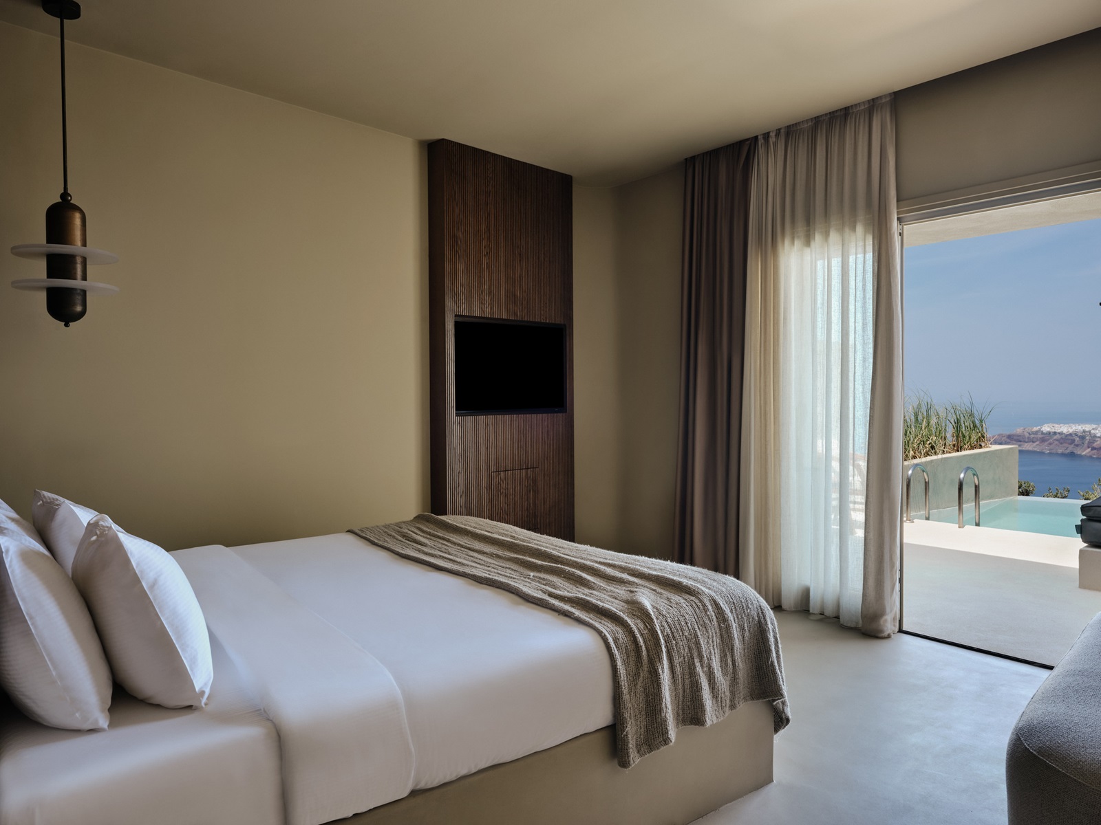 toutes les suites et villas ont un intérieur minimaliste combinant le style traditionnel de Santorin avec des touches claires et contemporaines et sont équipées d'une douche, sèche-cheveux, sortie de bain et pantoufles, climatisation, coffre-fort, téléphone, TV à écran plat, service d'oreillers, appareil Nespresso®, percolateur à café et à thé, minibar (€), coffre-fort et terrasse avec piscine privée chauffée