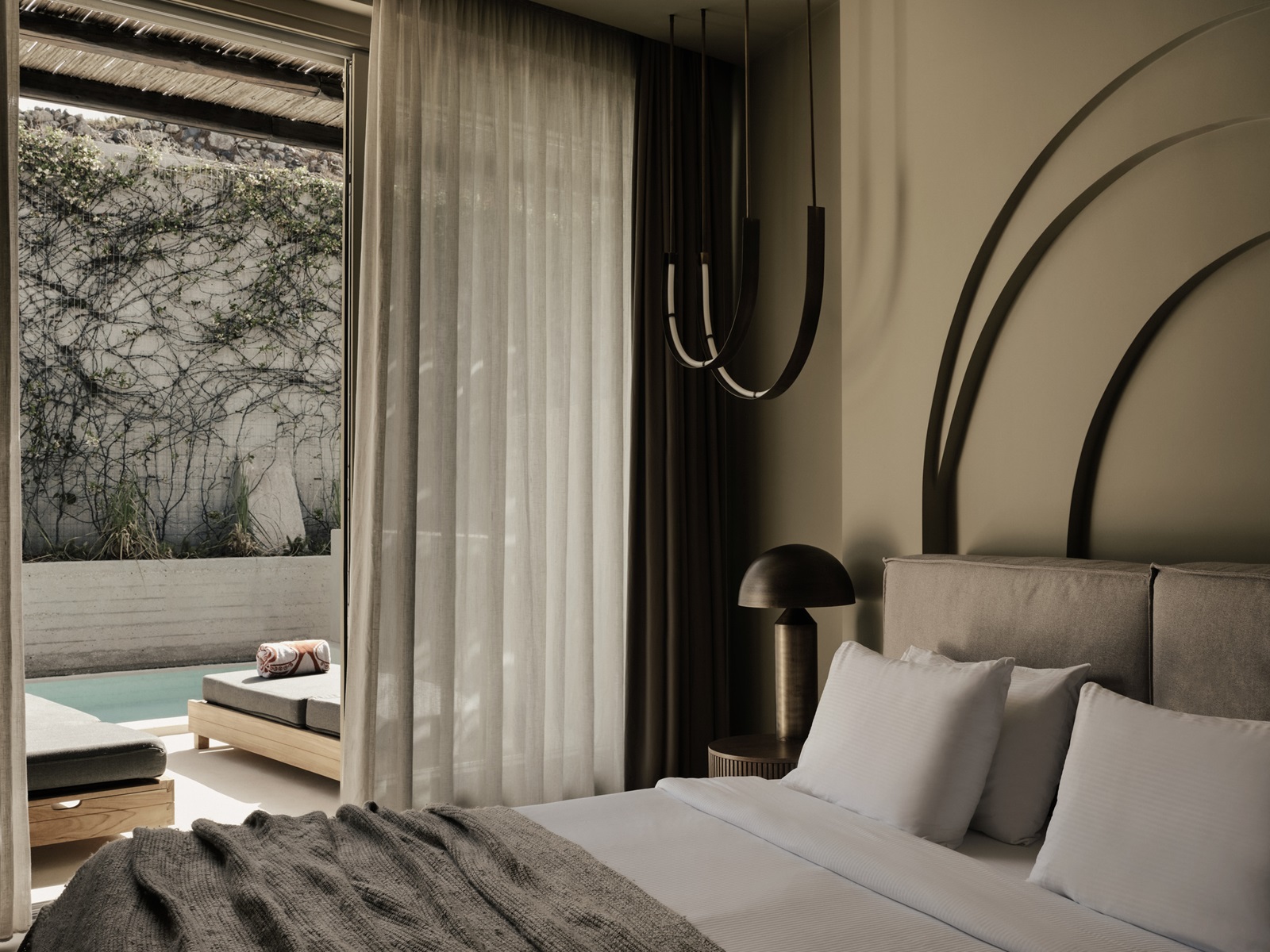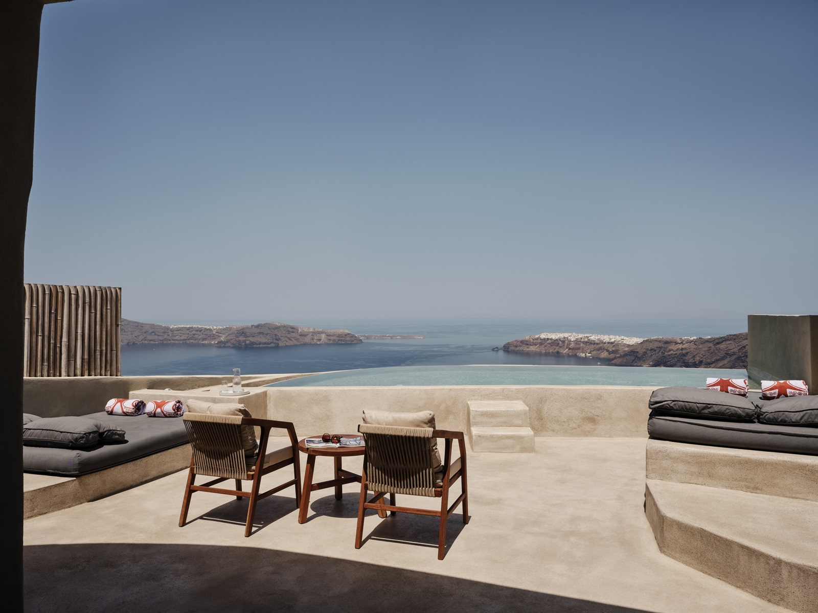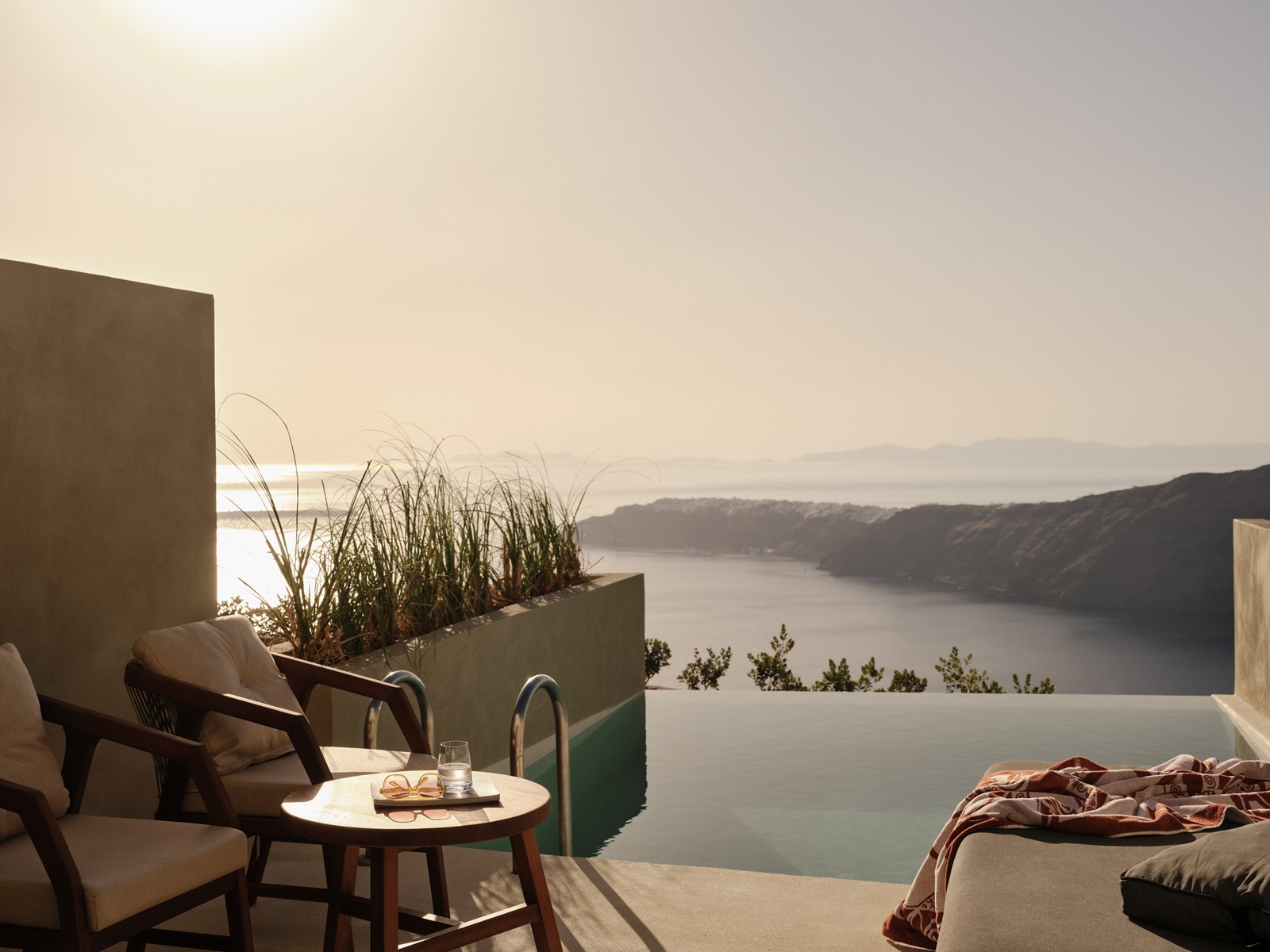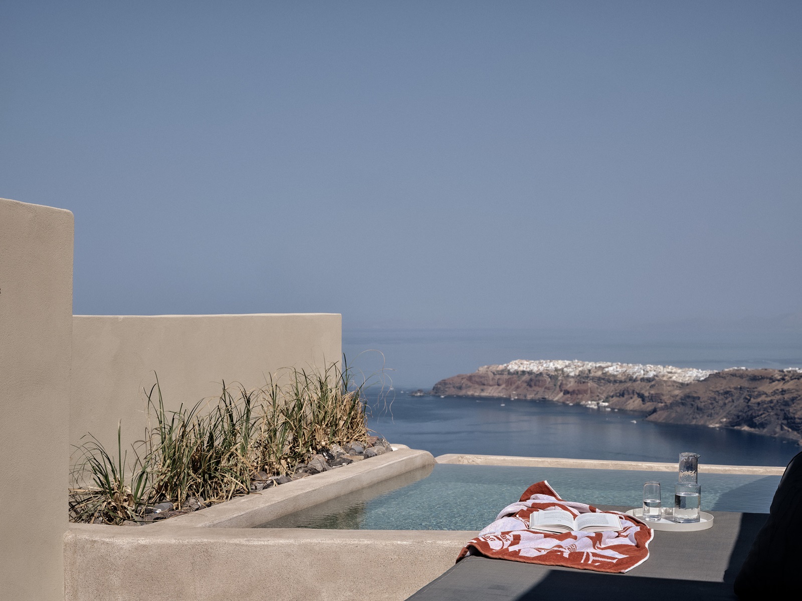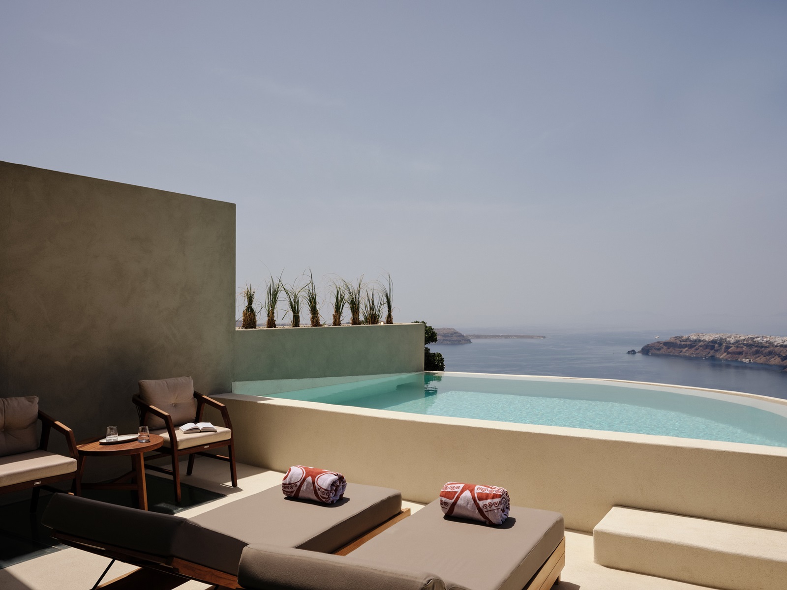 toutes les suites et villas ont un intérieur minimaliste combinant le style traditionnel de Santorin avec des touches claires et contemporaines et sont équipées d'une douche, sèche-cheveux, sortie de bain et pantoufles, climatisation, coffre-fort, téléphone, TV à écran plat, service d'oreillers, appareil Nespresso®, percolateur à café et à thé, minibar (€), coffre-fort et terrasse avec piscine privée chauffée