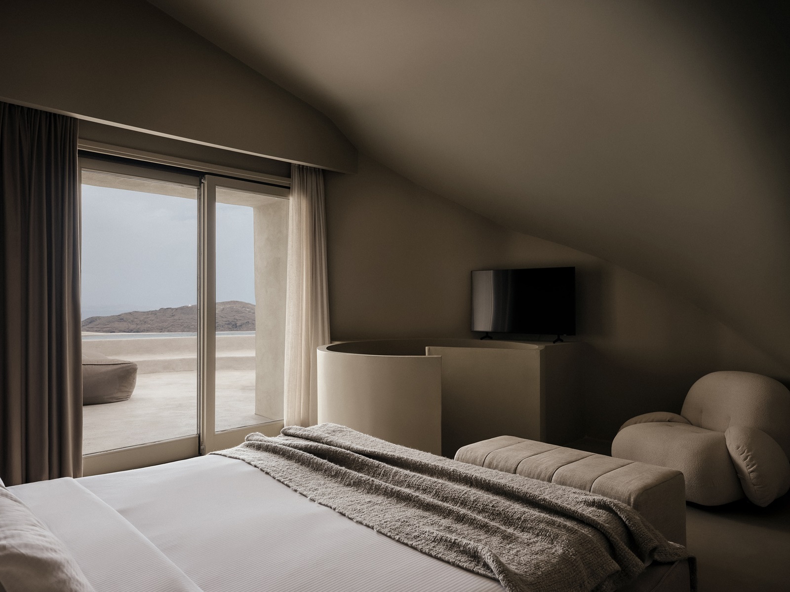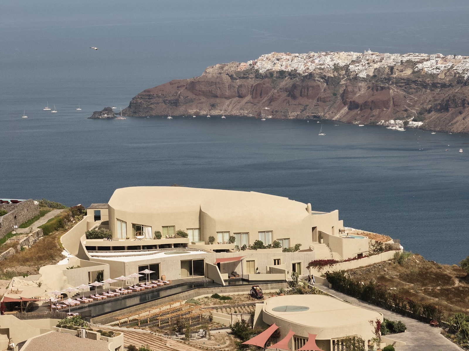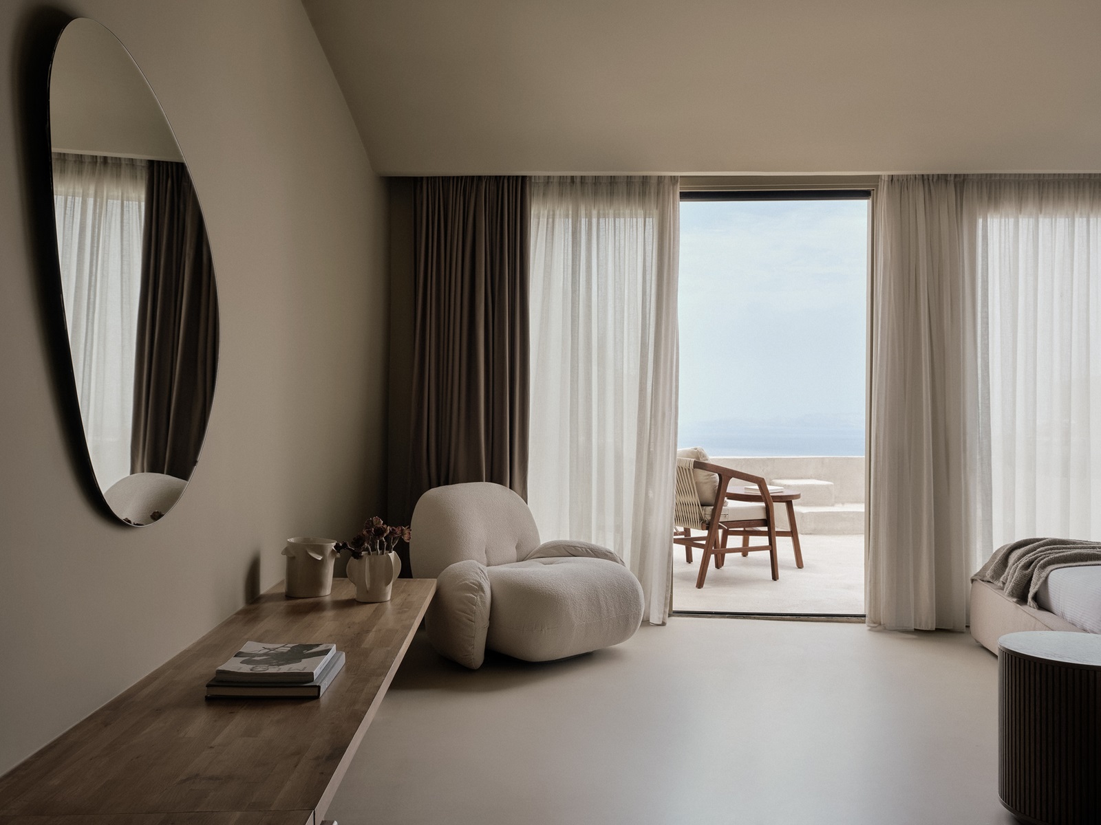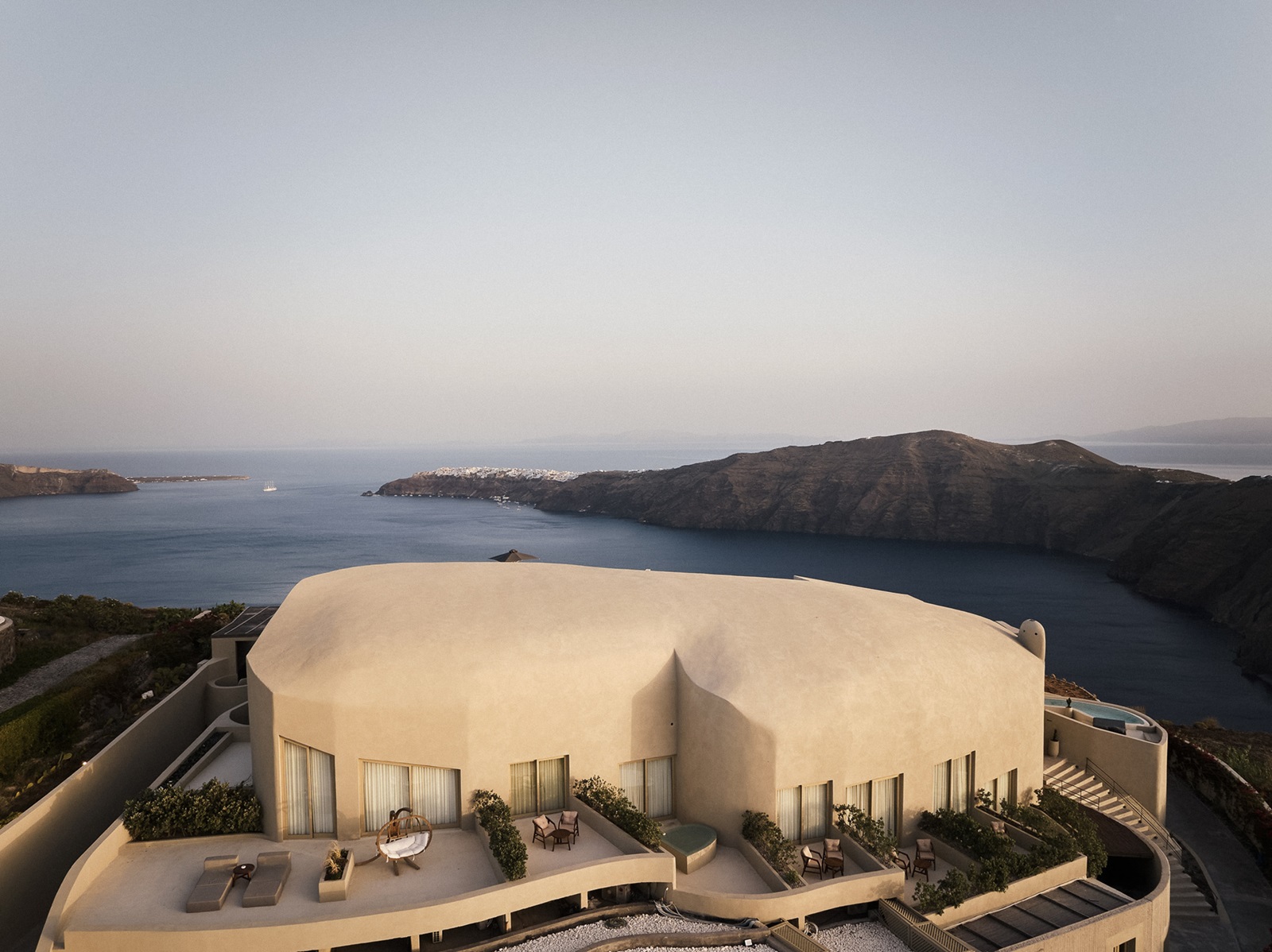 toutes les suites et villas ont un intérieur minimaliste combinant le style traditionnel de Santorin avec des touches claires et contemporaines et sont équipées d'une douche, sèche-cheveux, sortie de bain et pantoufles, climatisation, coffre-fort, téléphone, TV à écran plat, service d'oreillers, appareil Nespresso®, percolateur à café et à thé, minibar (€), coffre-fort et terrasse avec piscine privée chauffée