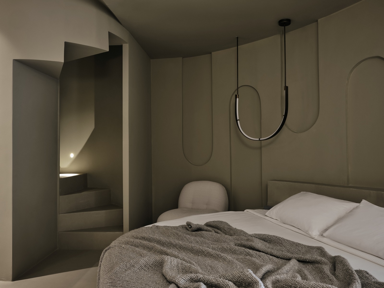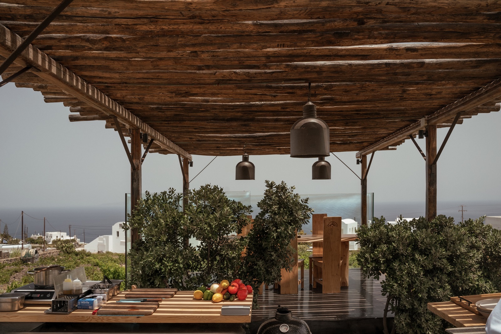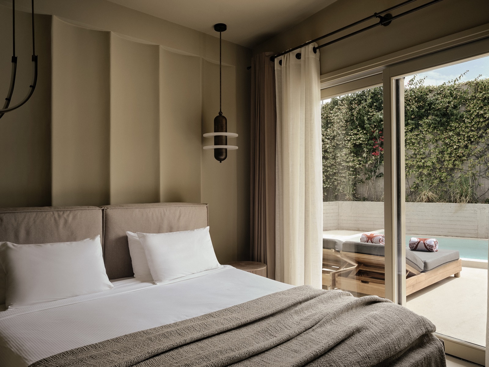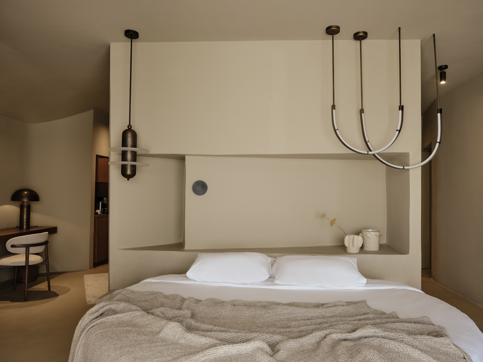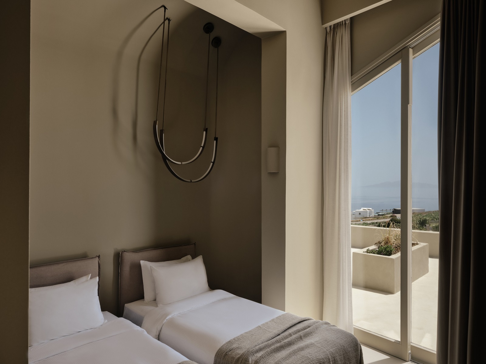 toutes les suites et villas ont un intérieur minimaliste combinant le style traditionnel de Santorin avec des touches claires et contemporaines et sont équipées d'une douche, sèche-cheveux, sortie de bain et pantoufles, climatisation, coffre-fort, téléphone, TV à écran plat, service d'oreillers, appareil Nespresso®, percolateur à café et à thé, minibar (€), coffre-fort et terrasse avec piscine privée chauffée