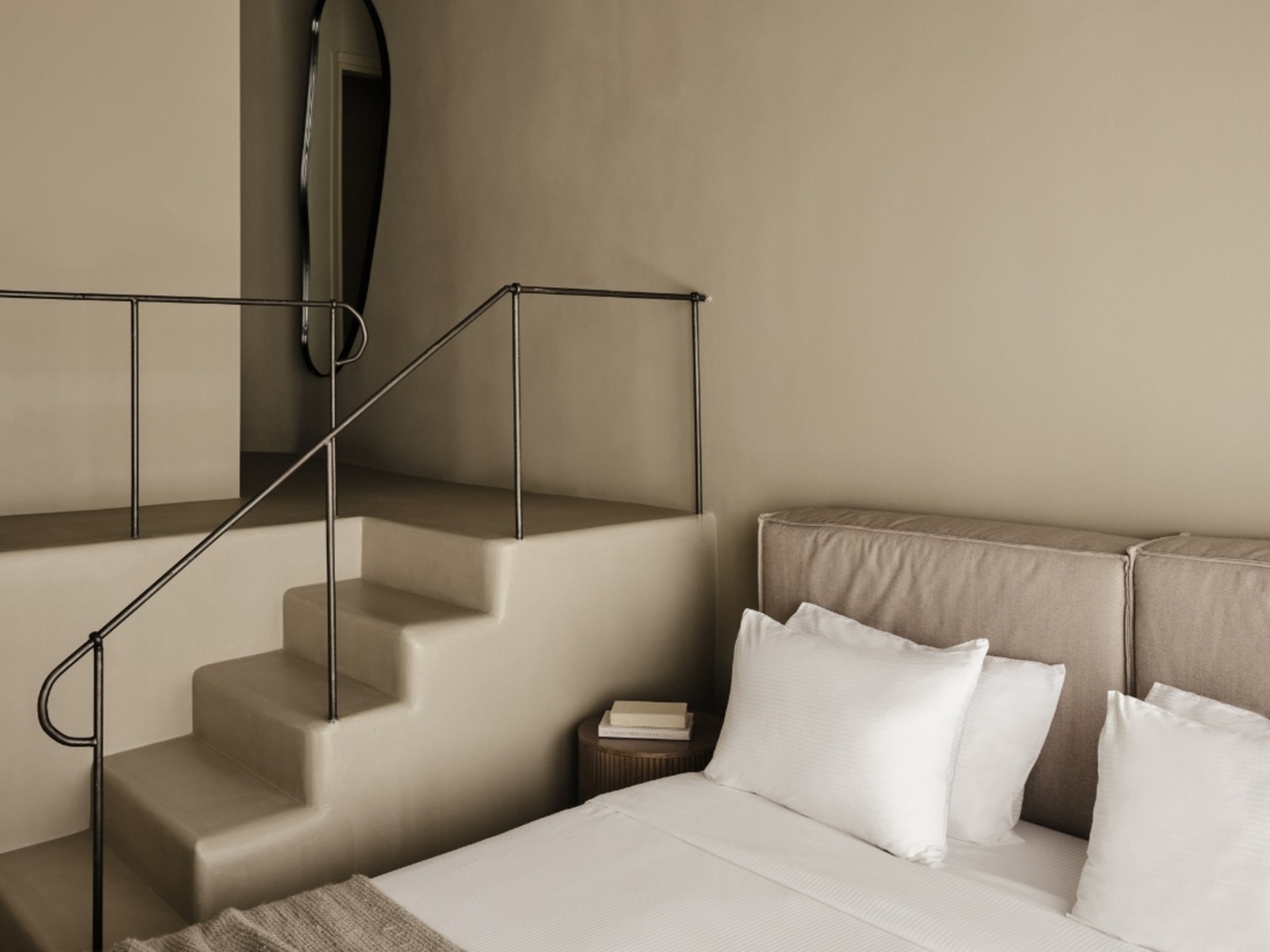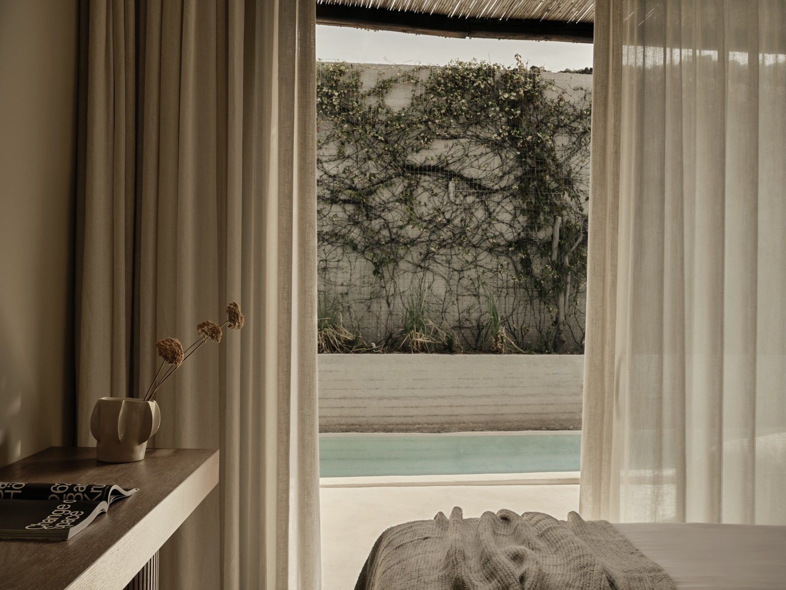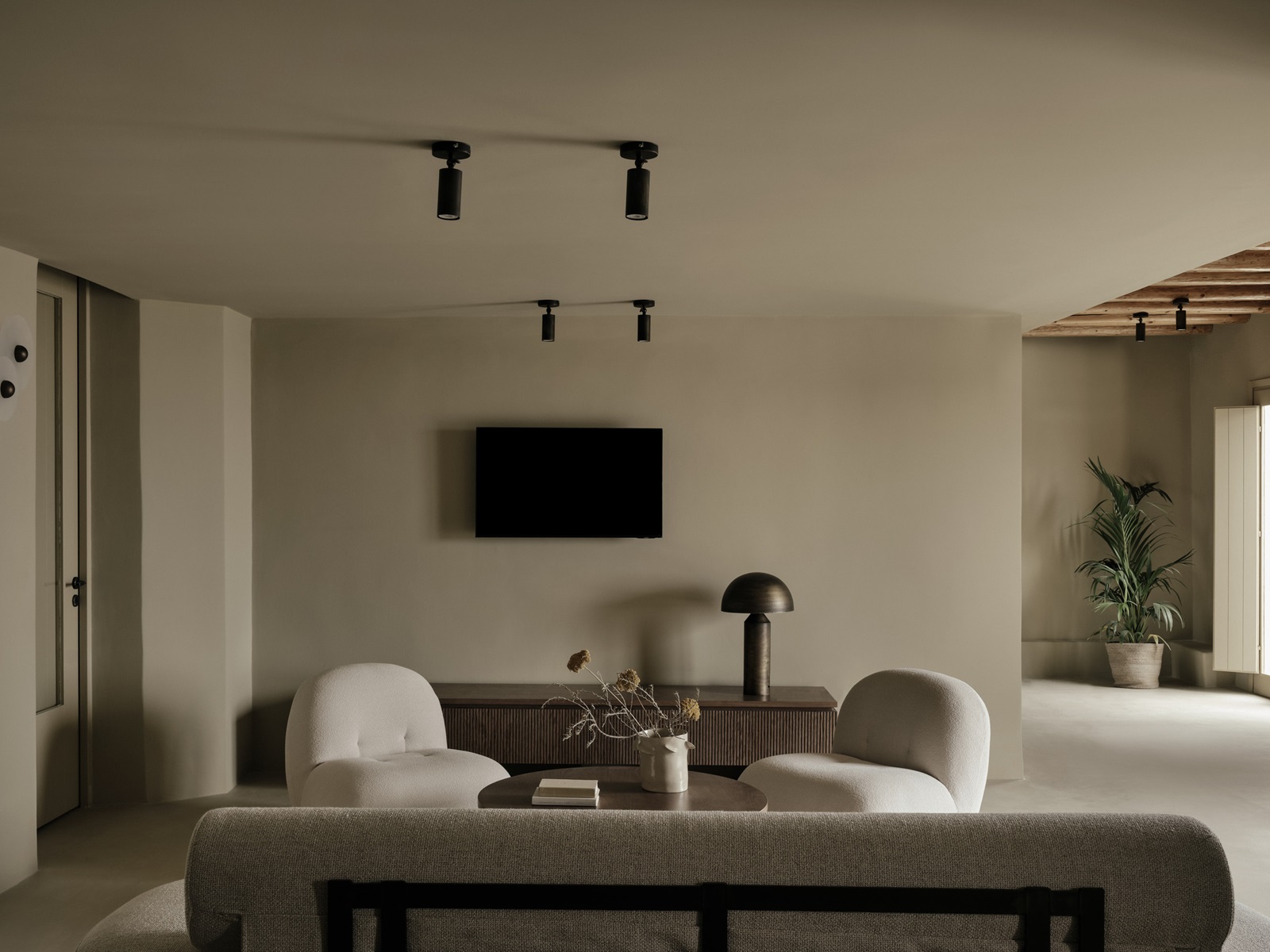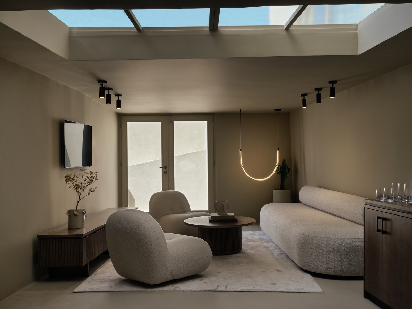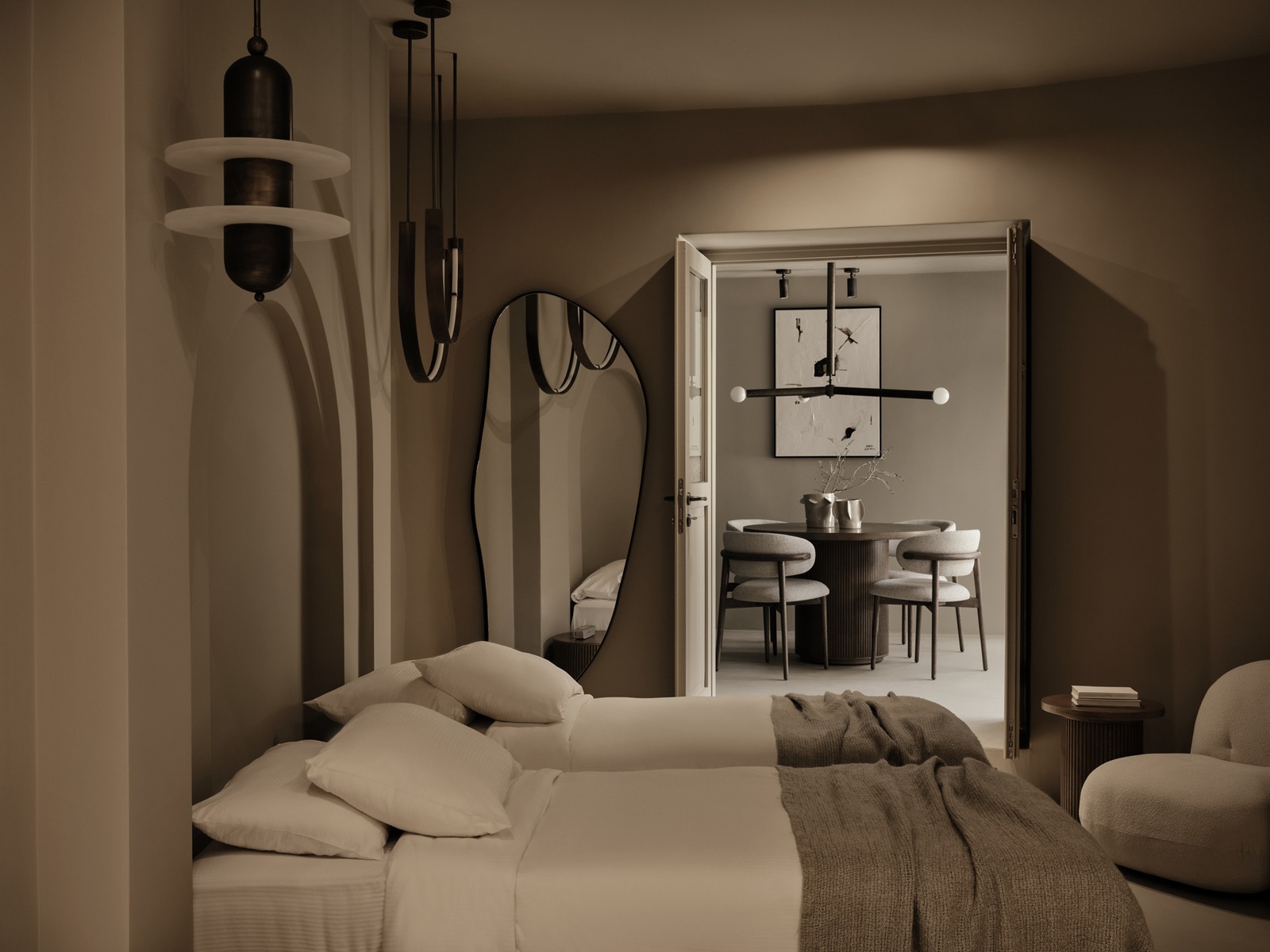 toutes les suites et villas ont un intérieur minimaliste combinant le style traditionnel de Santorin avec des touches claires et contemporaines et sont équipées d'une douche, sèche-cheveux, sortie de bain et pantoufles, climatisation, coffre-fort, téléphone, TV à écran plat, service d'oreillers, appareil Nespresso®, percolateur à café et à thé, minibar (€), coffre-fort et terrasse avec piscine privée chauffée