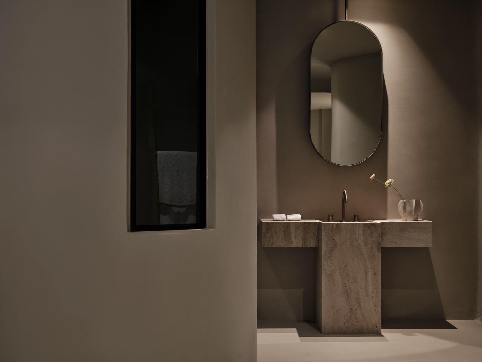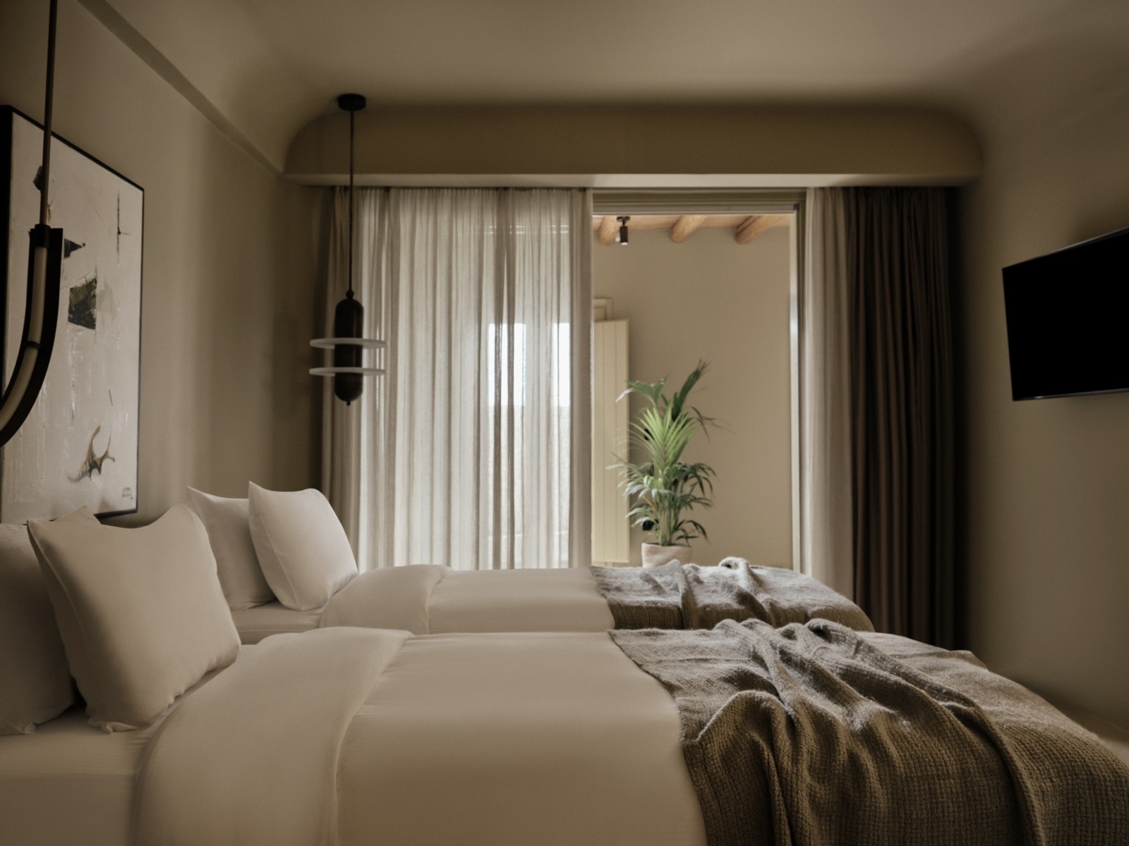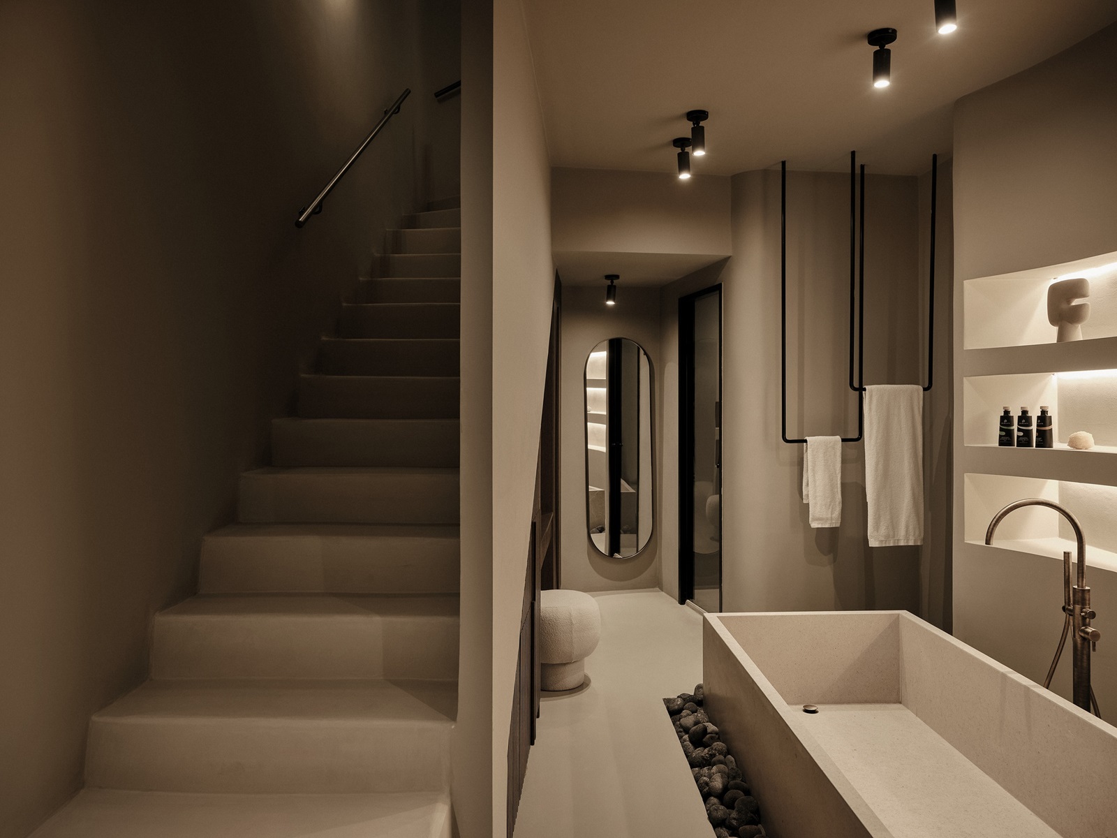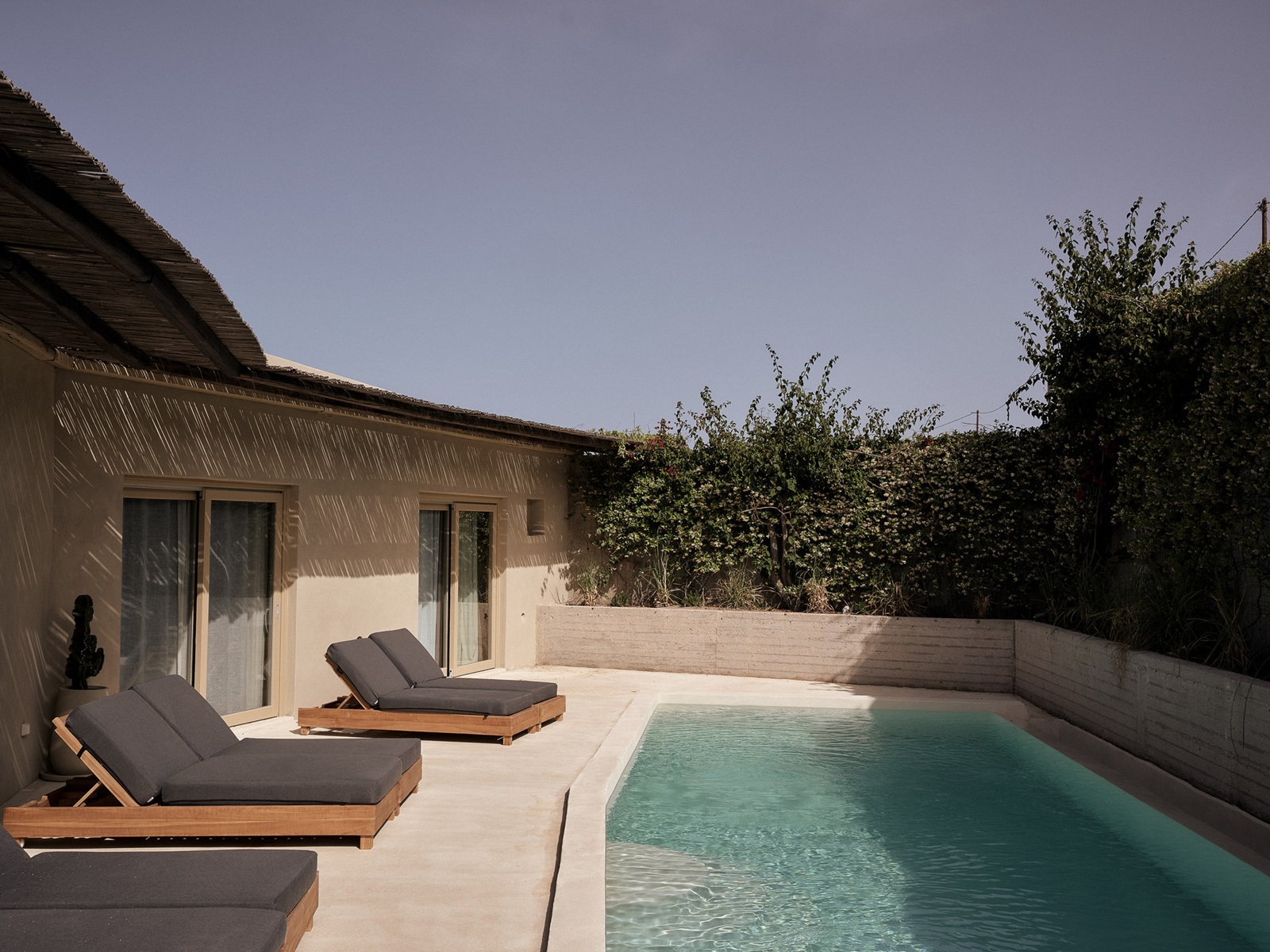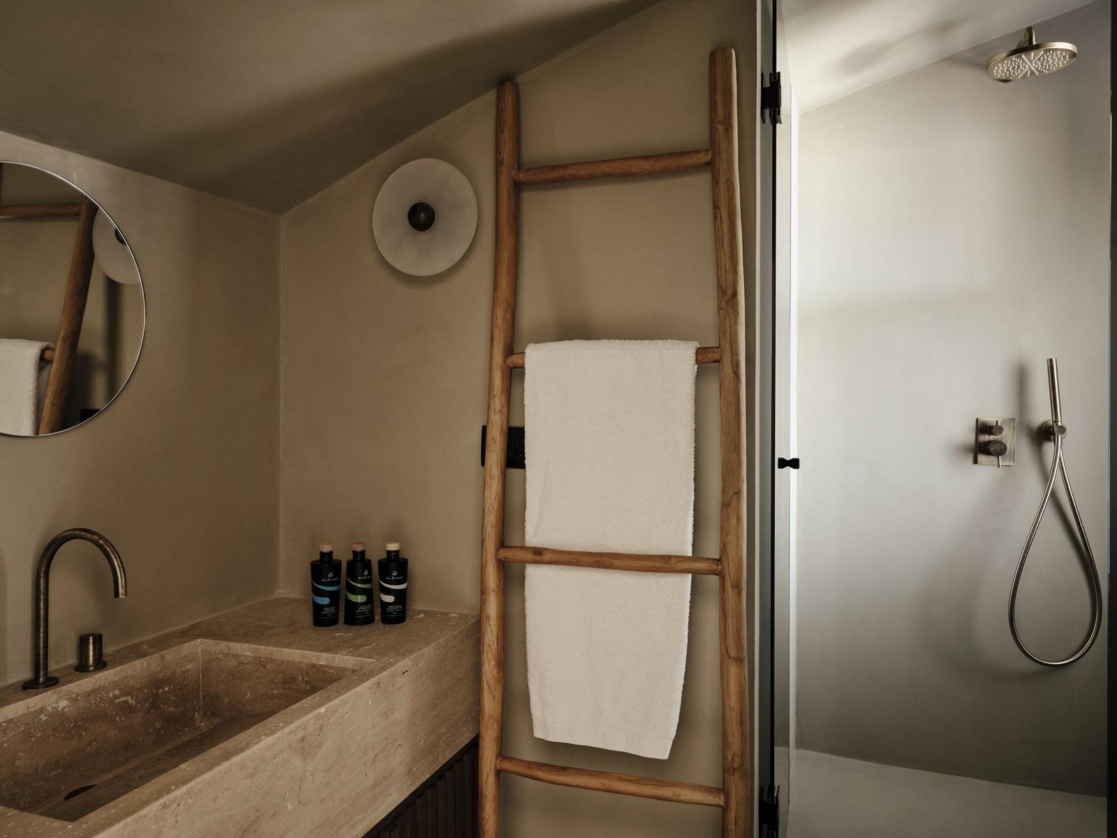 toutes les suites et villas ont un intérieur minimaliste combinant le style traditionnel de Santorin avec des touches claires et contemporaines et sont équipées d'une douche, sèche-cheveux, sortie de bain et pantoufles, climatisation, coffre-fort, téléphone, TV à écran plat, service d'oreillers, appareil Nespresso®, percolateur à café et à thé, minibar (€), coffre-fort et terrasse avec piscine privée chauffée