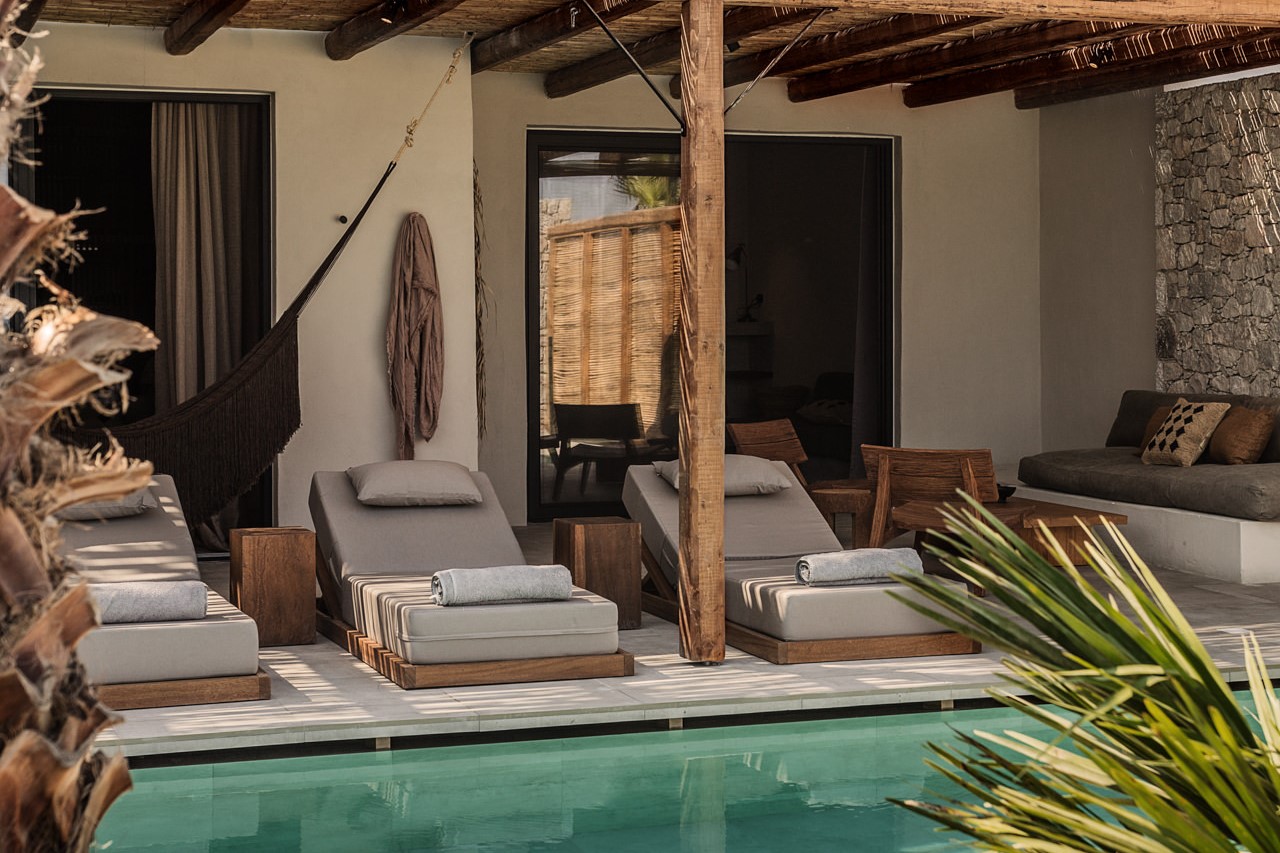 suites villas (100 m²) avec 2 chambres à coucher, séjour, terrasse avec chaises longues, piscine privée et vue mer