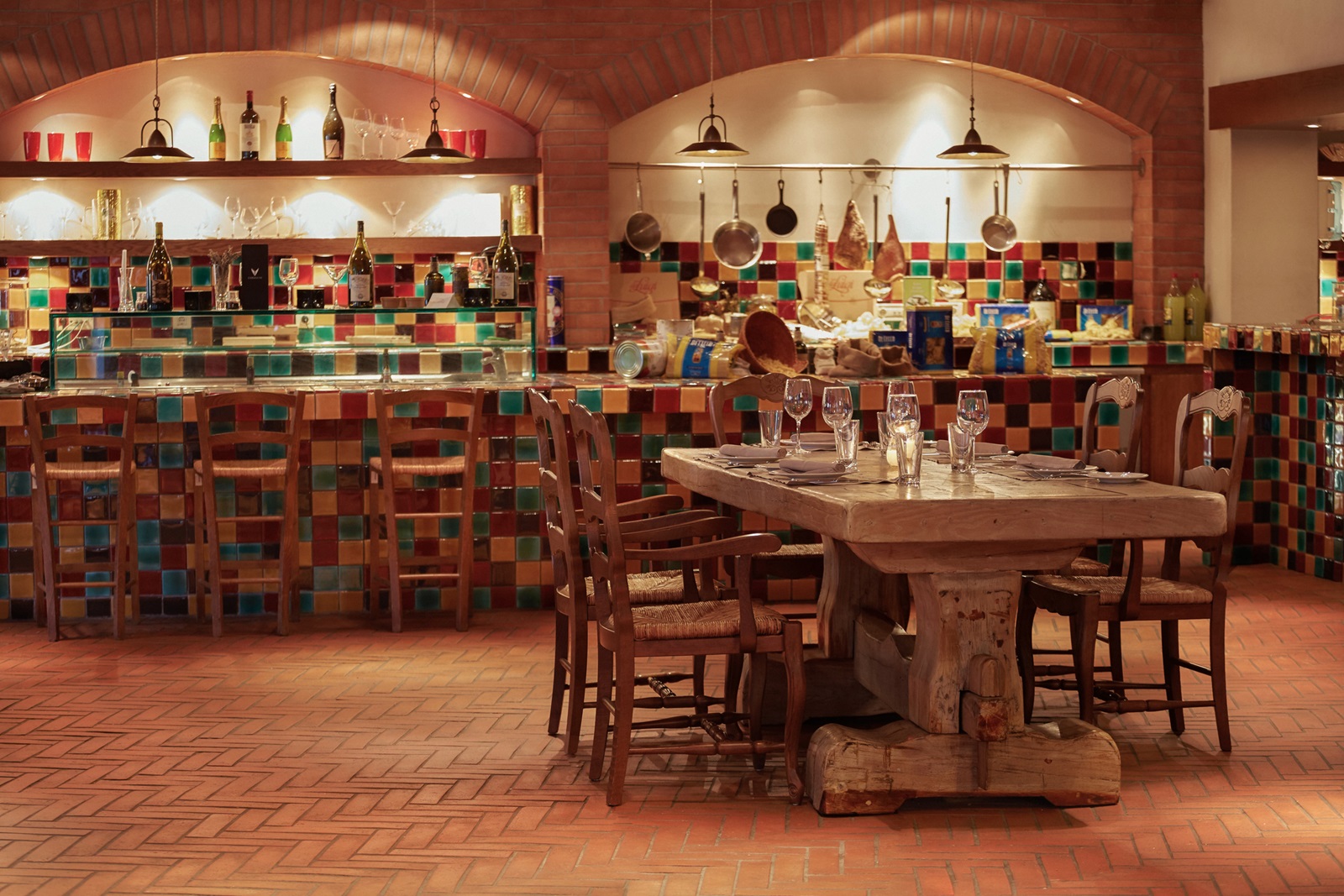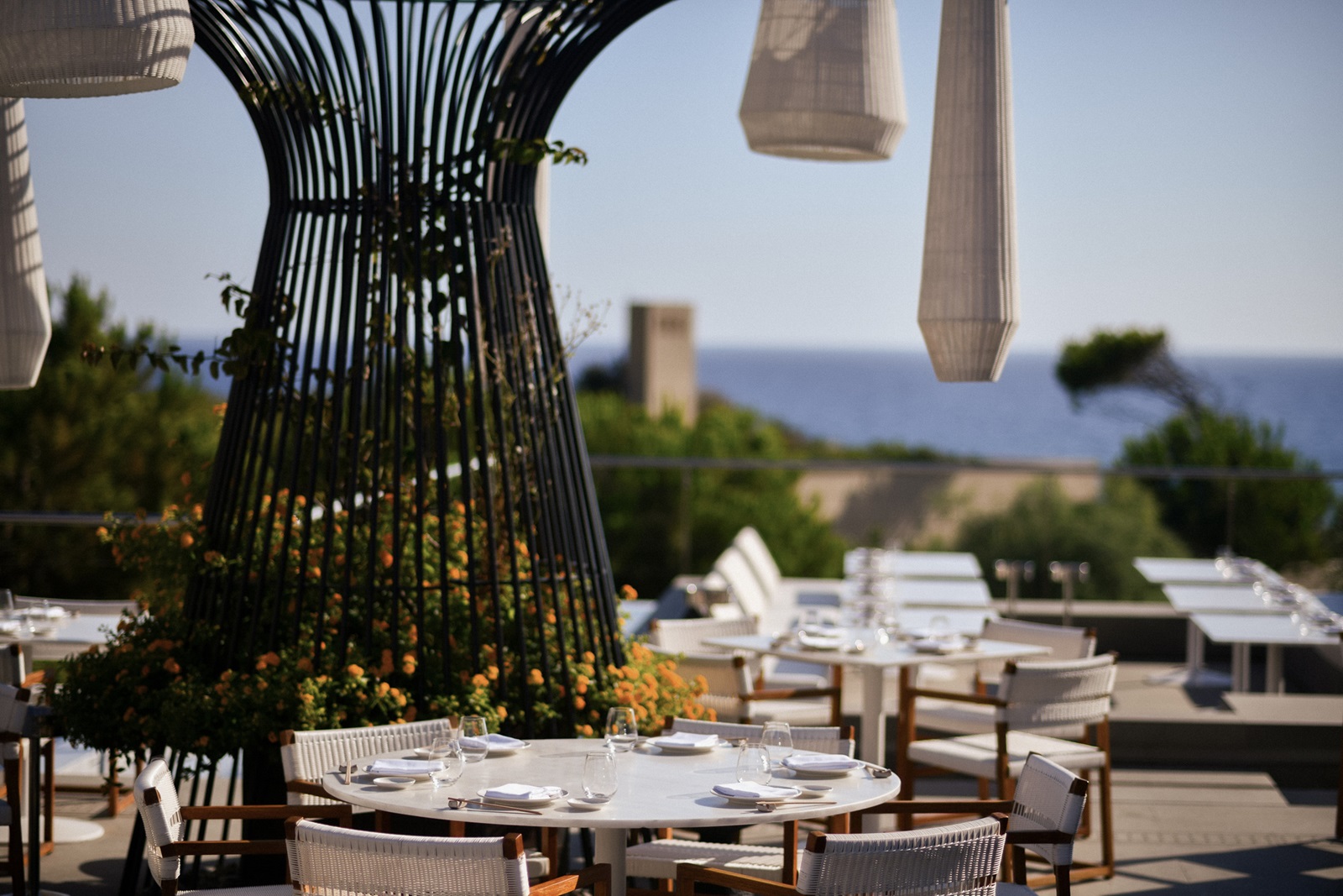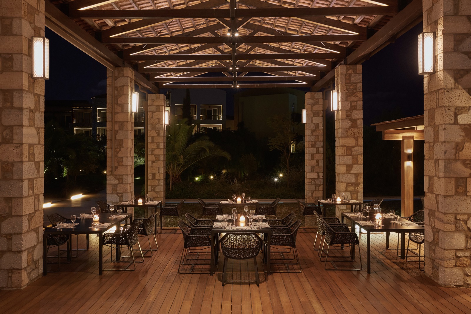 large choix de restaurants à la carte : ‘Flame' au Dunes Clubhouse (grill), ‘Barbouni' à la plage (restaurant unique servant du poisson frais, fruits de mer et cuisine méditerranéenne), ‘Da Luigi' (à l'Agora, cuisine italienne authentique et pizzas), ''Parafrasi By CTC' (cuisine raffinée et réconfortante, préparée avec les meilleurs ingrédients et produits de Messénie et réinventée avec une vision créative par le restaurant étoilé CTC et le célèbre chef Alexandros Tsiotinis), ‘Onuki' (à l'Agora, excellente cuisine japonaise et fruits de mer), ‘Nargile’ (à l'Agora, cuisine libanaise), ‘Souvlakeri’ (à l'Agora, souvlaki et pita grecs traditionnels), ‘Armyra’ (au The Romanos Pool, cuisine gastronomique unique à base de poissons locaux, fruits de mer et cuisine grecque) et ‘Division 16’ (au centre de divertissement, cuisine américaine)