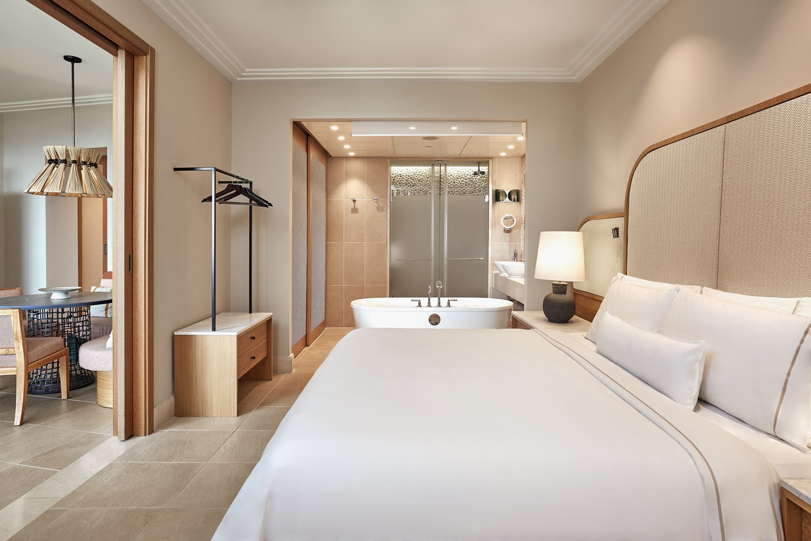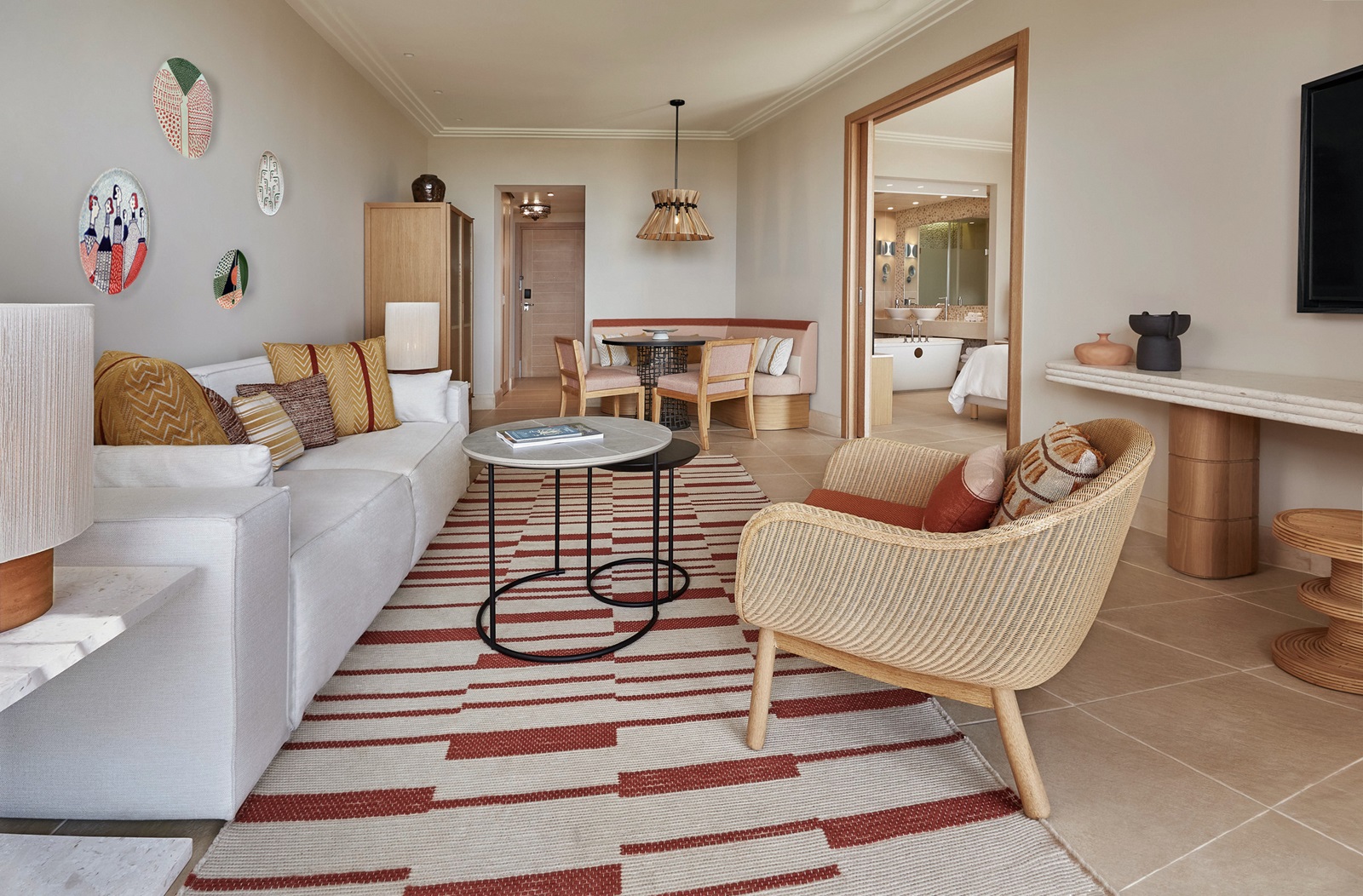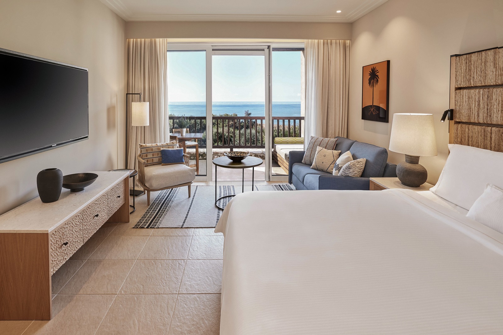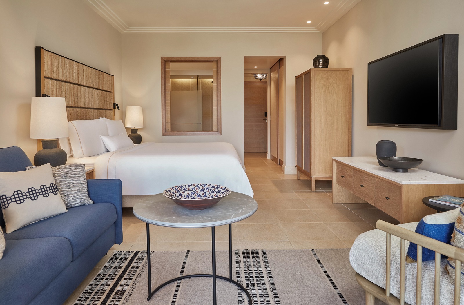 toutes les chambres spacieuses (avec des accents de bois clair et des couleurs sable) disposent d'une salle de bain (baignoire, douche séparée, sèche-cheveux), télévision à écran plat, climatisation, coffre-fort, machine Nespresso, wifi (gratuite), minibar (€) et balcon ou terrasse. Toutes les chambres et suites seront magnifiquement rénovées et opérationneles pour la saison 2025
