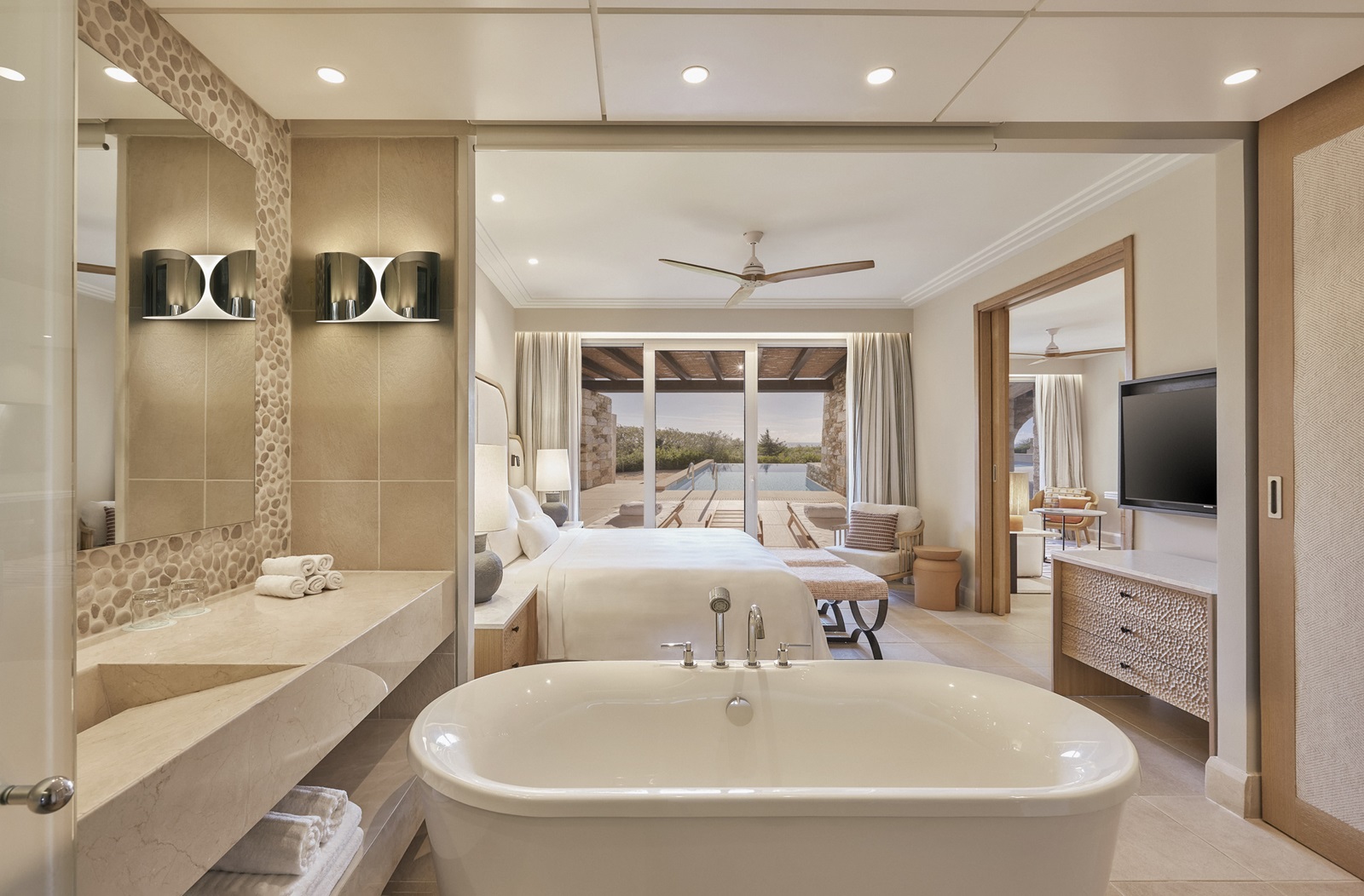 suites infinity premium vue mer (70-80 m²) comprenant une chambre spacieuse avec salle de bain ouverte, une deuxième salle de bain (avec douche), salon spacieux (avec canapé-lit double) et une terrasse avec piscine privée à débordement et vue mer frontale