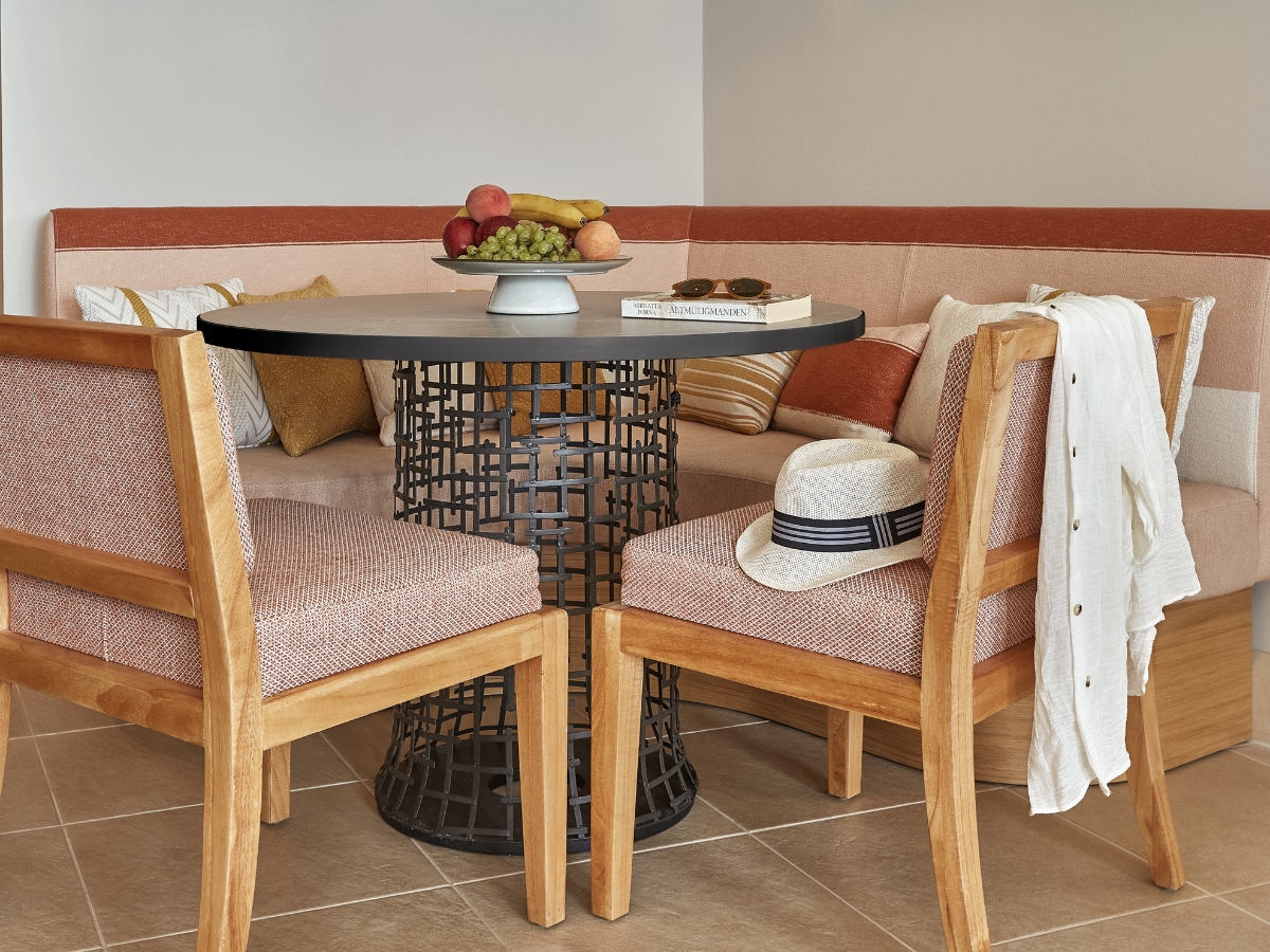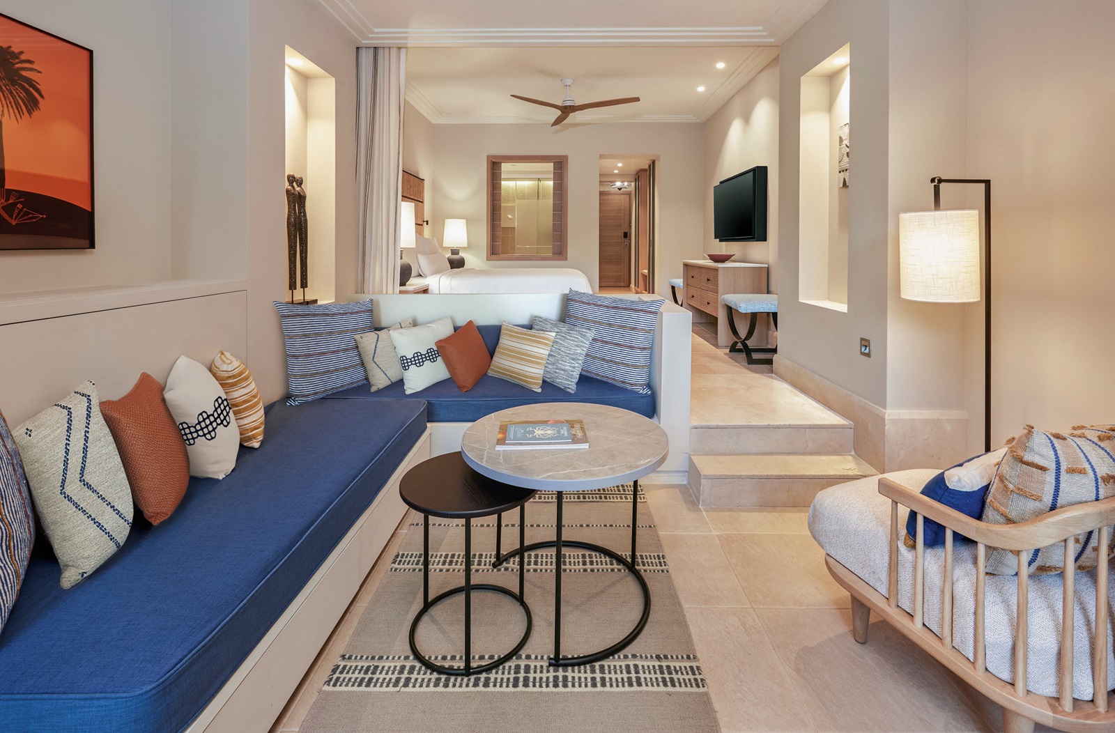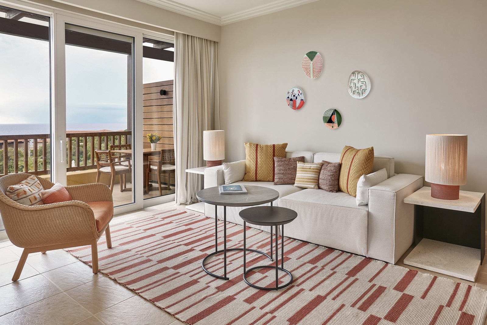 suites familiales vue jardin (70-80 m²) avec chambre spacieuse avec salle de bain ouverte, 2ème salle de bain (avec douche), salon spacieux et terrasse avec vue resort et jardin