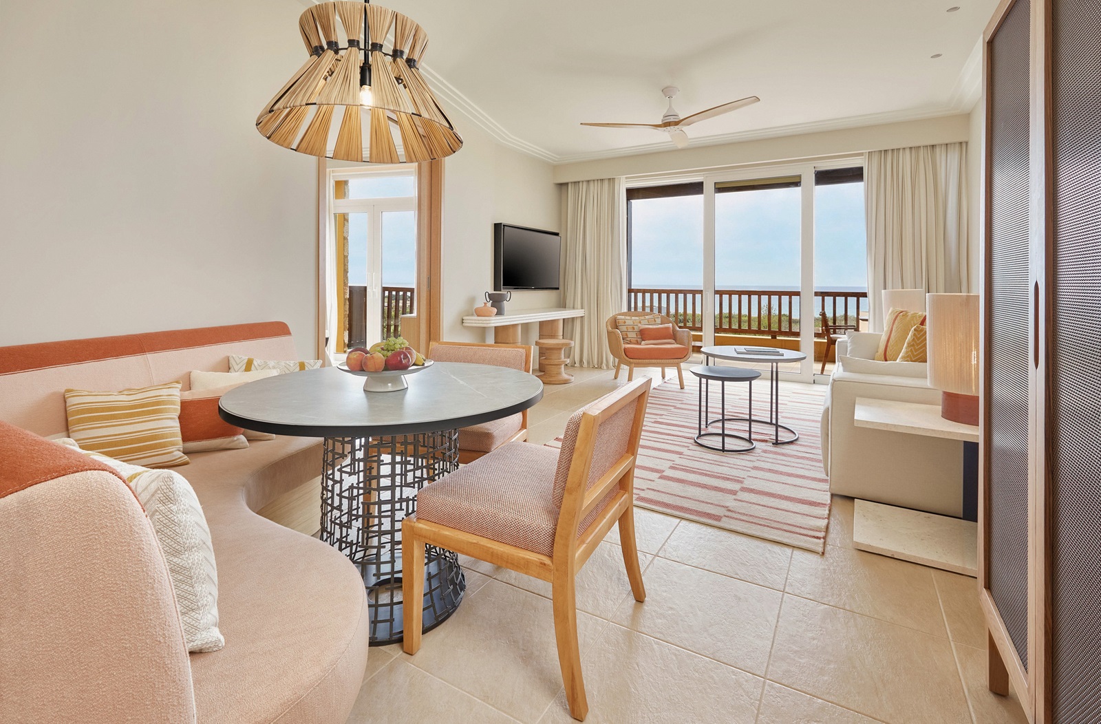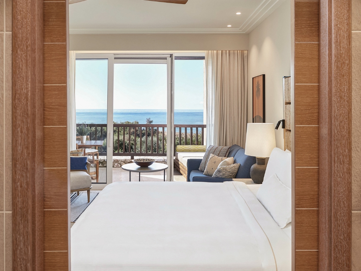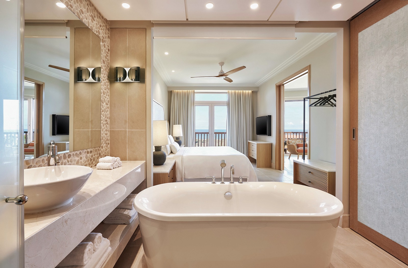 suites premium vue mer (70-80 m²) avec chambre spacieuse avec salle de bain ouverte, 2ème salle de bain (avec douche), salon spacieux (avec canapé-lit double) et terrasse avec vue mer frontale