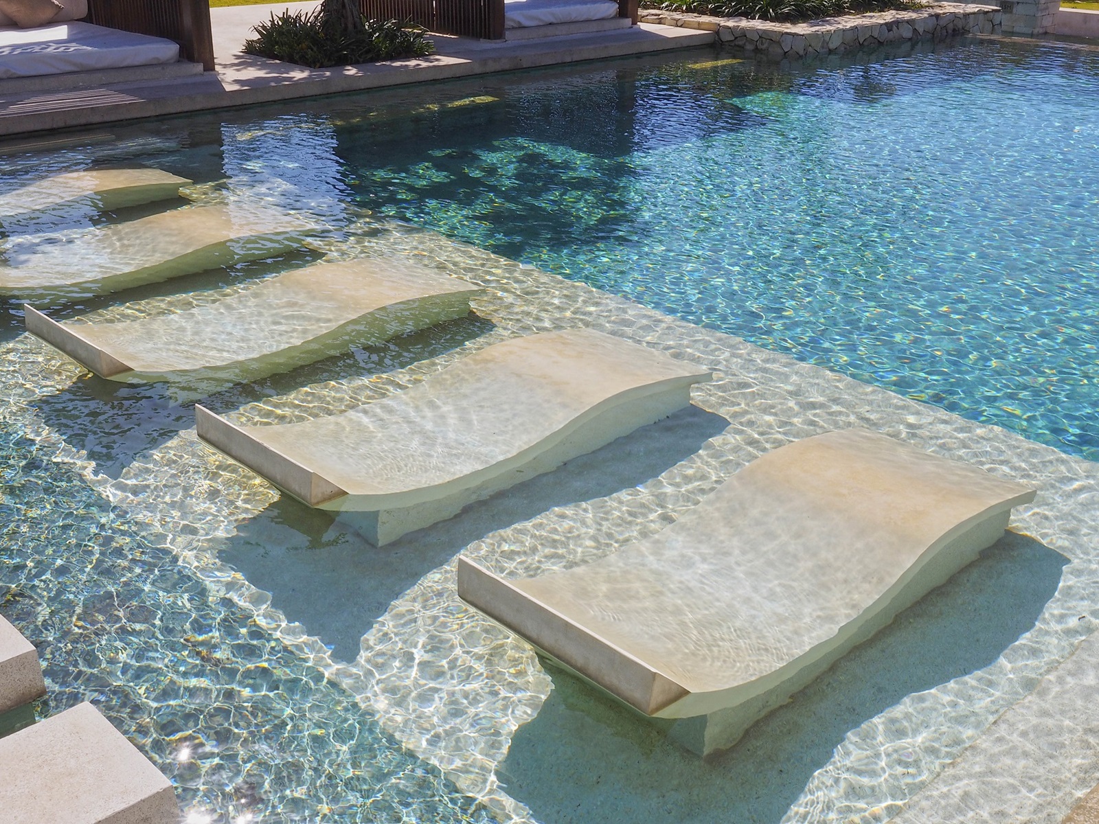 toutes les pavillons disposent d'une bain pour 2, douche (intérieure et extérieure), TV-satellite, téléphone, sèche-cheveux, wifi, minibar (€), percolateur à café/thé, coffre-fort, climatisation individuelle, terrasse spacieuse et piscine privée