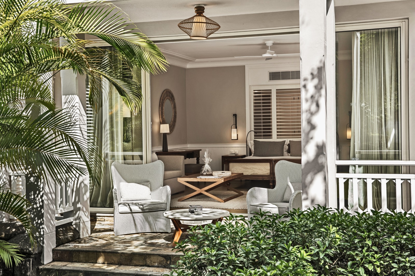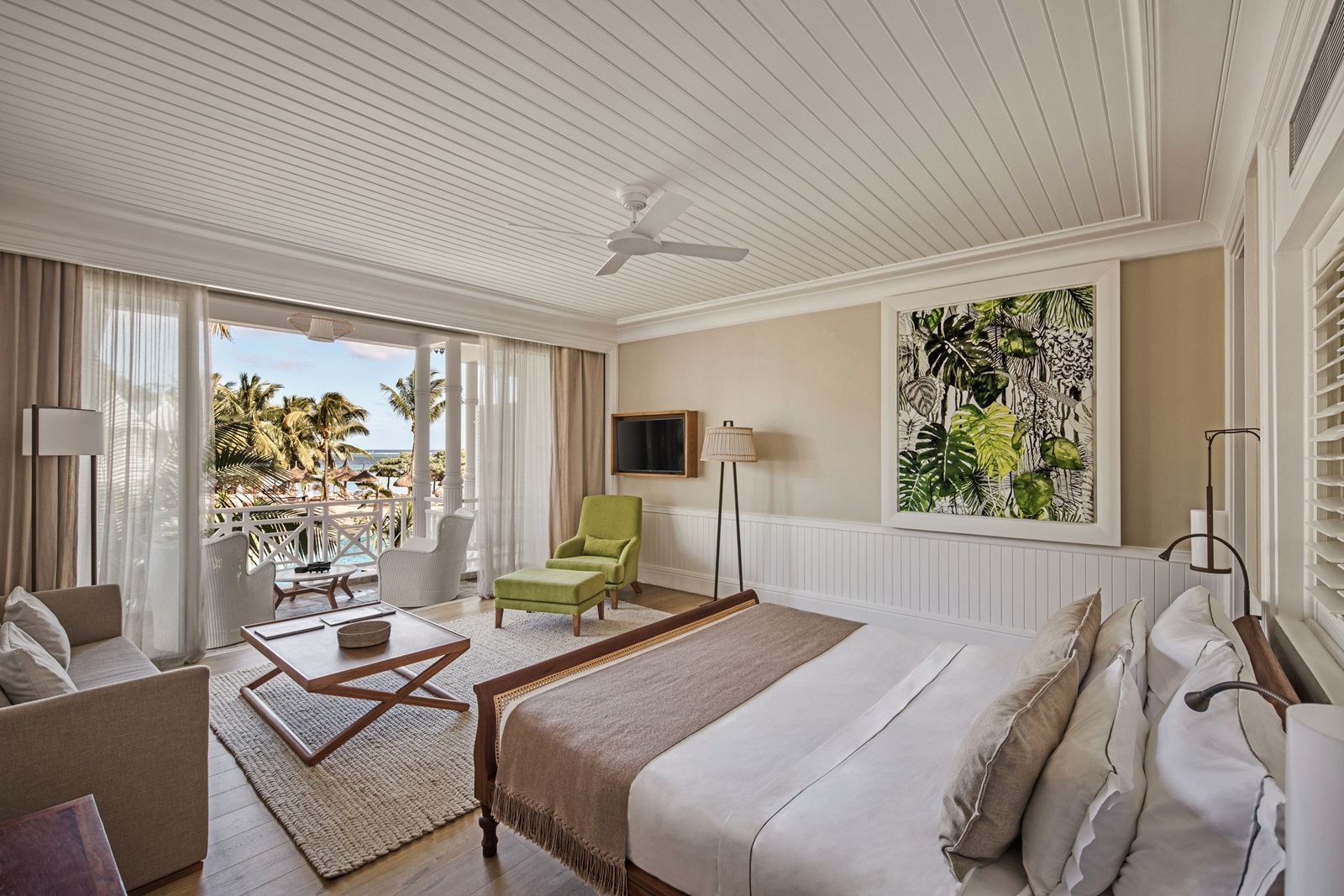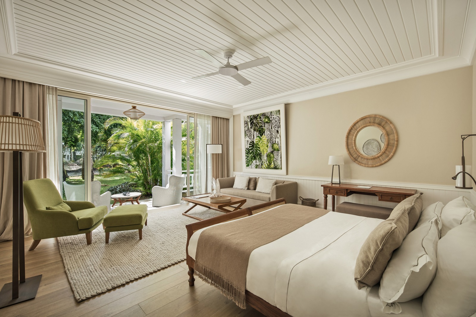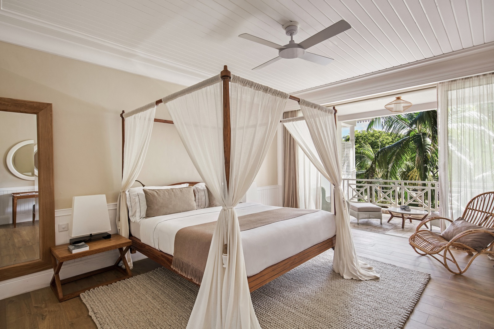 Suites Junior (81 m²), 'vue jardin' ou 'front de mer', au rez-de-chaussée ou au premier étage, avec coin salon spacieux, lit baldaquin. Les suites junior front de mer bénéficient également des avantages suivants : service de blanchisserie gratuit pendant le séjour (excepté le nettoyage à sec) et un chapeau panama offert par adulte à l'arrivée en chambre