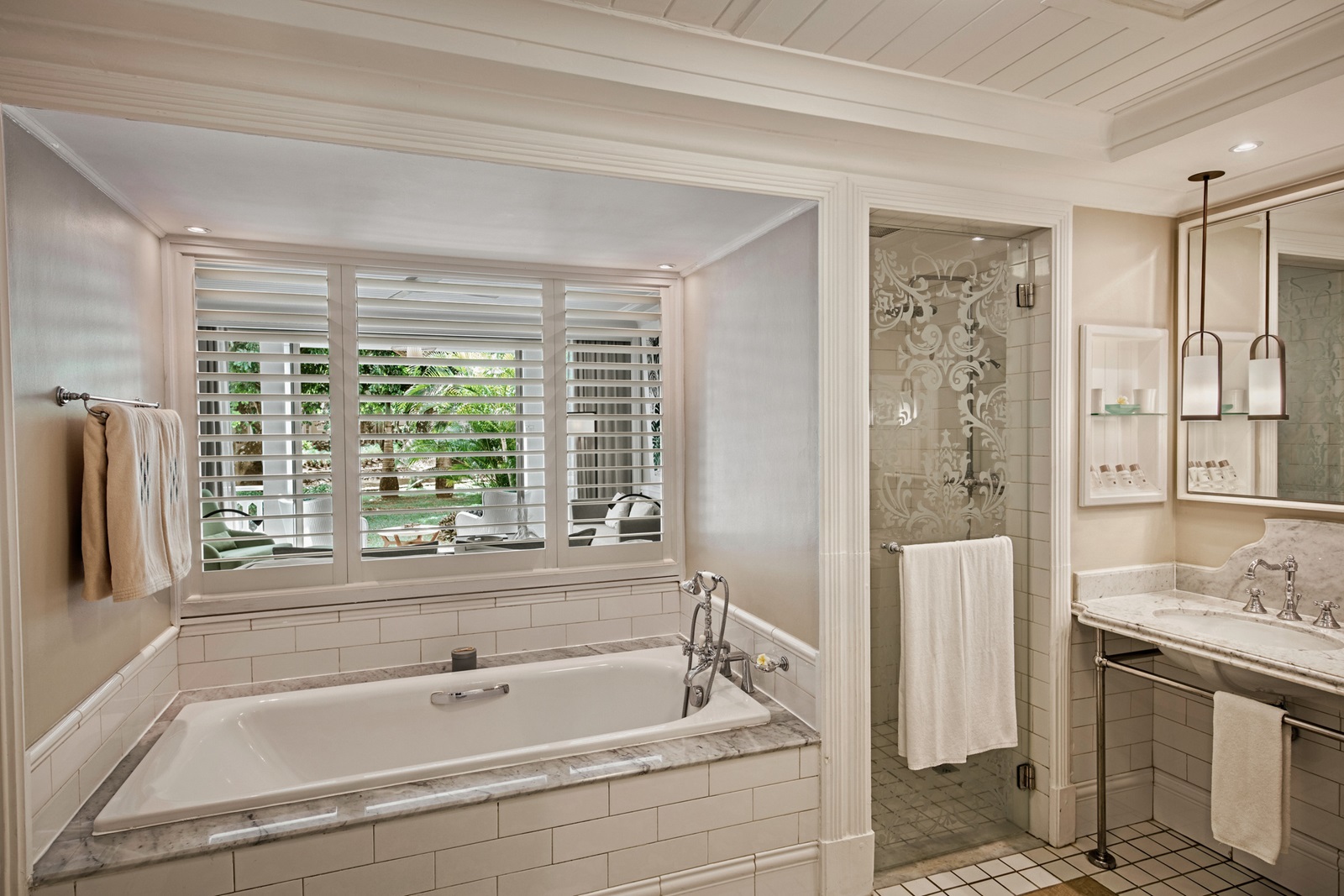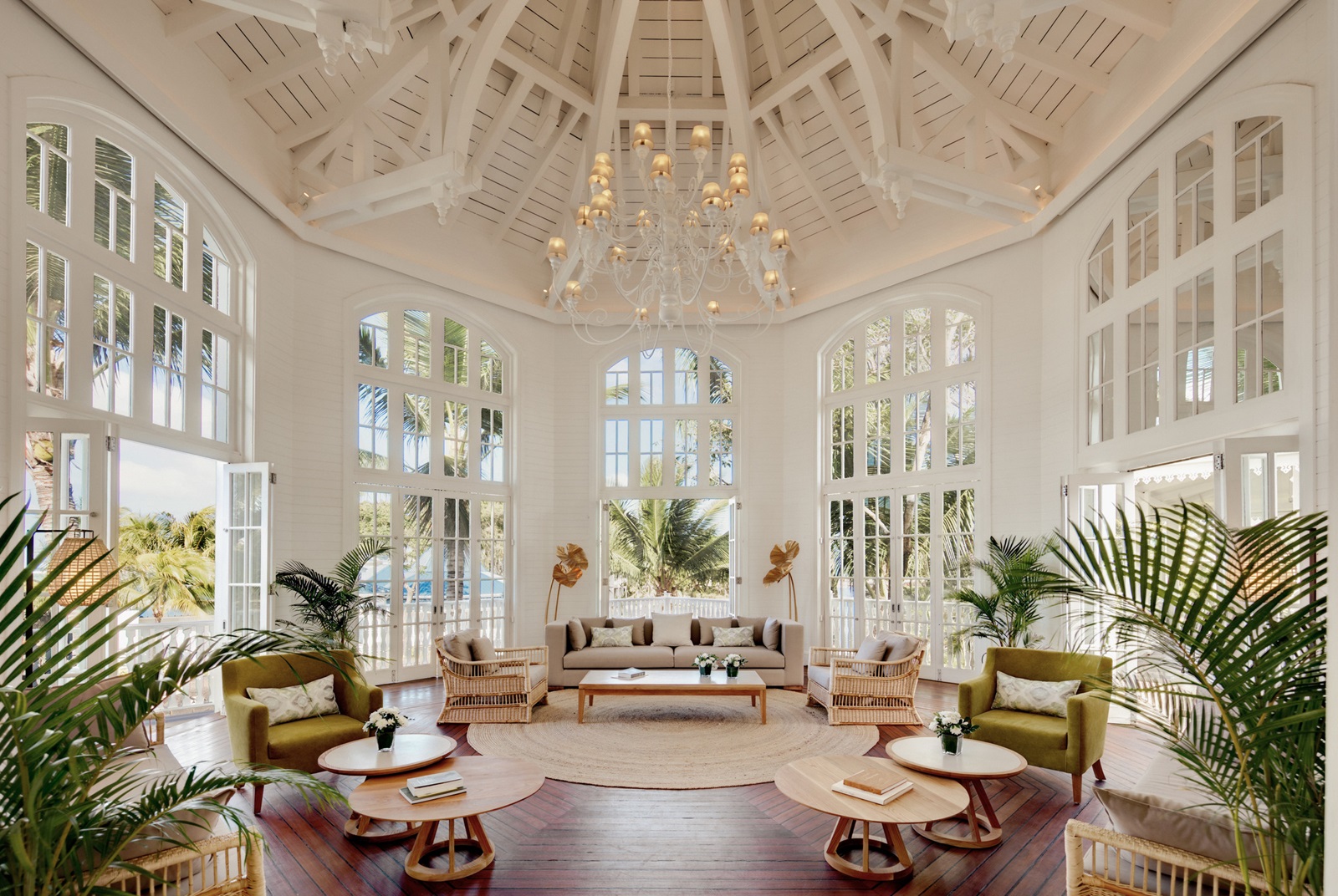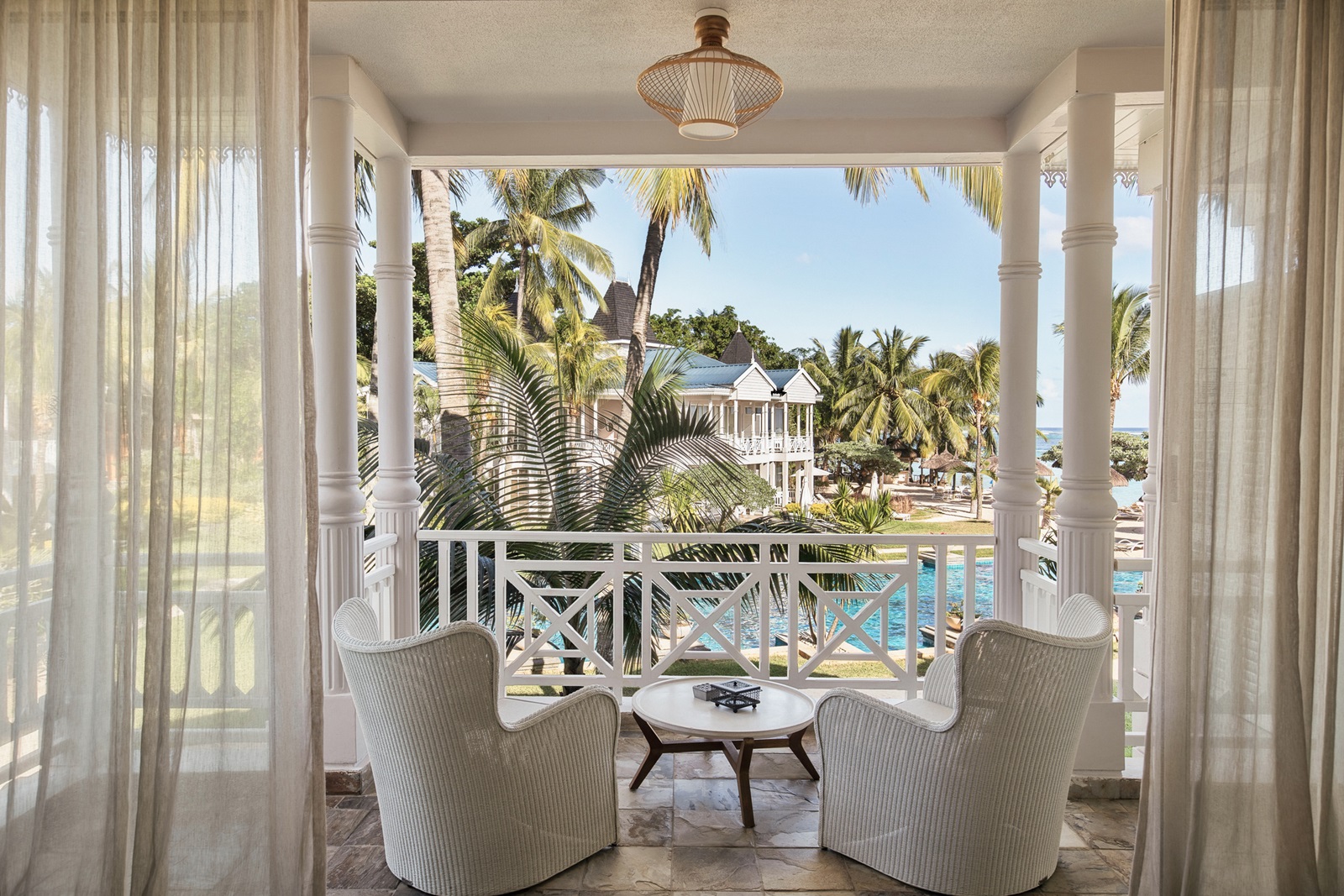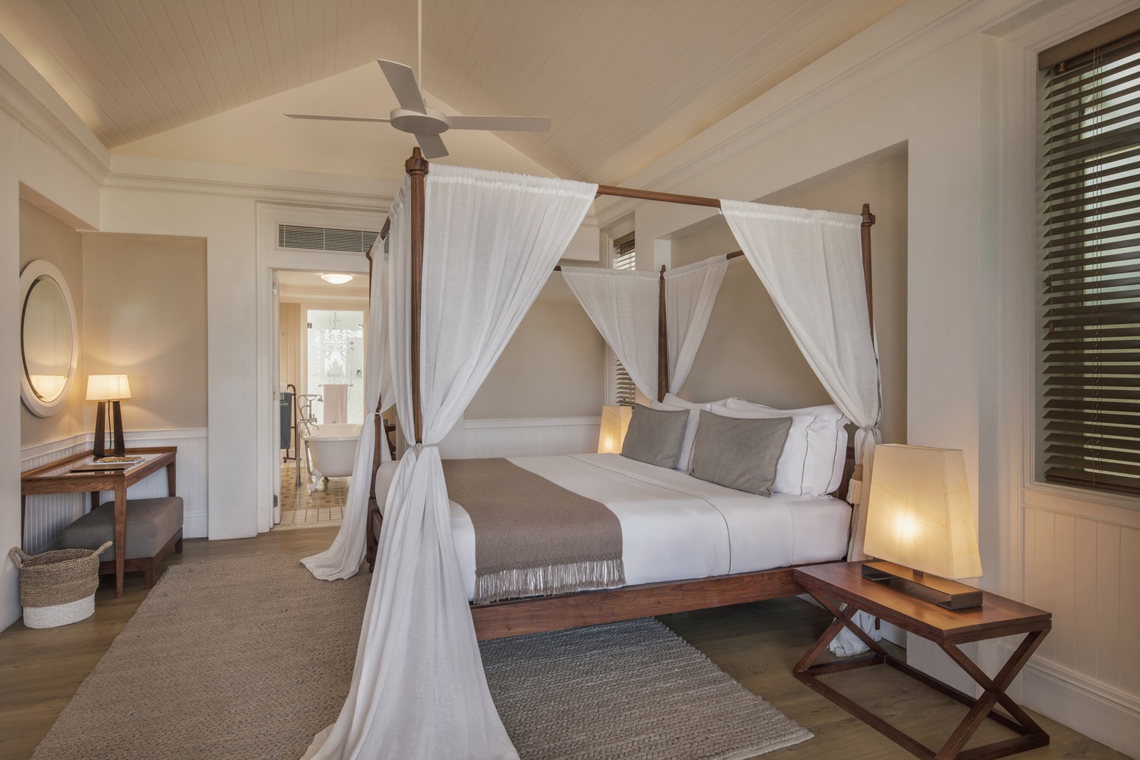 Suites Junior (81 m²), 'vue jardin' ou 'front de mer', au rez-de-chaussée ou au premier étage, avec coin salon spacieux, lit baldaquin. Les suites junior front de mer bénéficient également des avantages suivants : service de blanchisserie gratuit pendant le séjour (excepté le nettoyage à sec) et un chapeau panama offert par adulte à l'arrivée en chambre