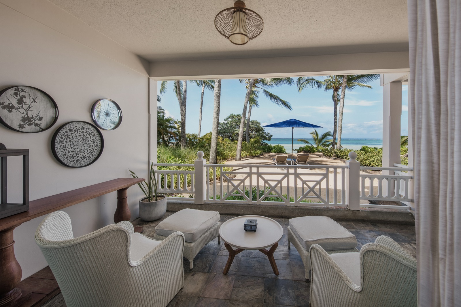 Suites Océan Front de Mer (104 m²) salon/salle à manger, chambre à coucher séparée avec lit baldaquin, accès direct à la plage et douche extérieure. Les Suite Ocean front de mer bénéficient des mêmes avantages que les Suites Senior, avec un early check-in et late check-out offerts et garantis, un dîner privé face au lagon et une voiturette pour vous déplacer dans le domaine
