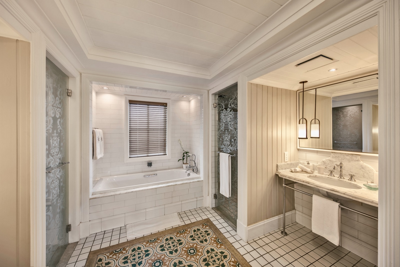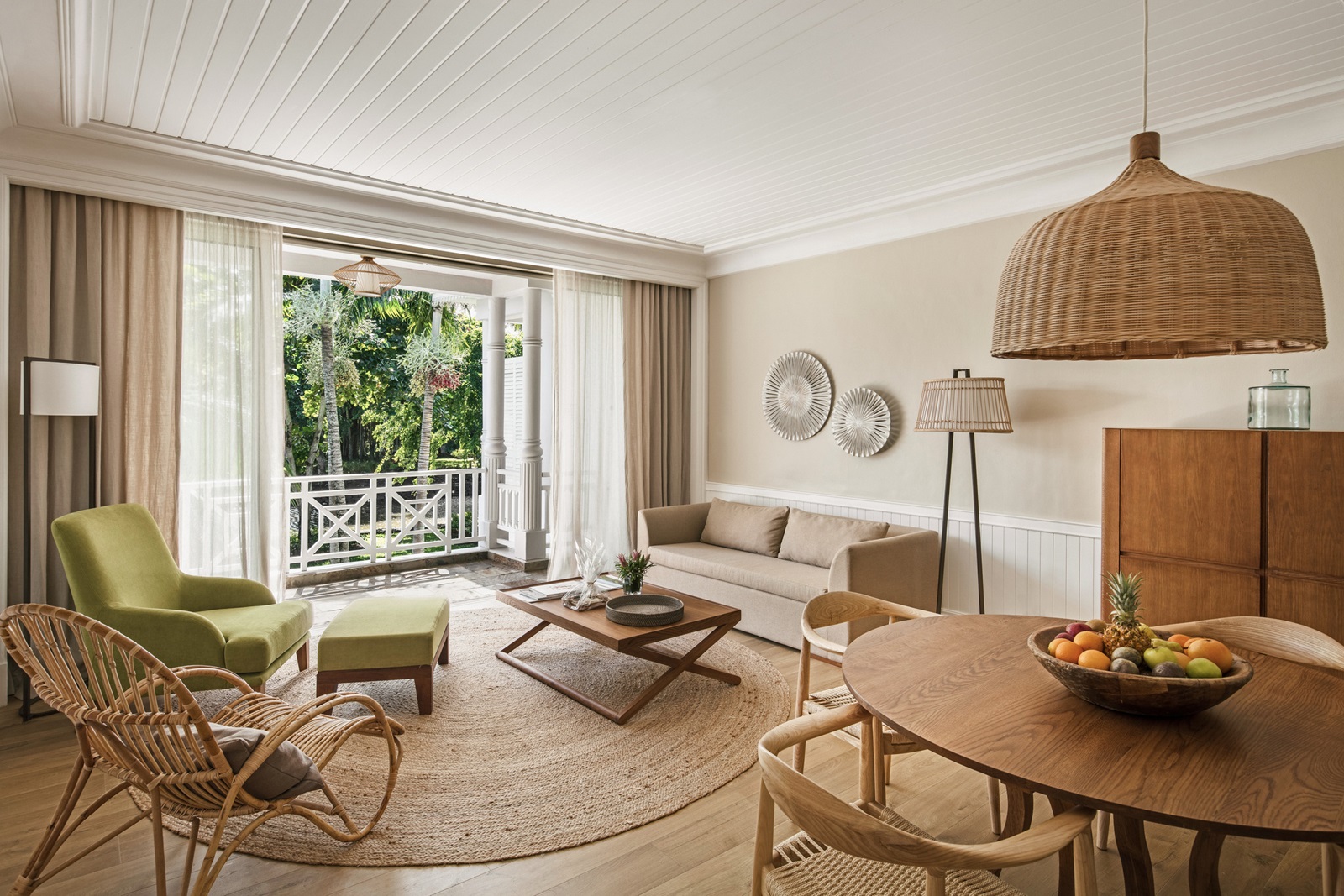 toutes les suites, réparties sur 20 villas distinctes de 6 ou 8 suites avec une décoration au style colonial et épuré, sont équipées d'un baignoire, douche, sèche-cheveux, wifi, TV LED interactive, téléphone, machine à café Nespresso®, minibar (€), fer et planche à repasser, coffre-fort, climatisation et d'un balcon ou terrasse