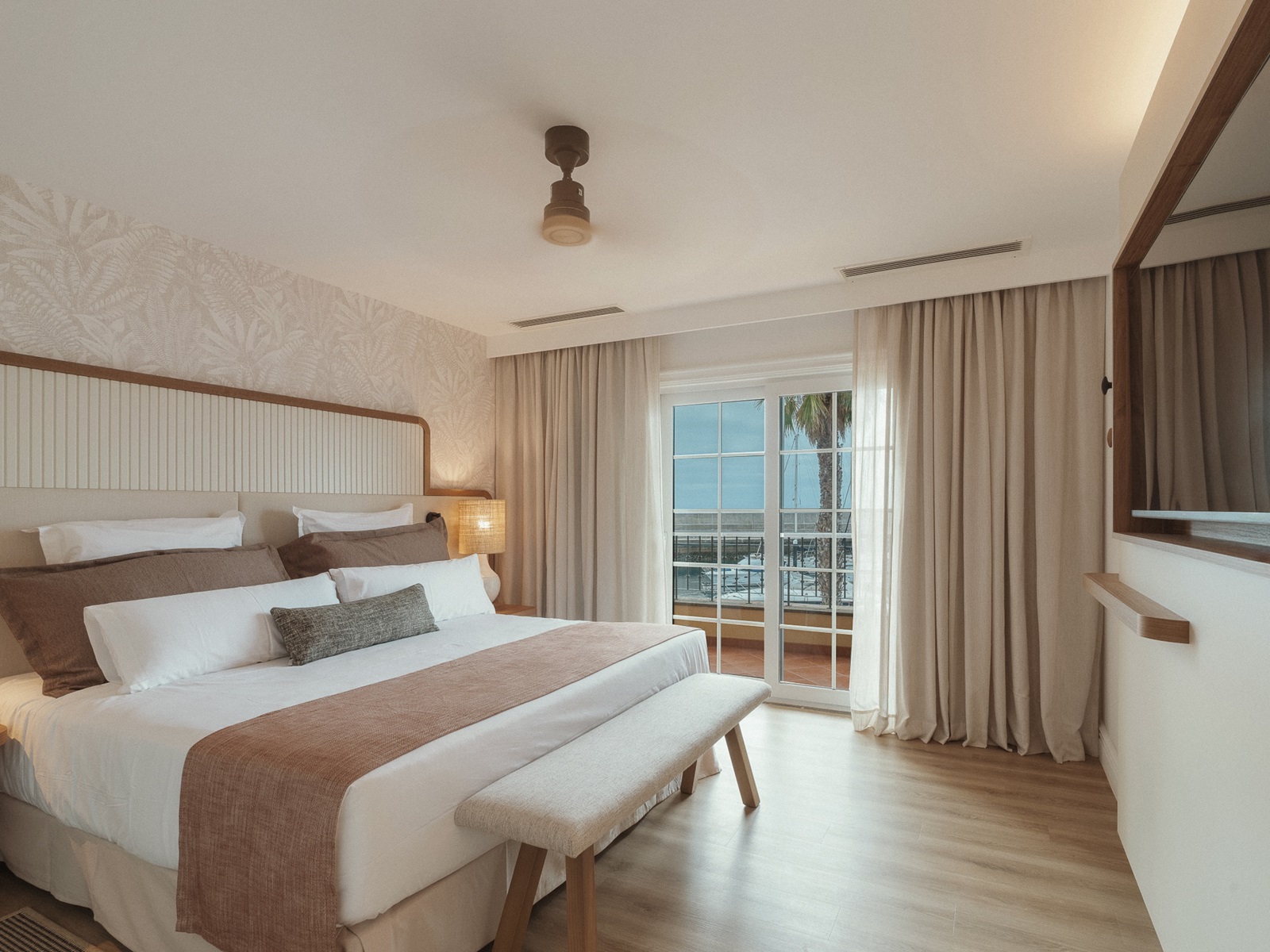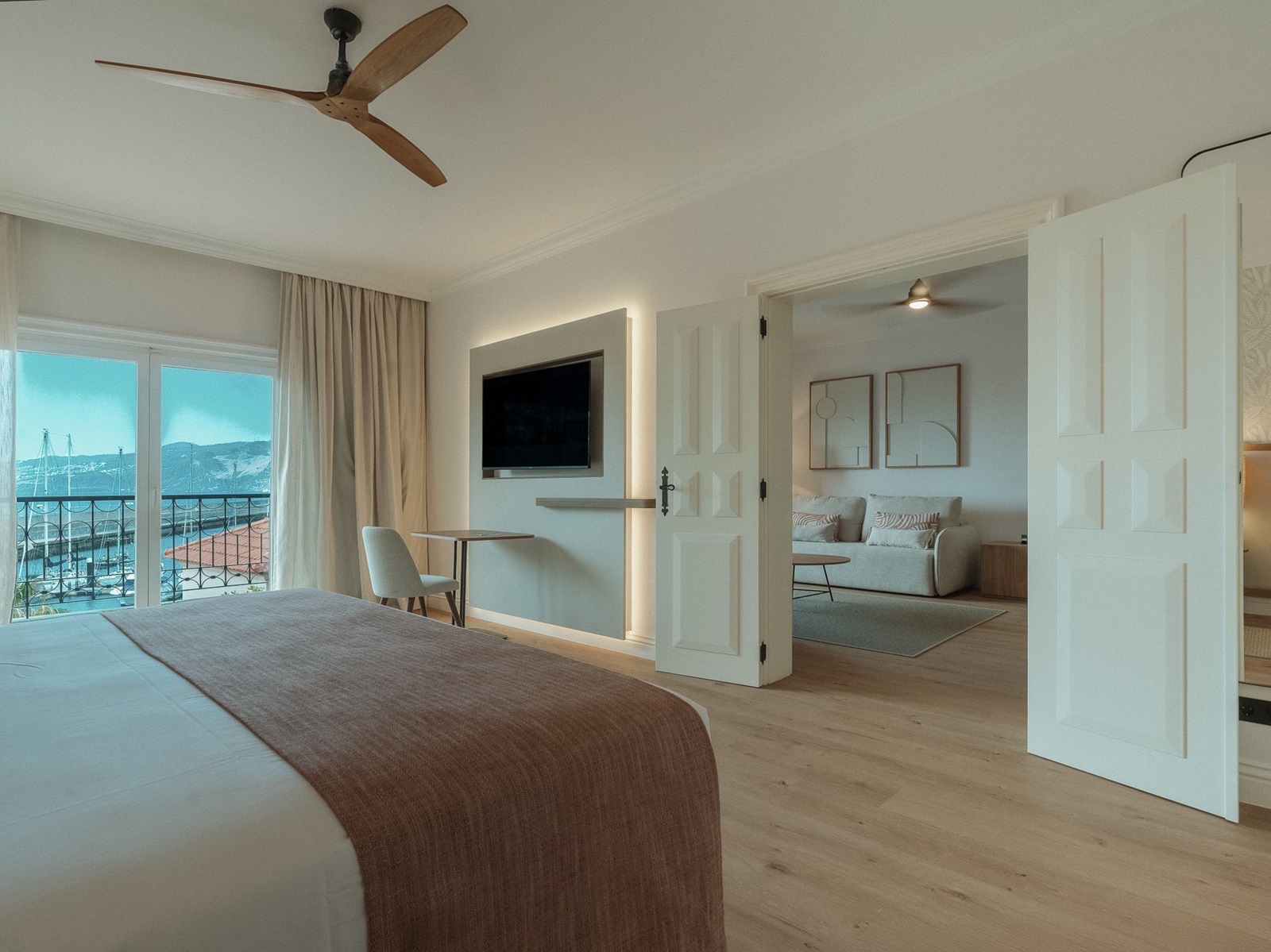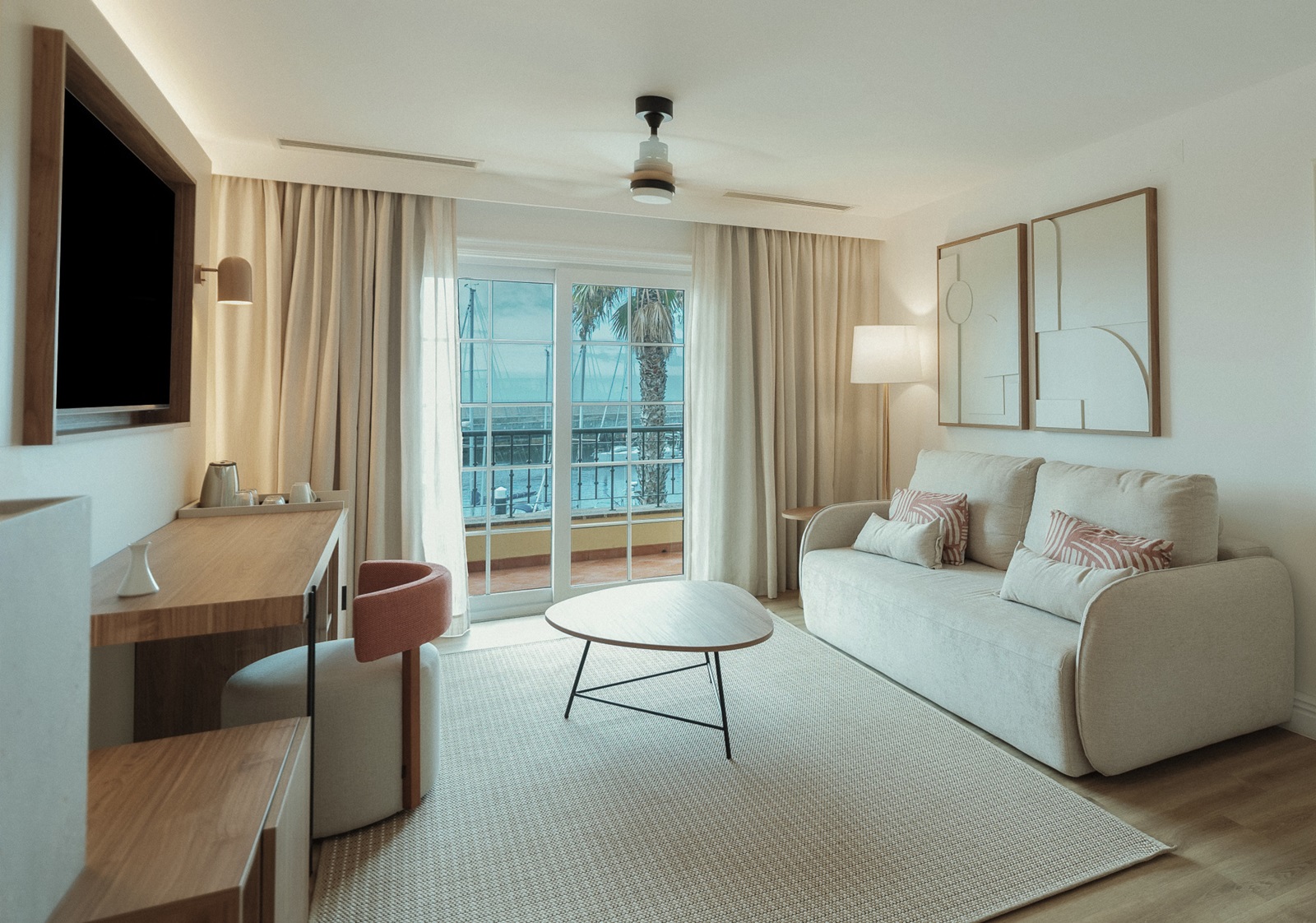 Marina Apartment (59 m²) avec séjour spacieux avec kitchenette, chambre à coucher avec lit king-size ou lits jumeaux, salle de bains avec douche à effet pluie, vue sur la marina et la mer