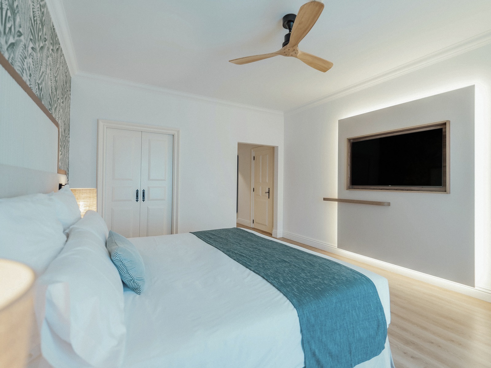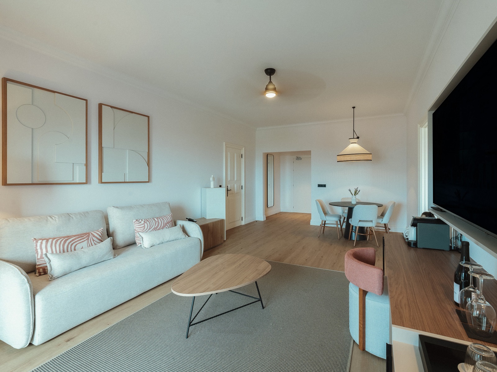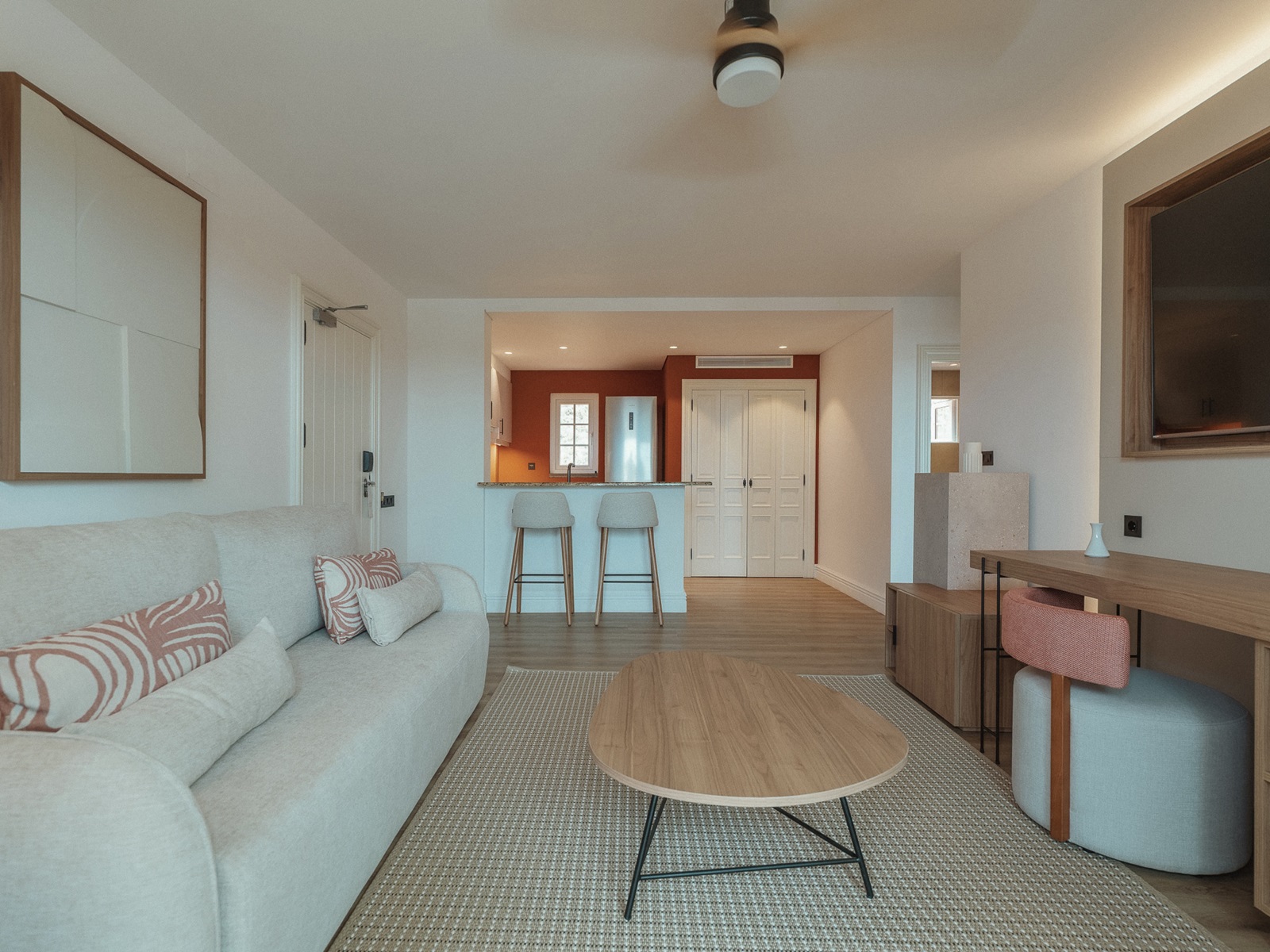 Marina Apartment (59 m²) avec séjour spacieux avec kitchenette, chambre à coucher avec lit king-size ou lits jumeaux, salle de bains avec douche à effet pluie, vue sur la marina et la mer