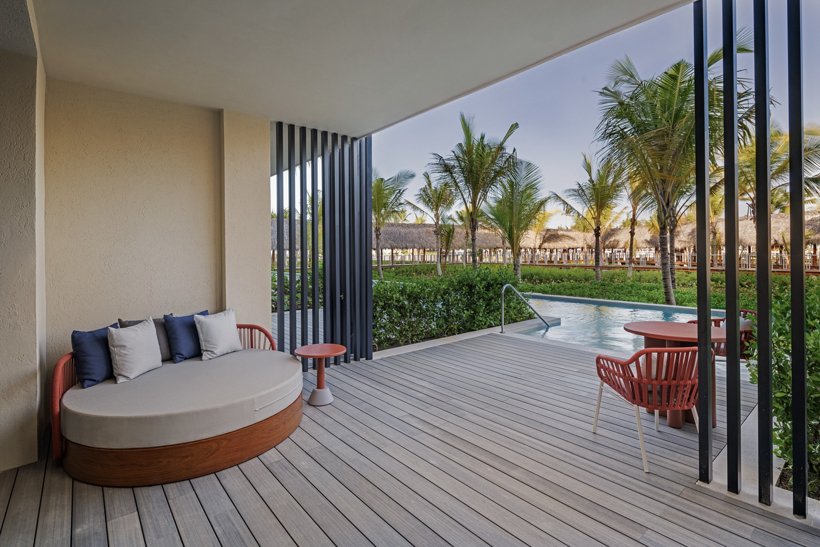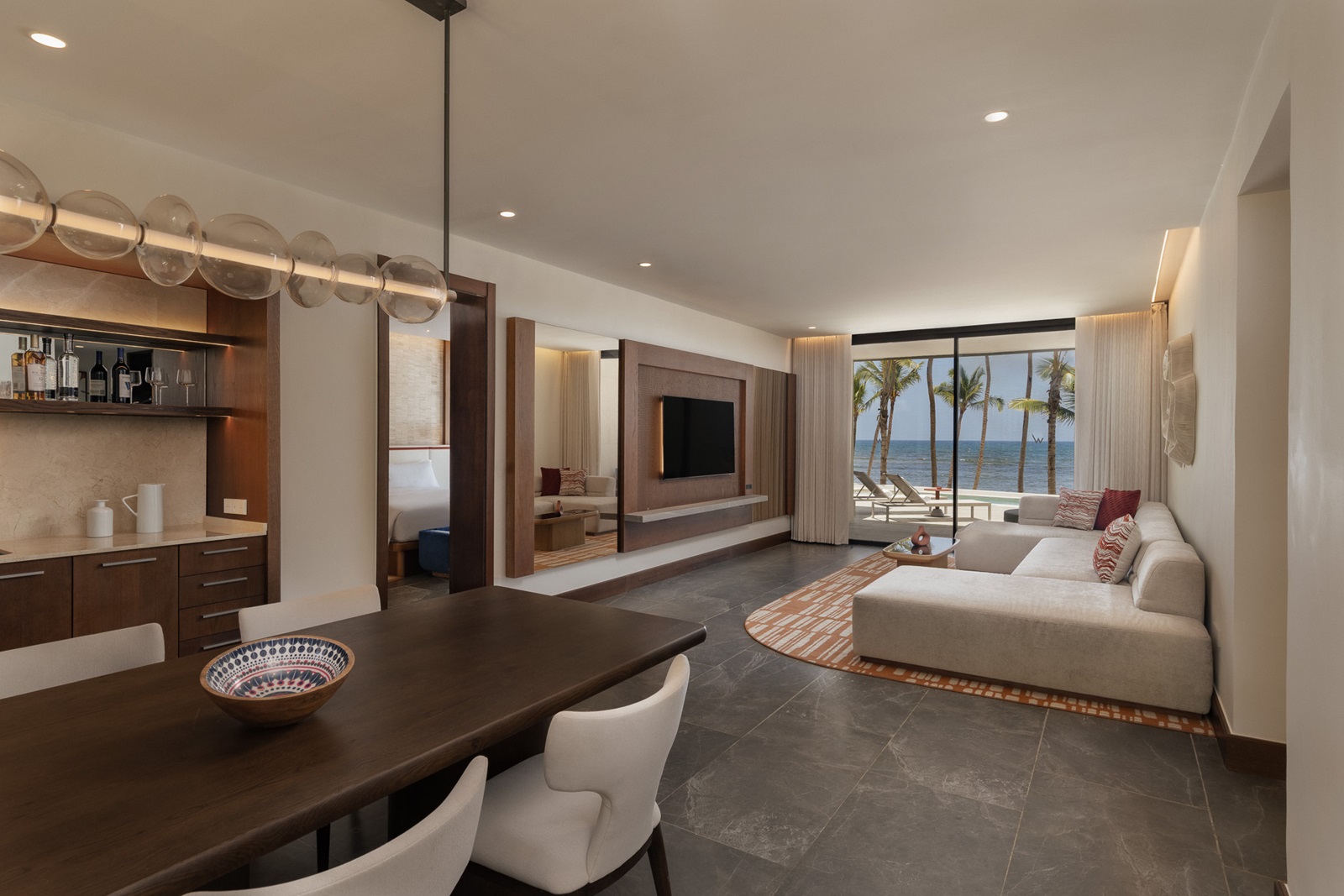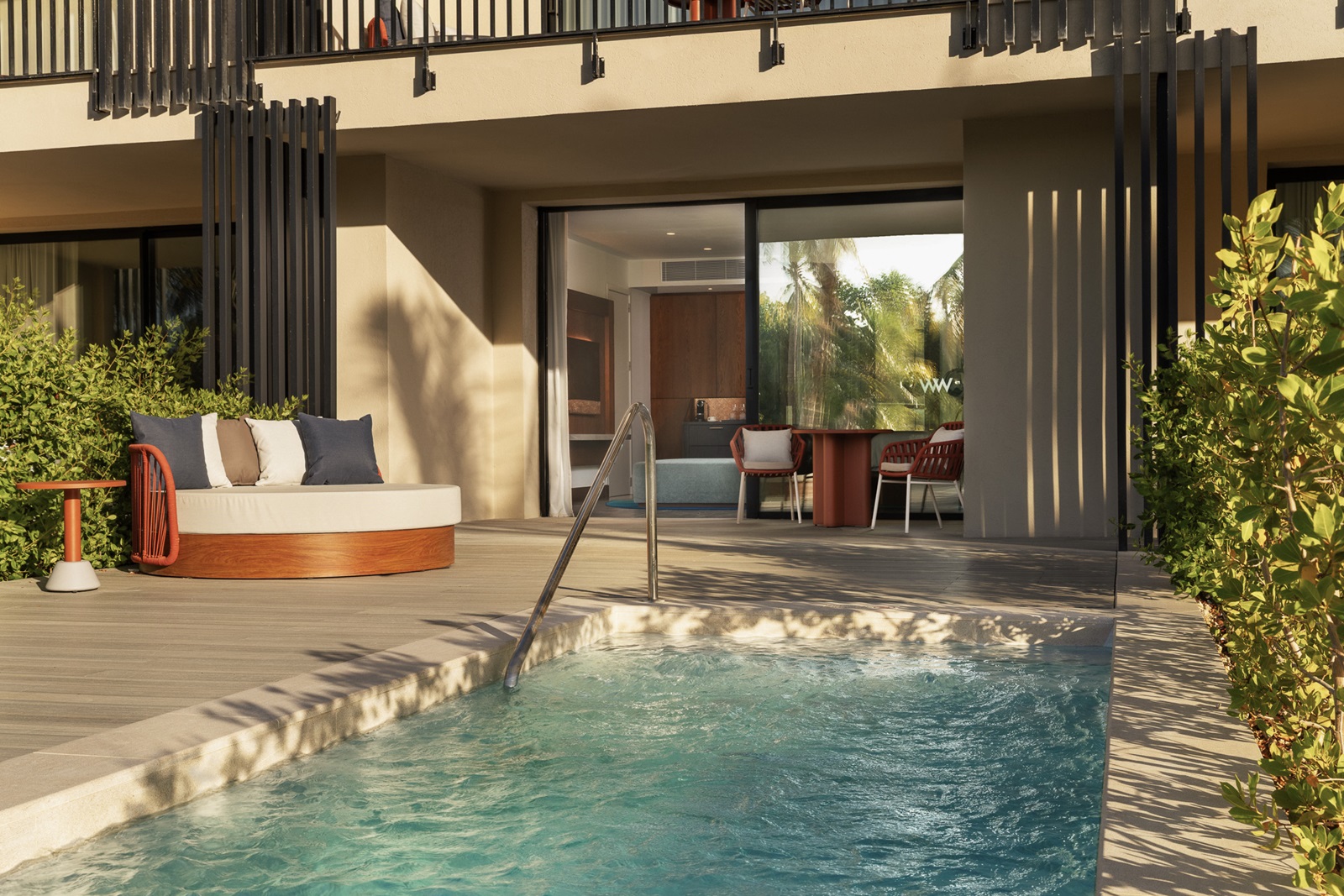 Oasis suite ocean front (228 m²) située près de la plage avec un séjour spacieux, 2 chambres à coucher séparées, 2 salles de bains et une piscine privée