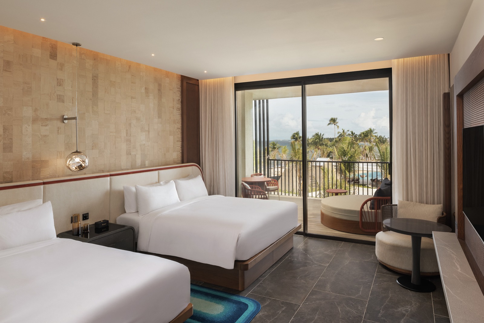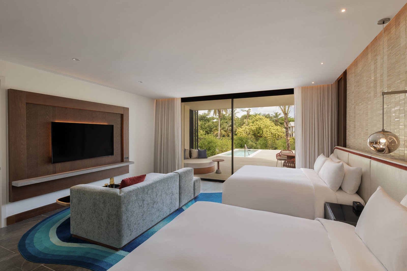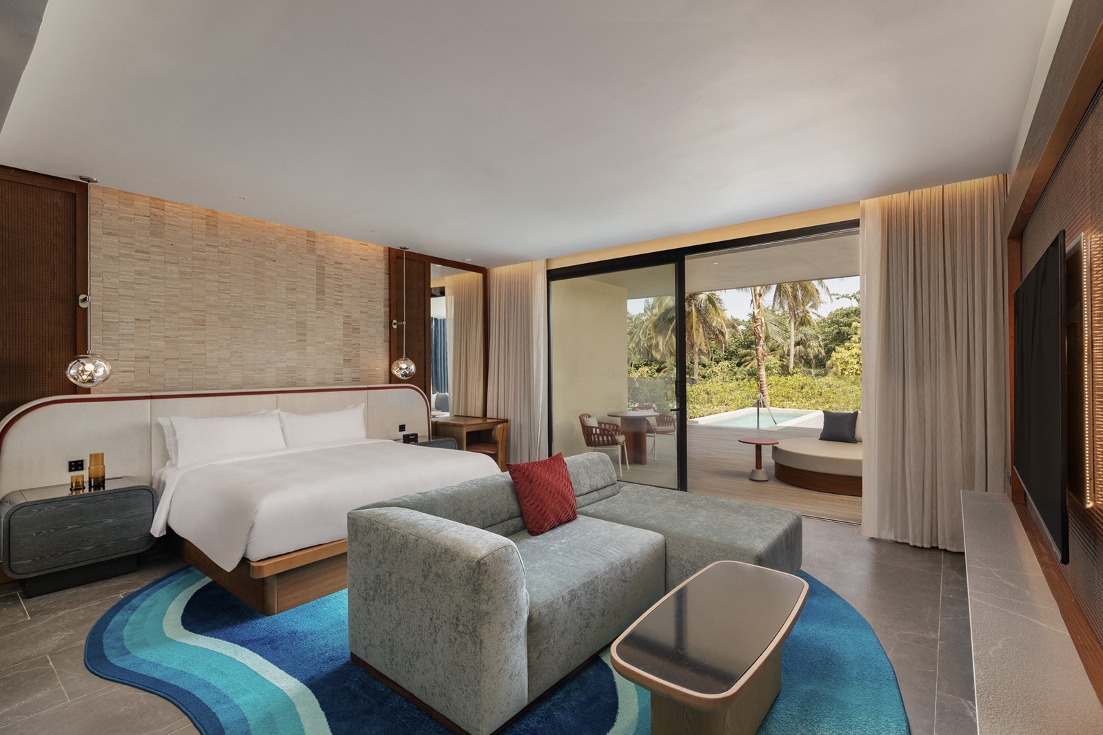 Oasis suite ocean front (228 m²) située près de la plage avec un séjour spacieux, 2 chambres à coucher séparées, 2 salles de bains et une piscine privée