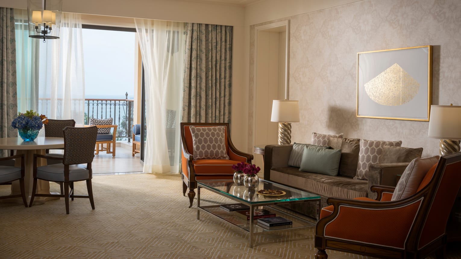 Four Seasons Junior Suites (108 m²) avec chambre à coucher séparée, salle de bain spacieuse, salon et grand balcon avec vue ville