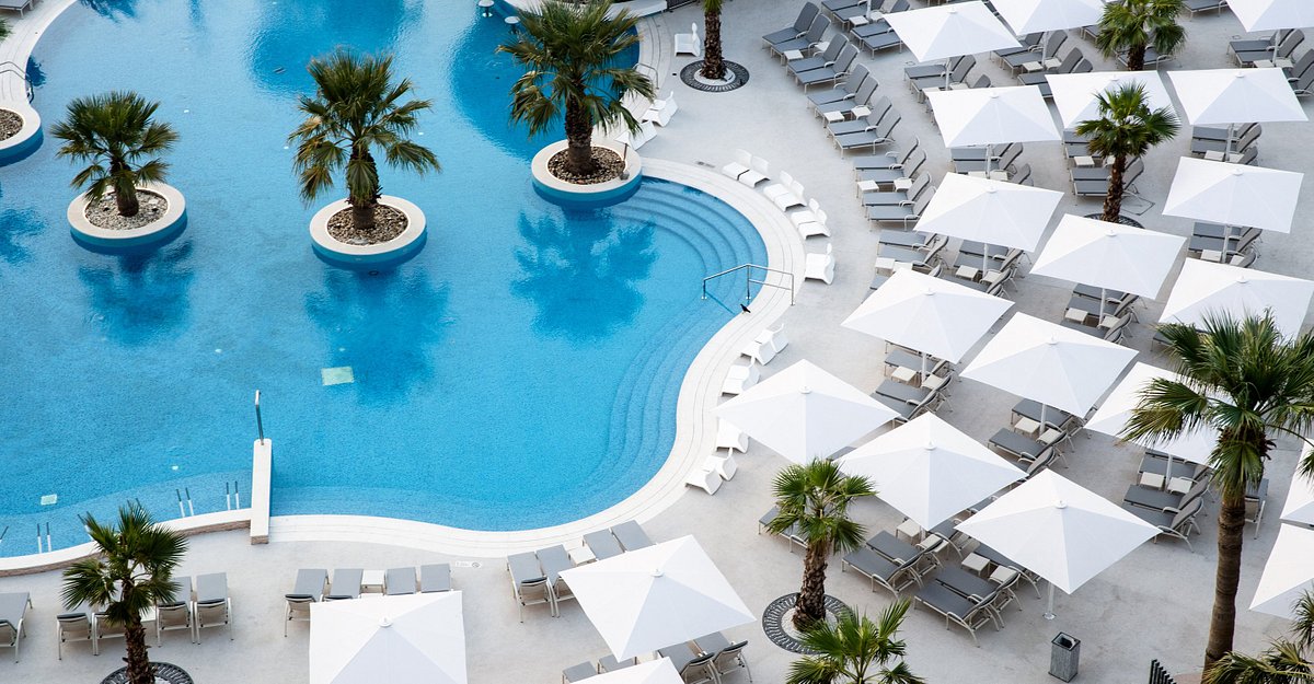 chaises longues, parasols et serviettes à la piscine et à la plage