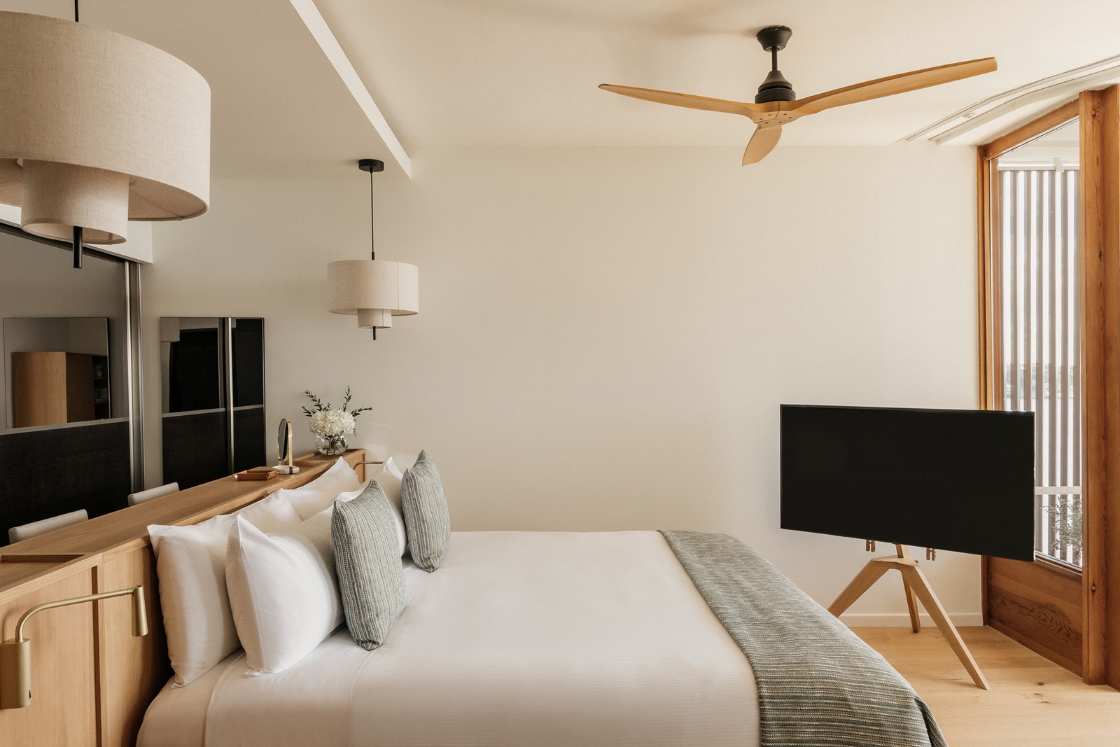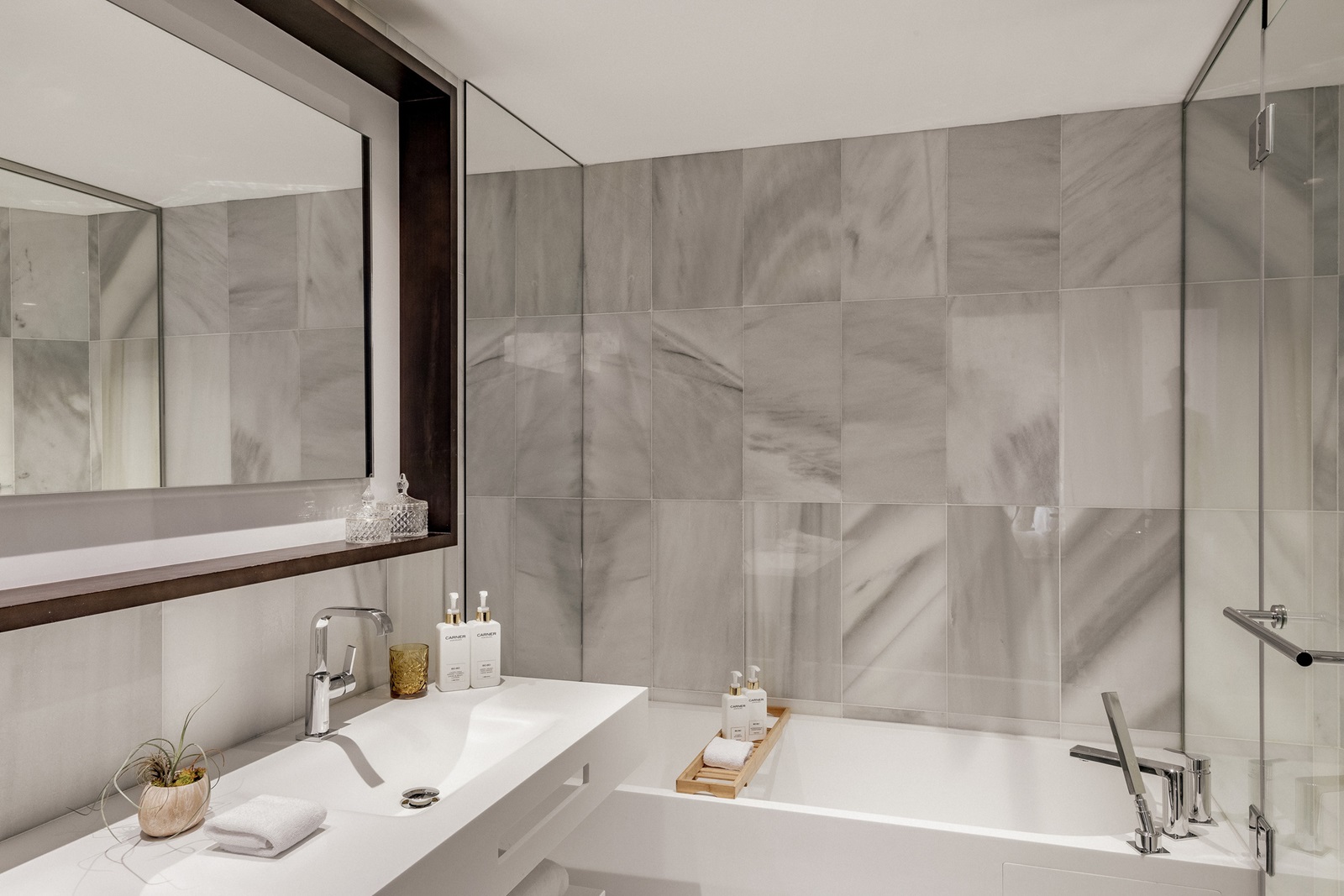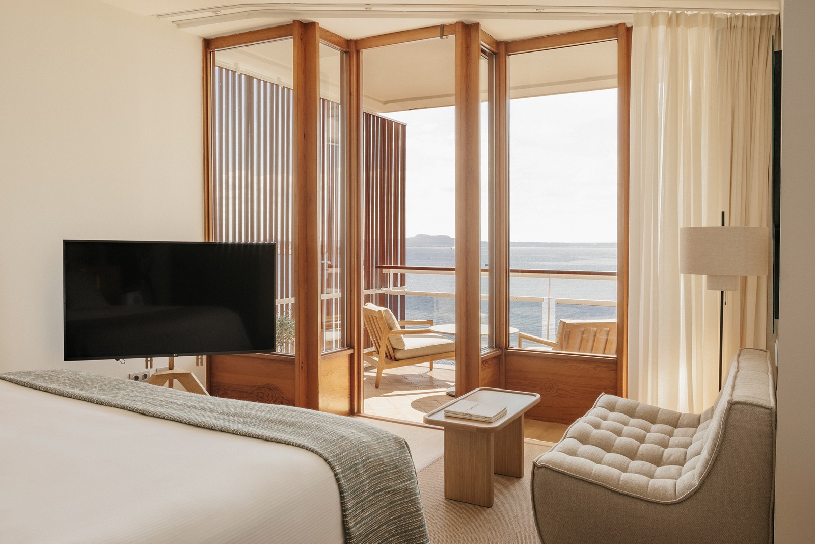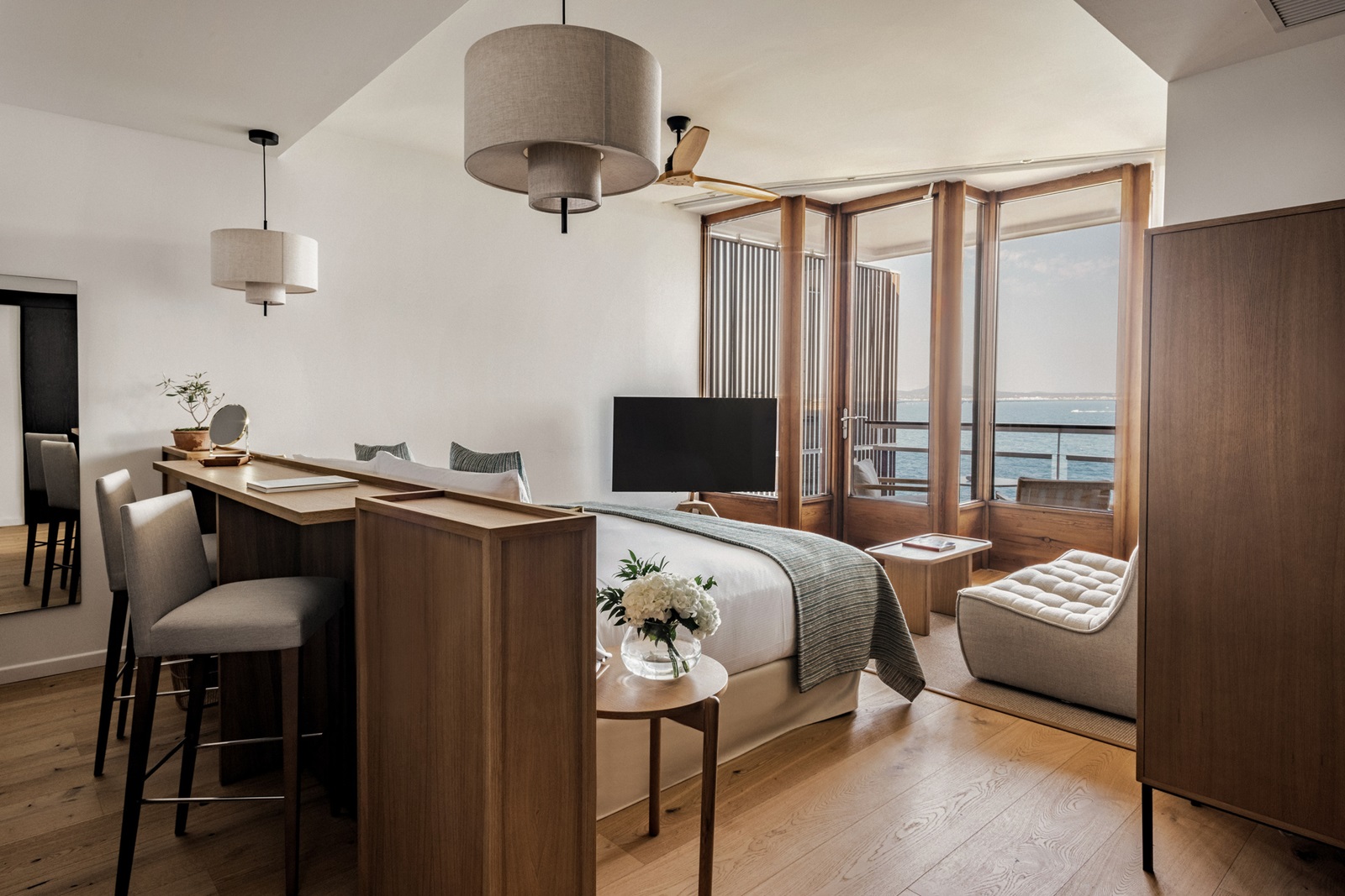 grand suite (87 m²) avec coin salon, salle de bain avec bain hydromassage et douche à effet pluie et vue mer