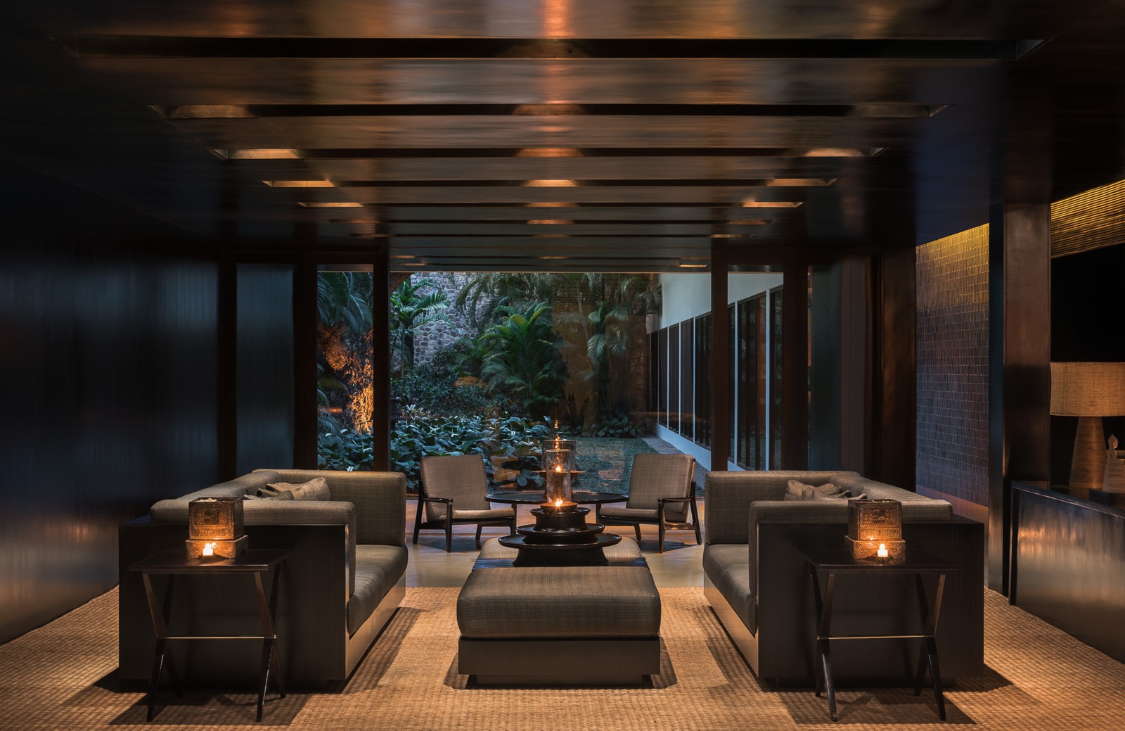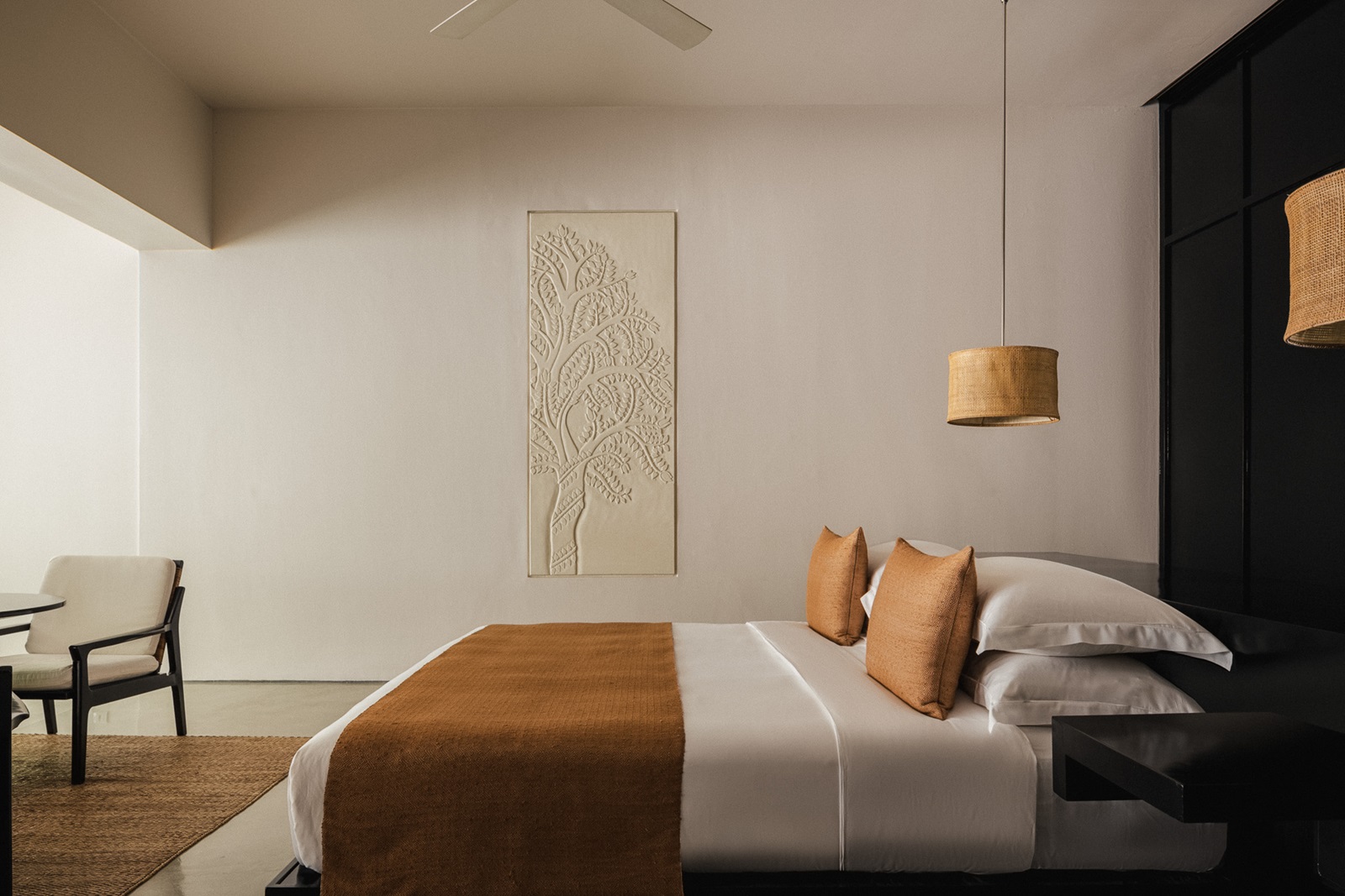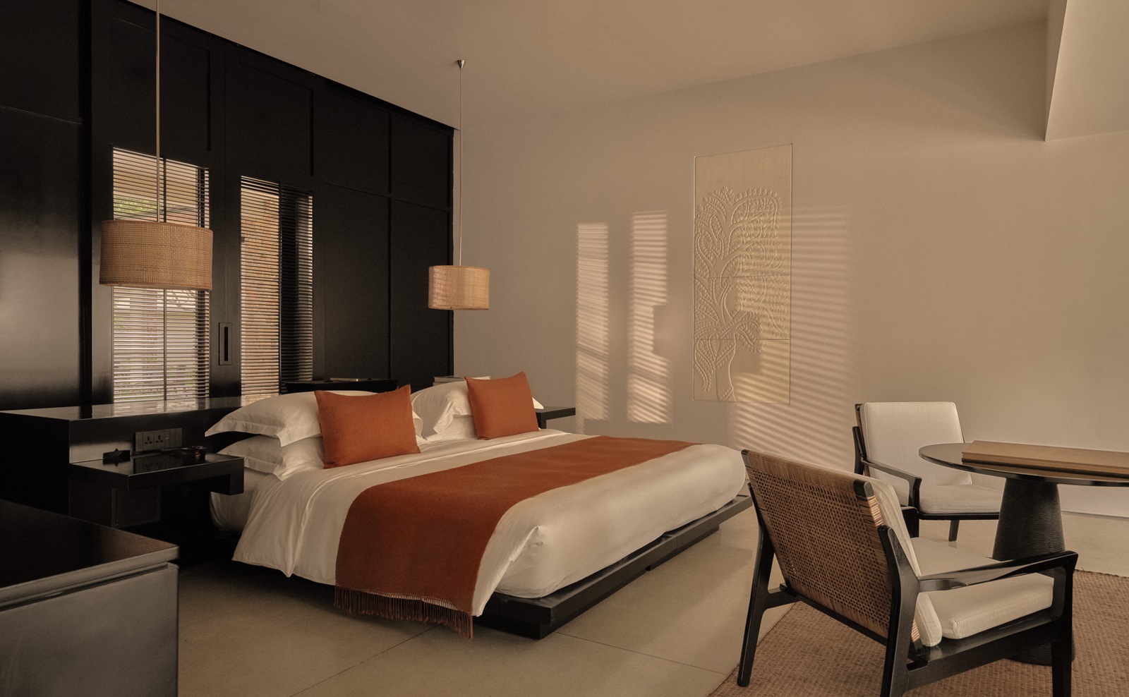 toutes les suites spacieuses et ouvertes, avec un mélange de bois foncé et d'accents de couleur sable, disposent d'une salle de bain (baignoire autonome, sèche-cheveux), grand coin salon, téléphone, télévision à écran plat, système audio Bose, machine à café espresso, coffre-fort, minibar (€), climatisation, wifi (gratuit) et patio privé