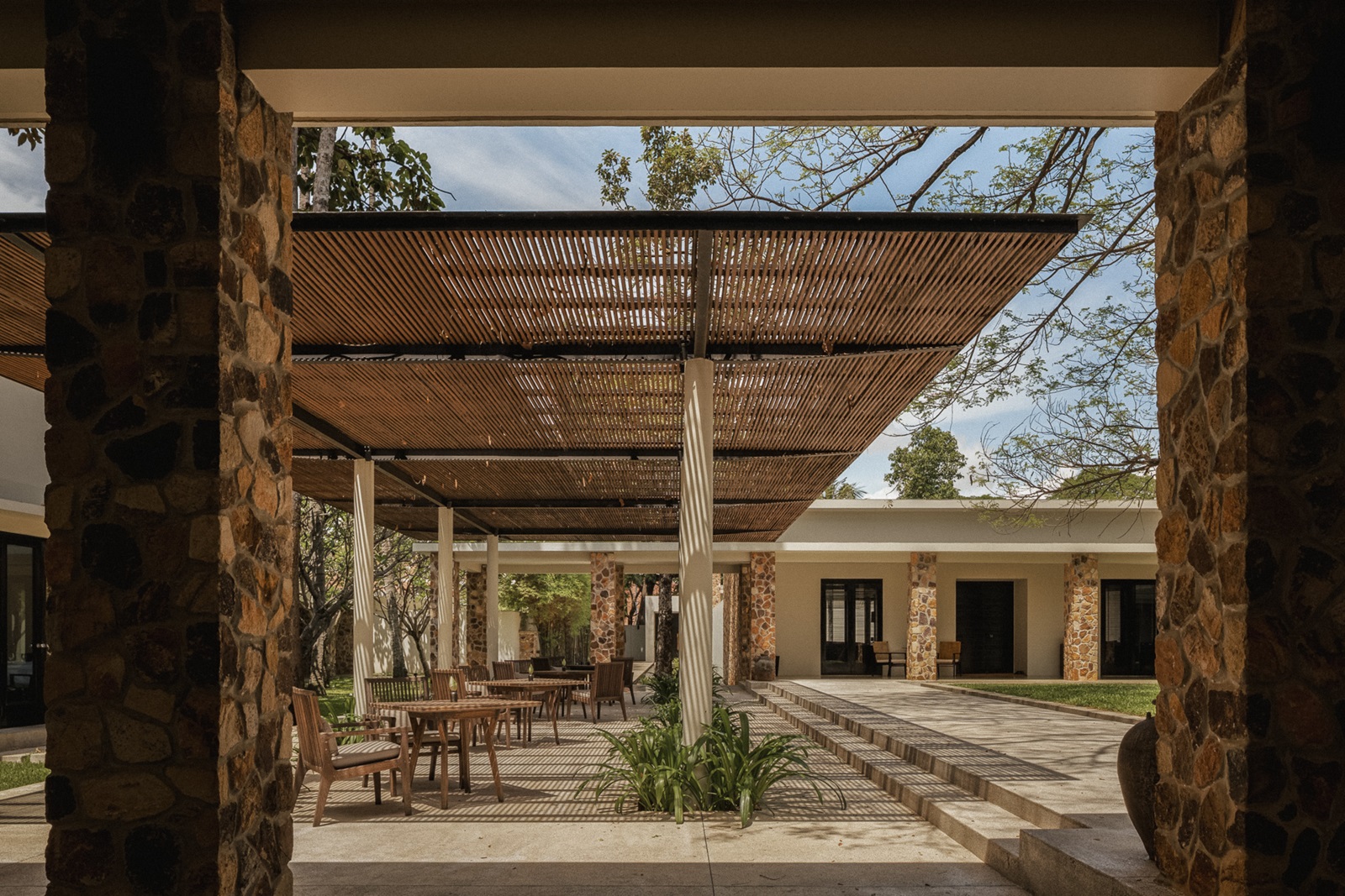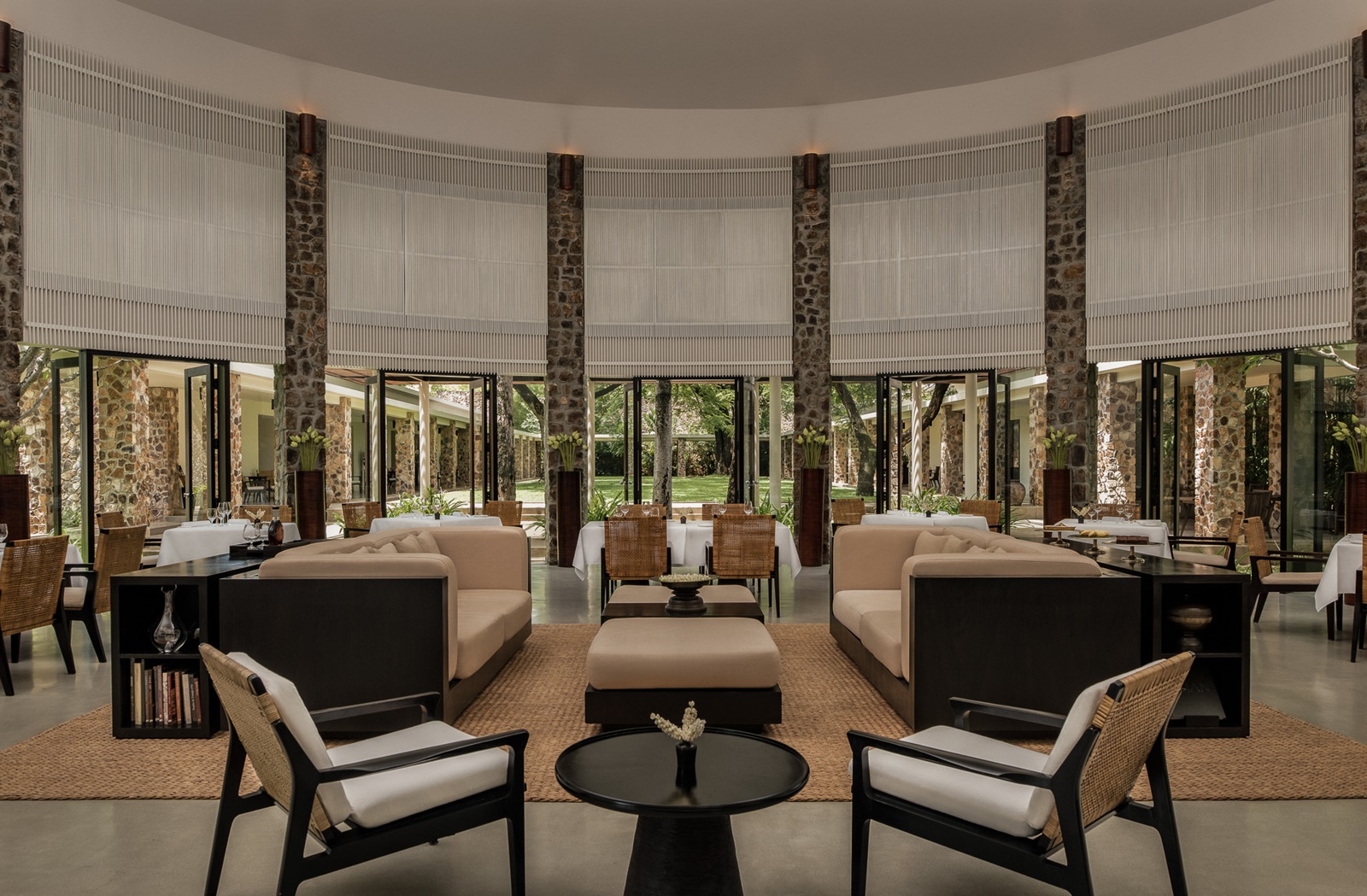 Restaurant à la carte The Dining Room avec un plafond de 7 m de haut et deux pergolas ombragées ; comprend également une cave à vin et à fromages avec lounge (pâtisseries et spécialités locales)