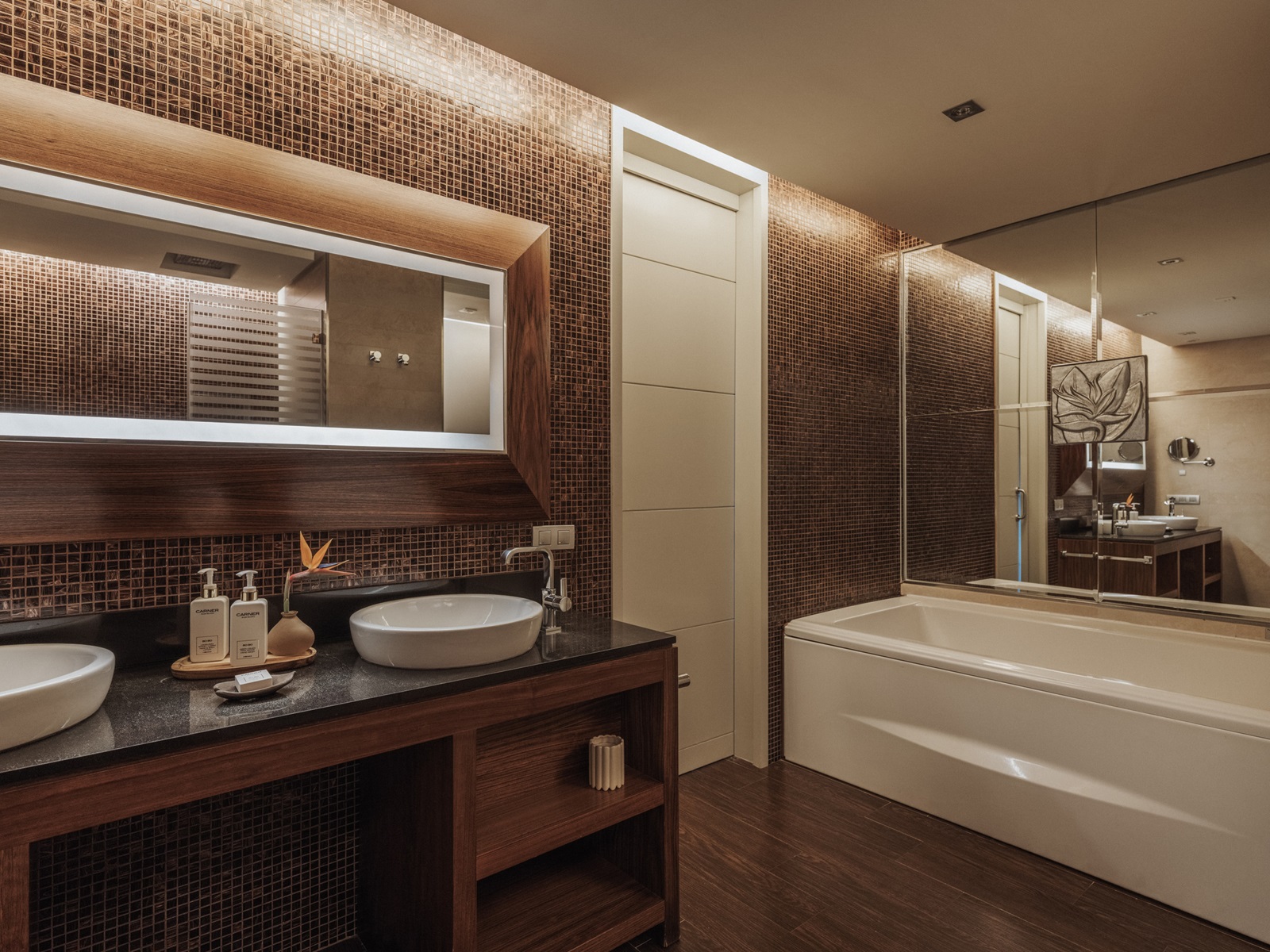 master suites (116 m²) avec salon/chambre à coucher, chambre à coucher séparée, 2 salles de bains dont 1 avec bain hydromassage et douche à effet de pluie
