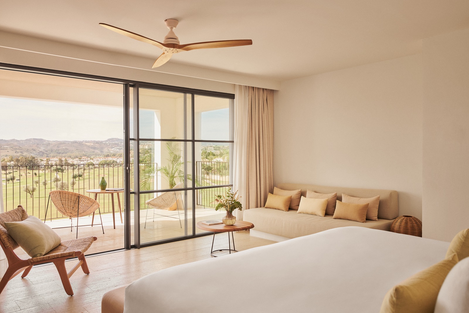 Junior Suites Garden View ou Golf View (45 m² + 10 m² de terrasse) avec salon spacieux, grande salle de bain (baignoire et douche séparée) et balcon ou terrasse