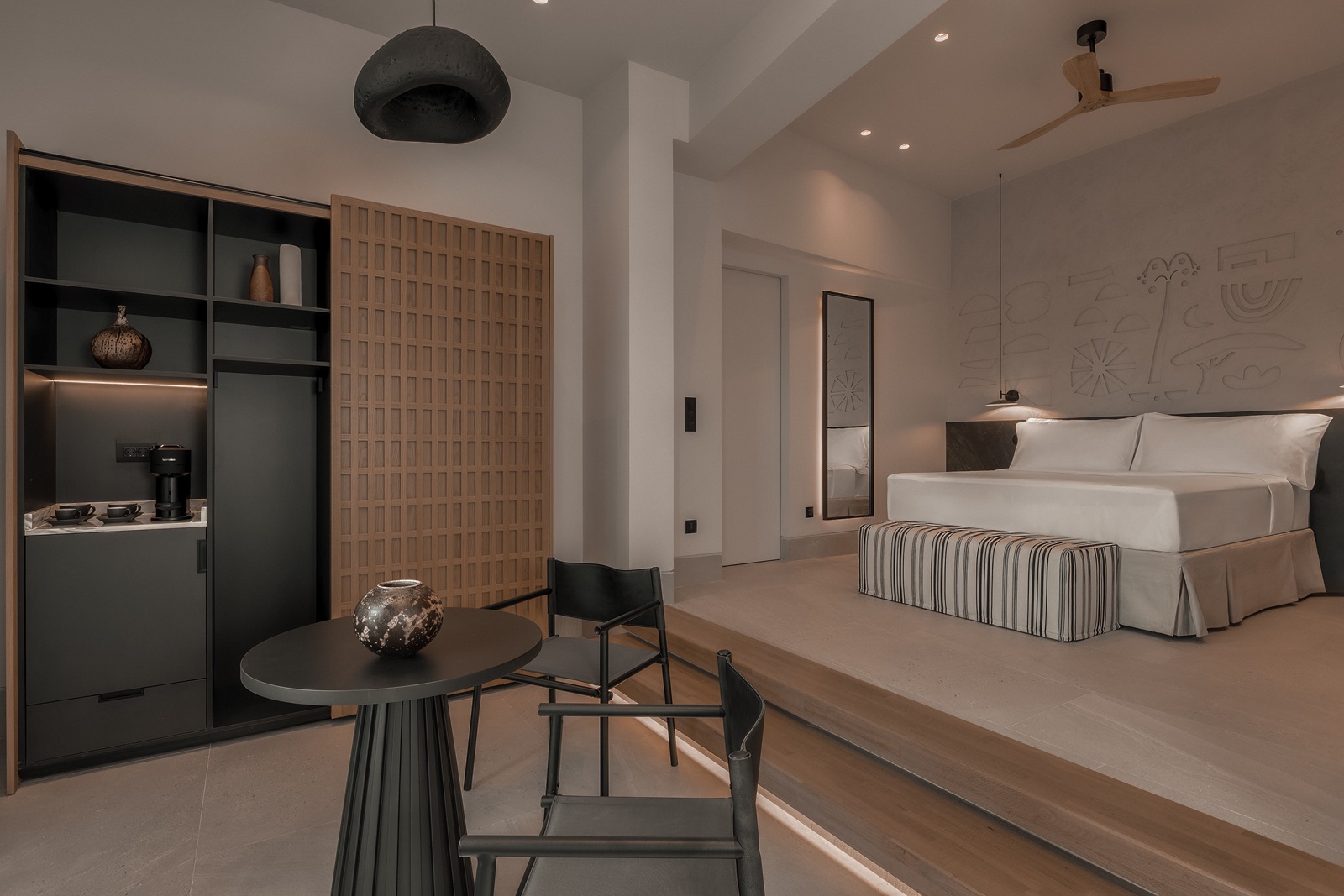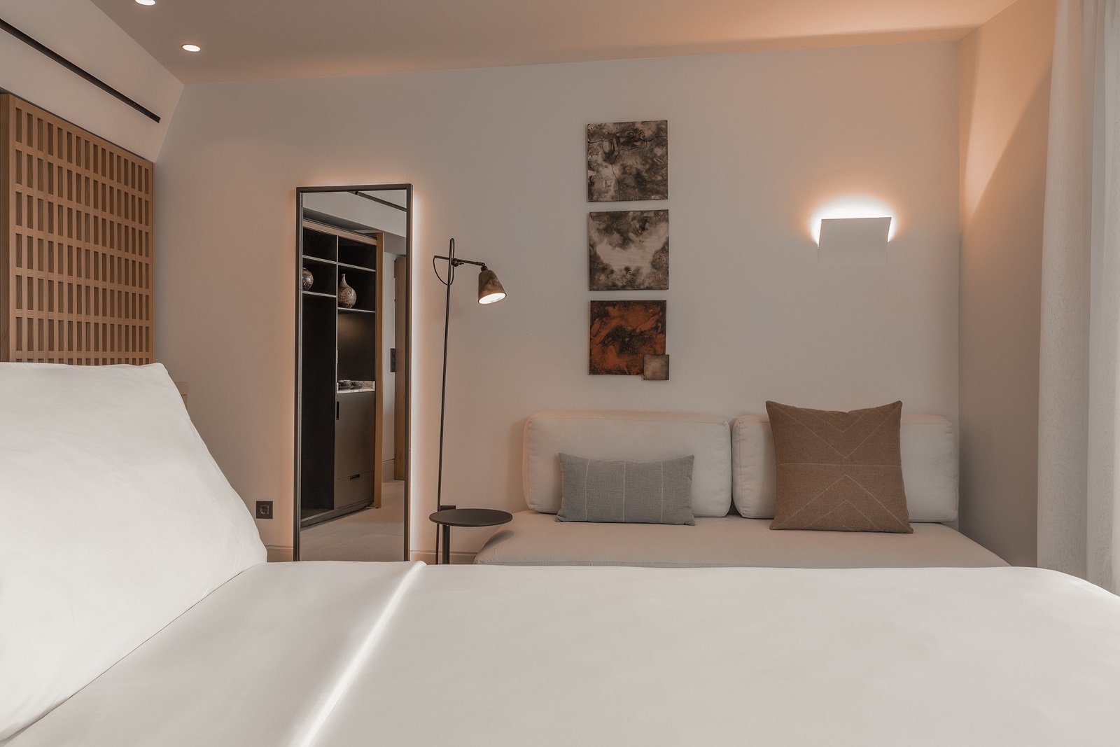 toutes les chambres modernes et élégamment meublées avec un décor chaleureux et apaisant aux couleurs sable ont une salle de bain (douche à l'italienne, sèche-cheveux), télévision à écran plat, climatisation, coffre-fort, machine Nespresso, Marshall speaker, wifi (gratuit), minibar (€) et balcon ou terrasse