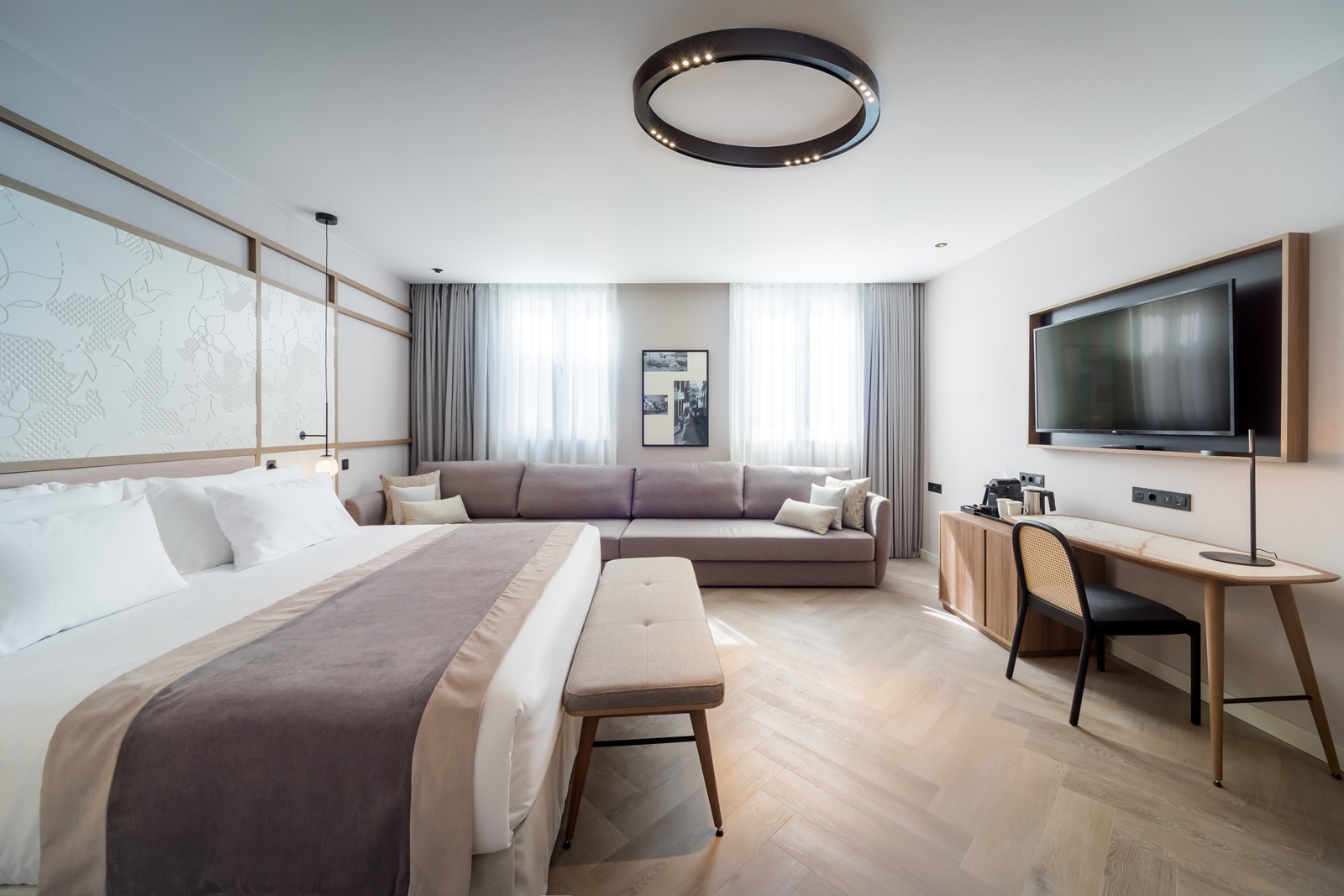 suites (35 m²) avec salle de bain ouverte, chambre à coucher séparée et living