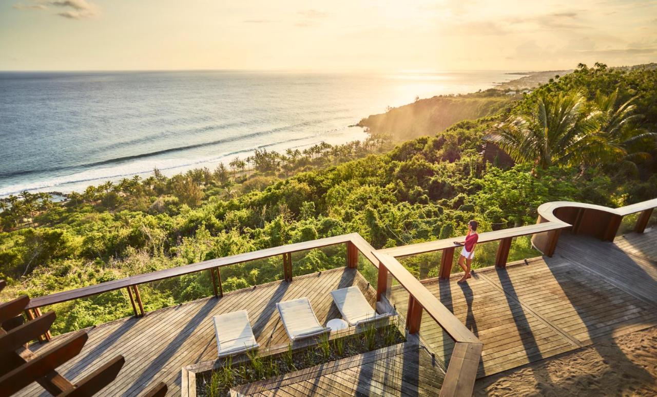 lodges uniques (100 m², max 2 adultes) situés en haut de la falaise avec un panorama unique sur la baie de Grande Anse, avec salle de bain (baignoire et douche), coin salon et belle terrasse avec jacuzzi