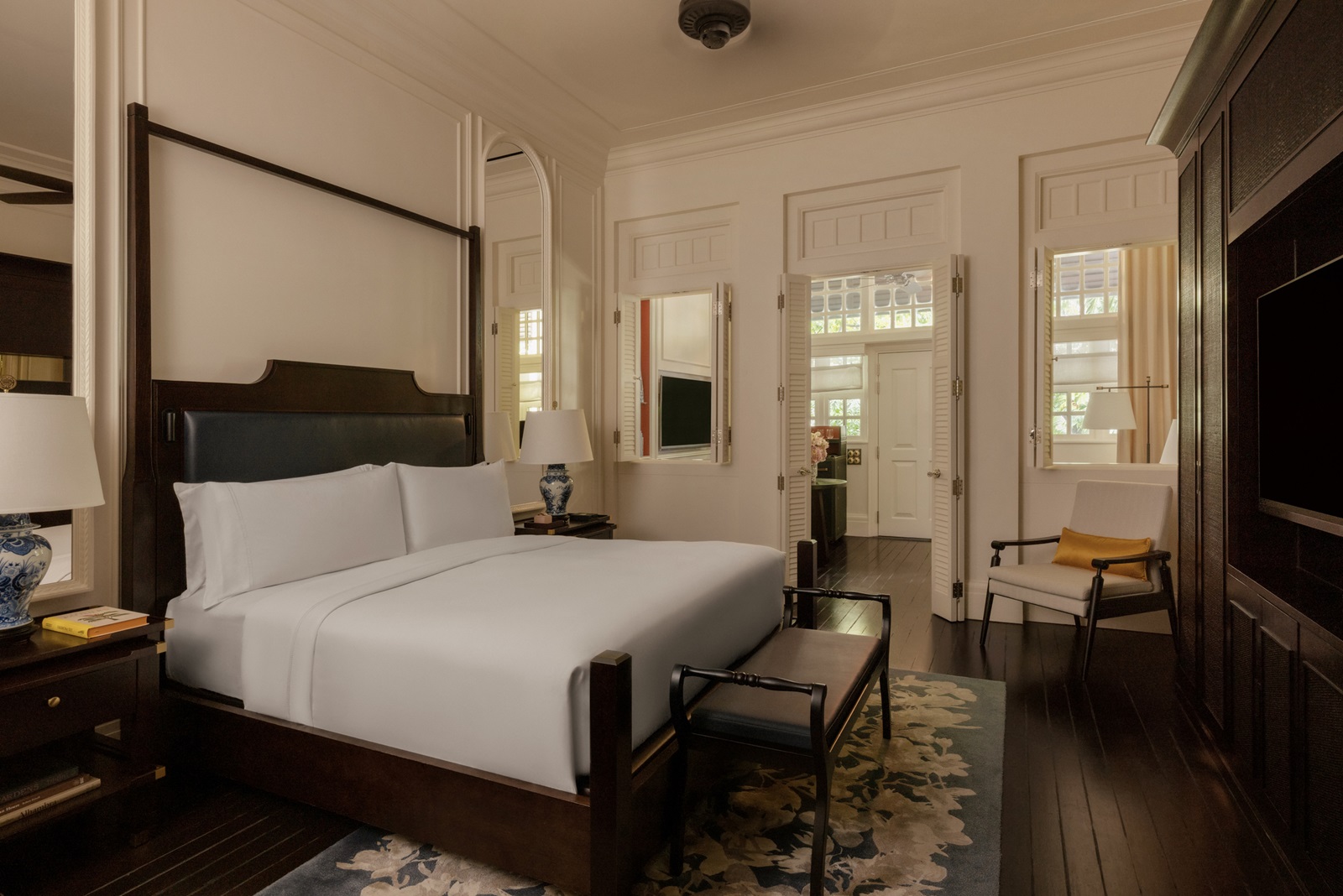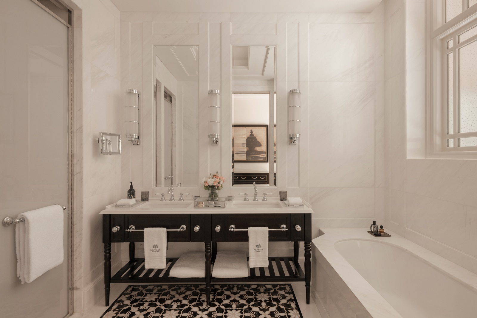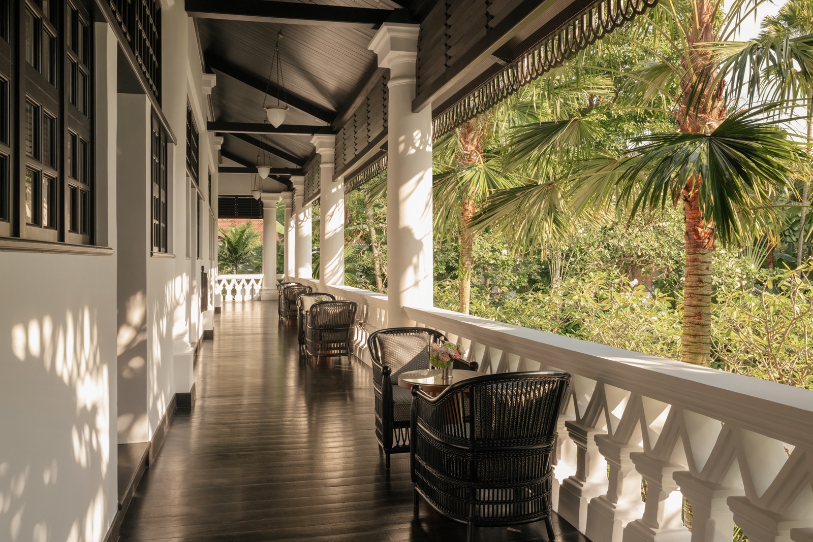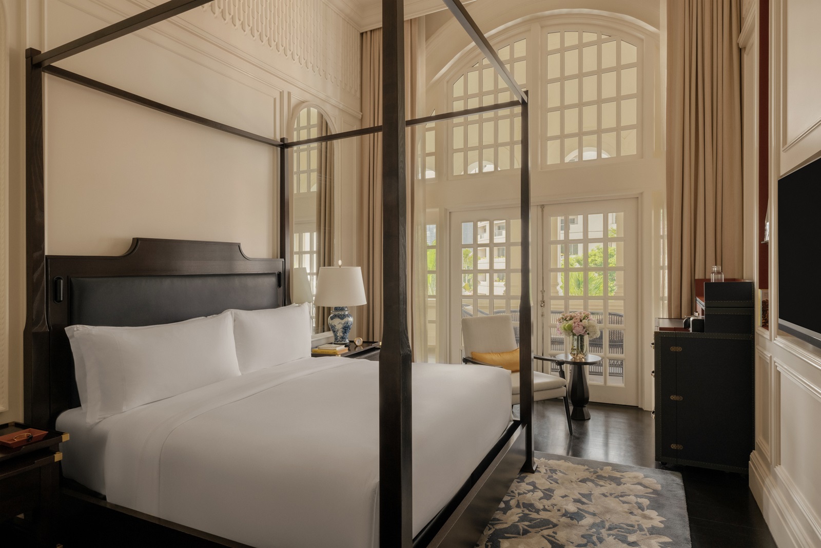 toutes les chambres dans un élégant style colonial disposent d'une splendide salle de bain en marbre (bain, douche, sèche-cheveux), coin salon, téléphone, TV à écran plat, wifi, appareil Nespresso®, coffre-fort, minibar (€), climatisation et 24/7 Raffles service de majordome