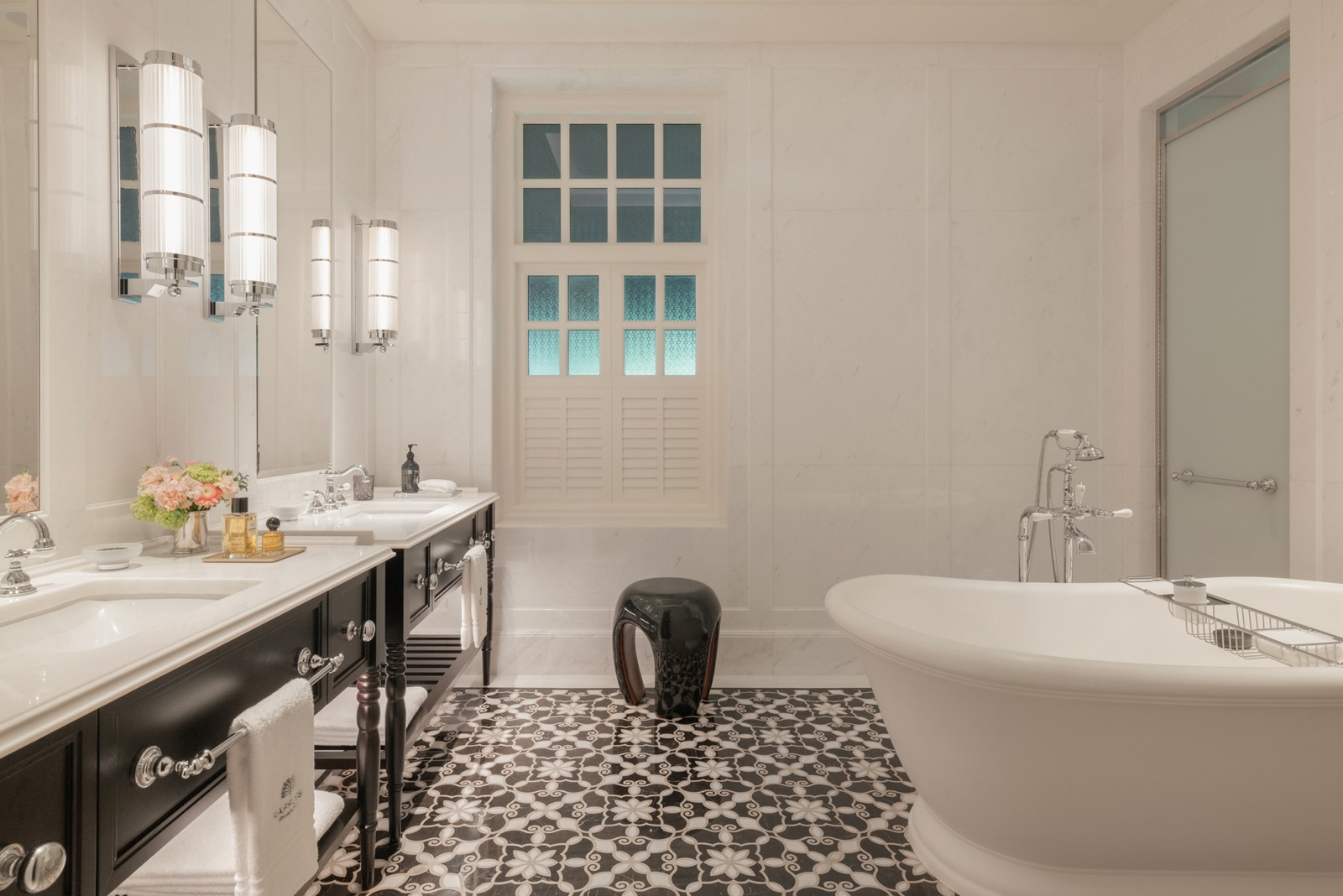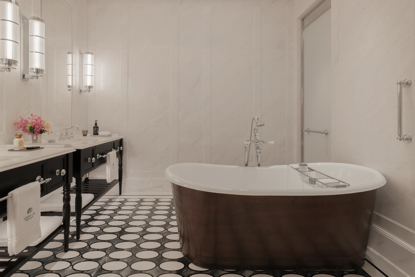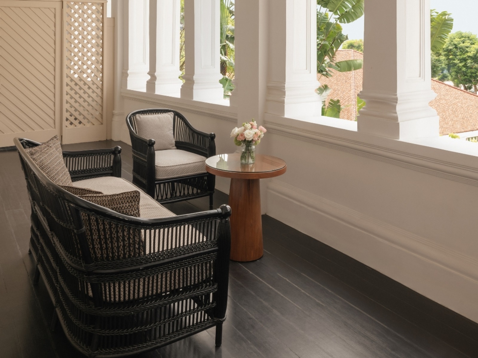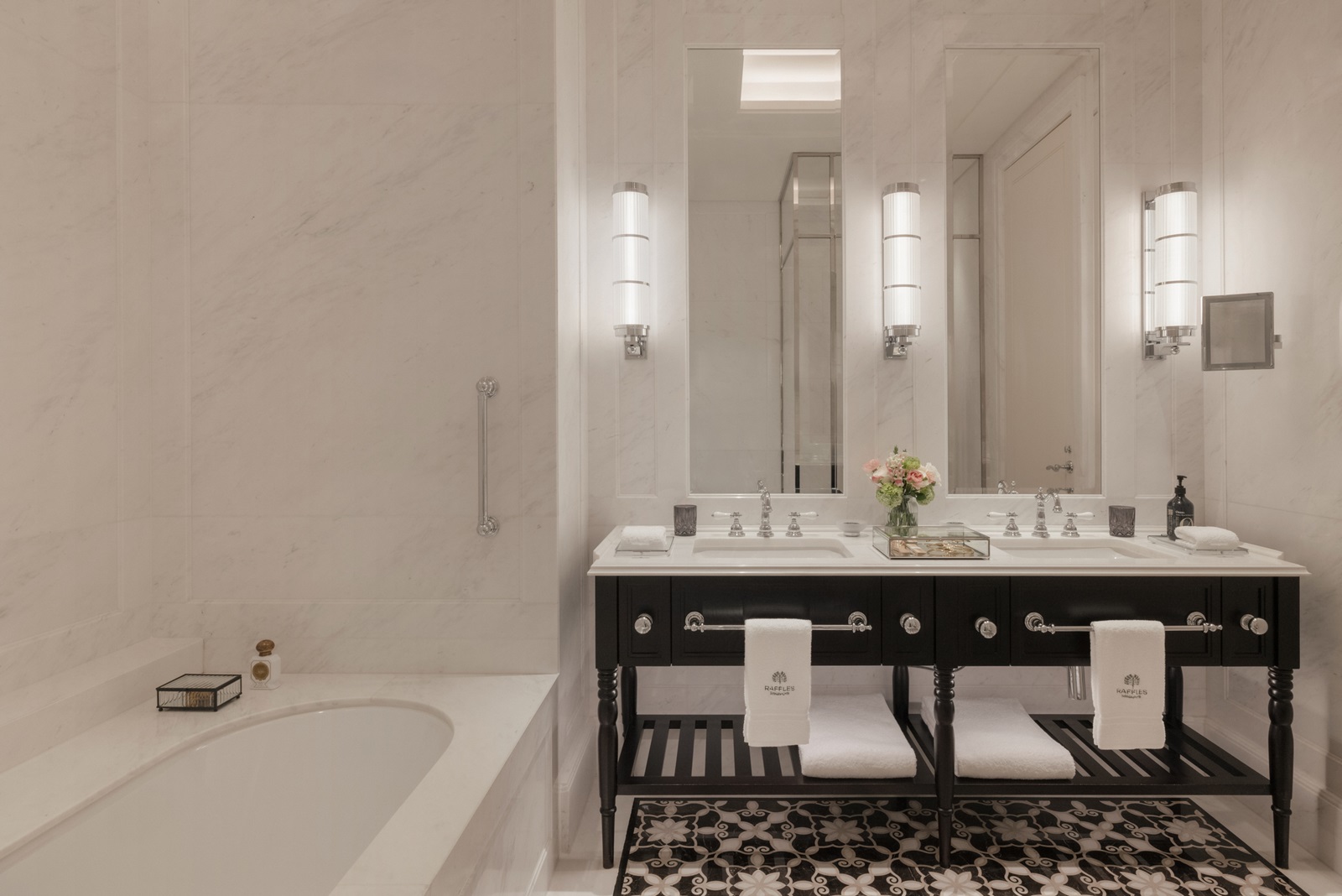 toutes les chambres dans un élégant style colonial disposent d'une splendide salle de bain en marbre (bain, douche, sèche-cheveux), coin salon, téléphone, TV à écran plat, wifi, appareil Nespresso®, coffre-fort, minibar (€), climatisation et 24/7 Raffles service de majordome