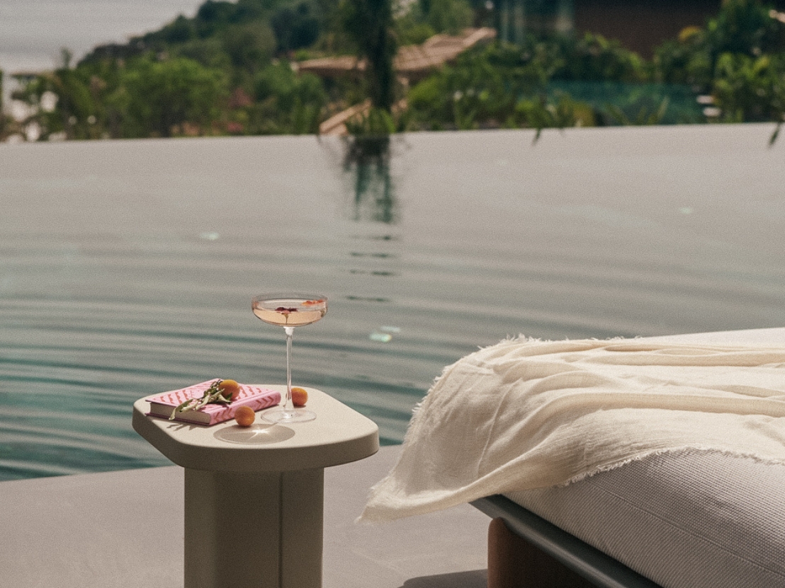 Maxx Laguna Studios (125 m²) avec salon spacieux, salle de bain (double douche) et terrasse spacieuse avec chaises longues et accès direct à la piscine