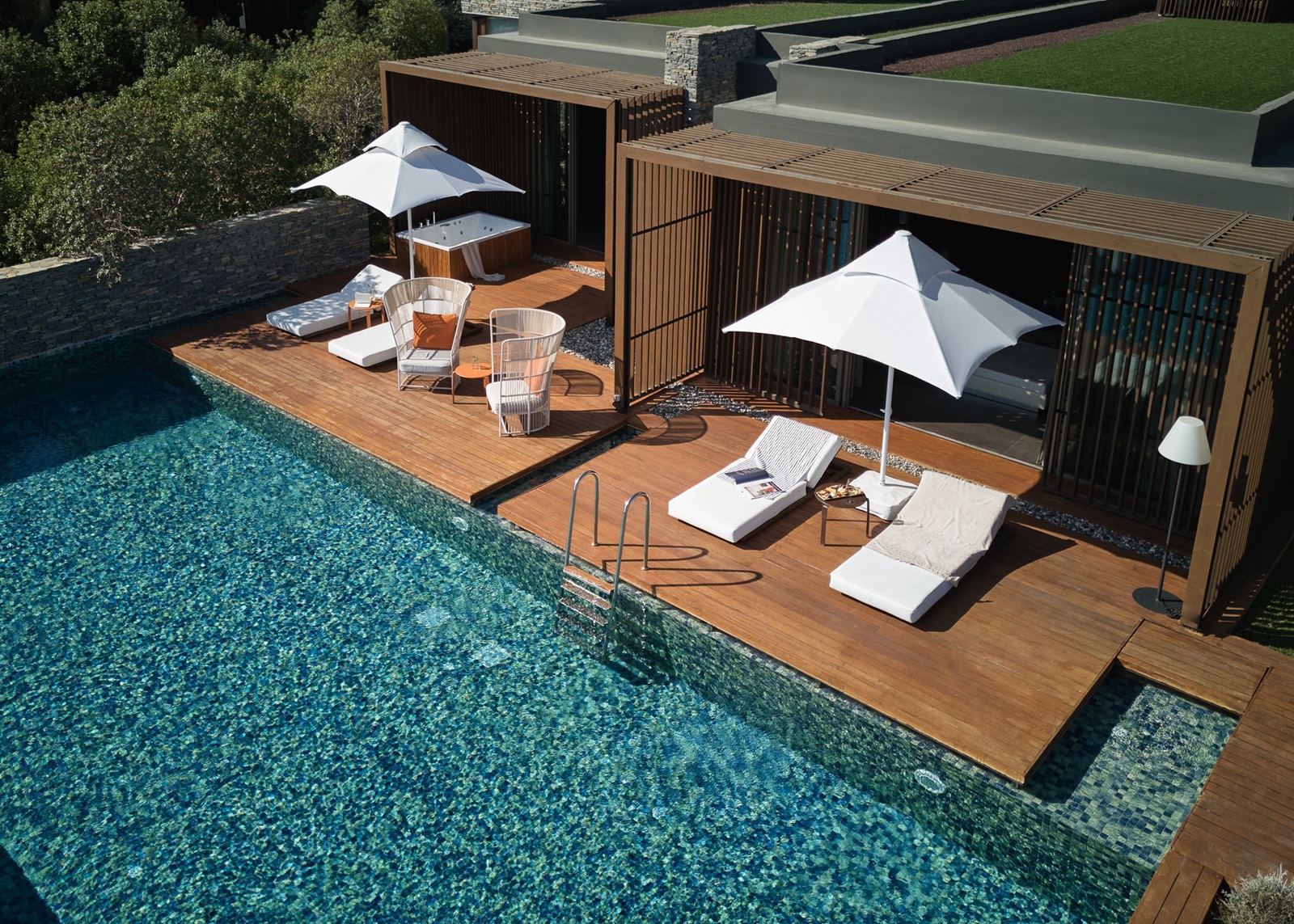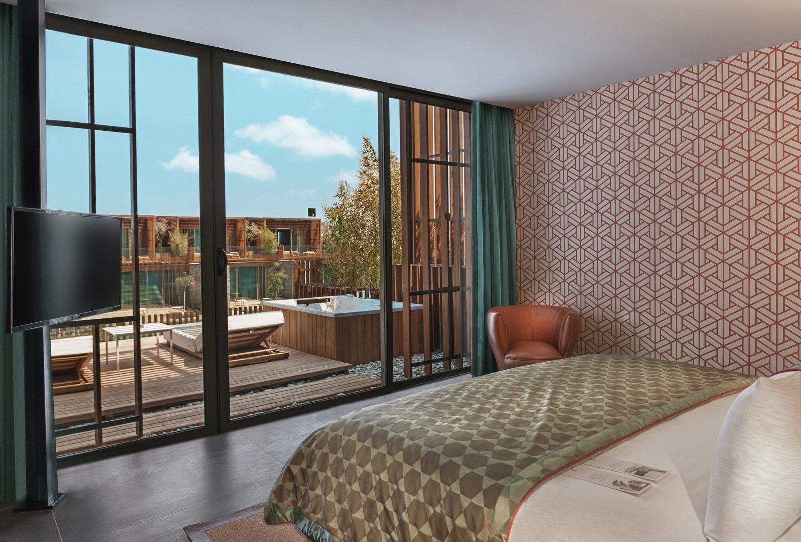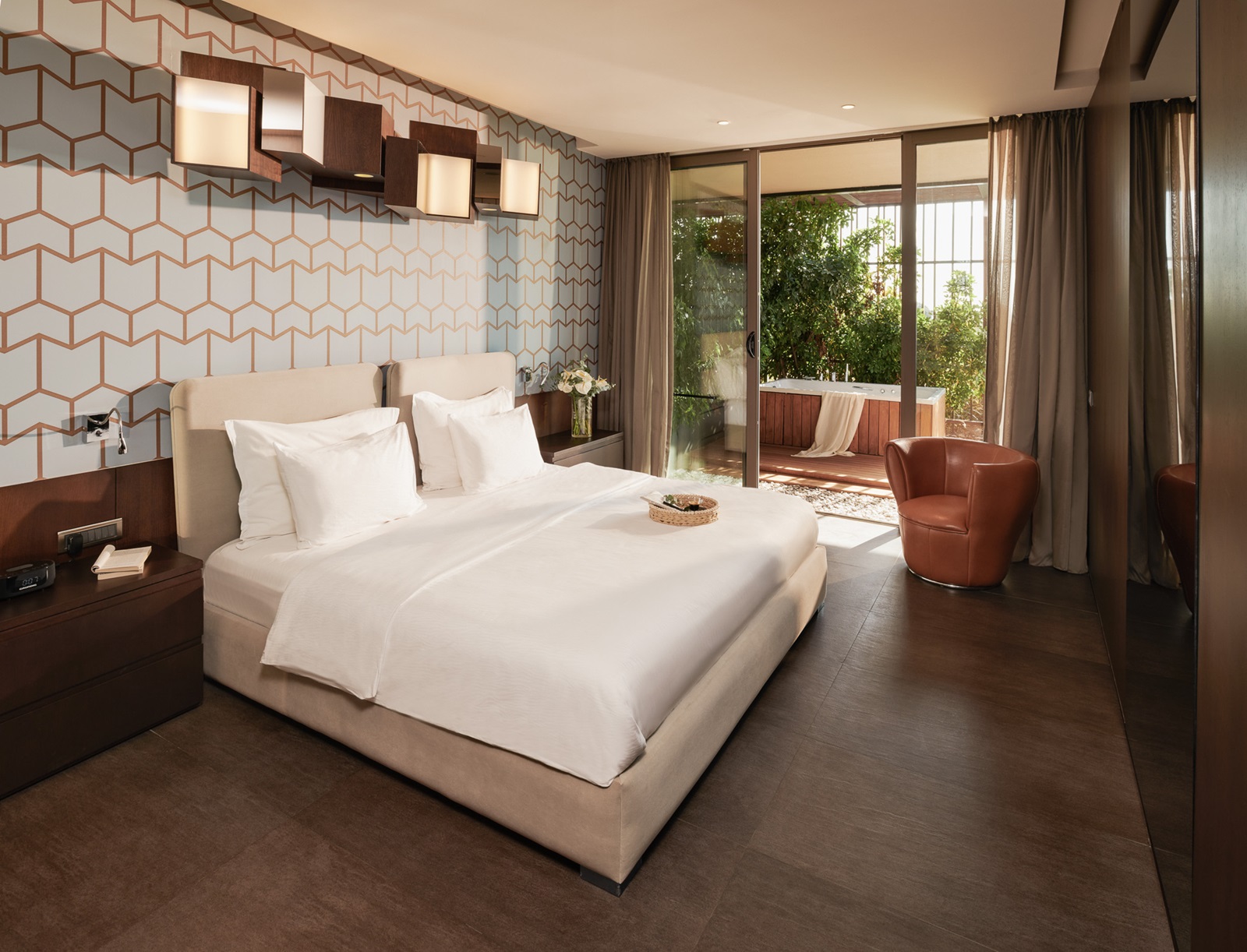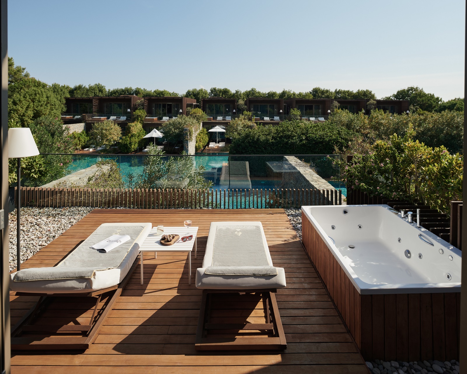 Maxx Lagoon Suites (150 m²) avec séjour, chambre à coucher séparée, terrasse avec jacuzzi et accès direct à la piscine partagée