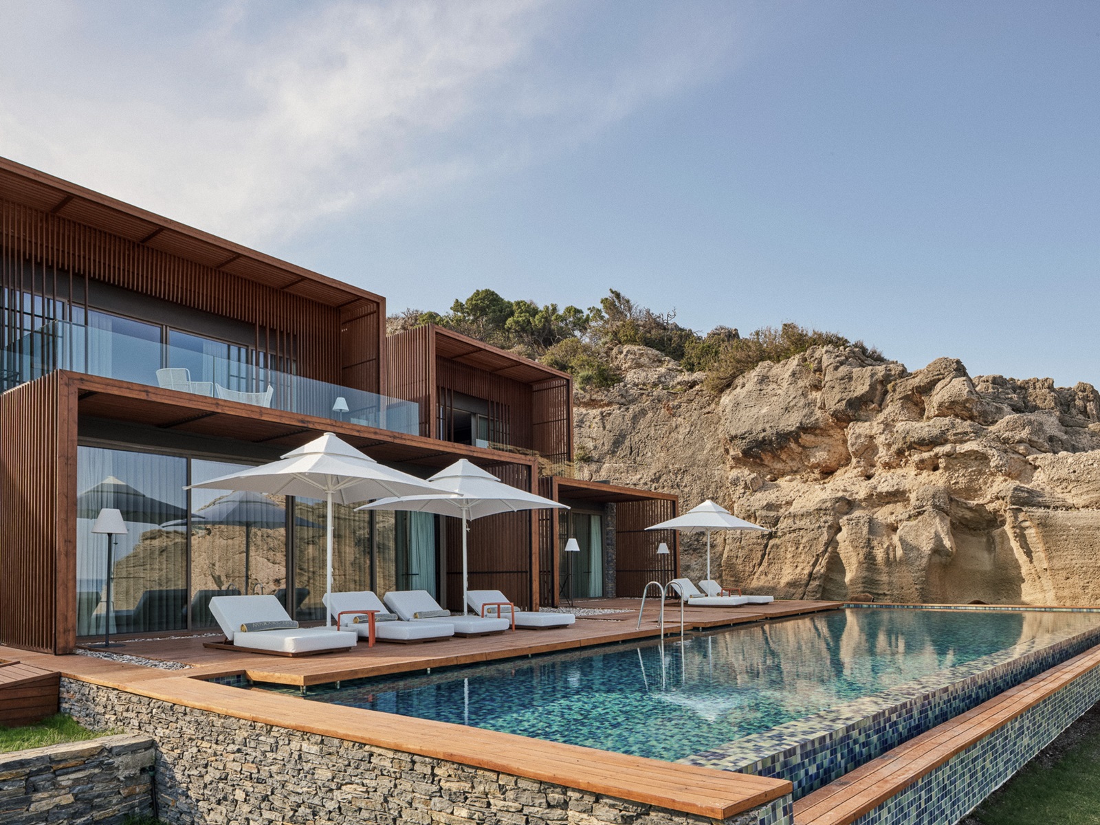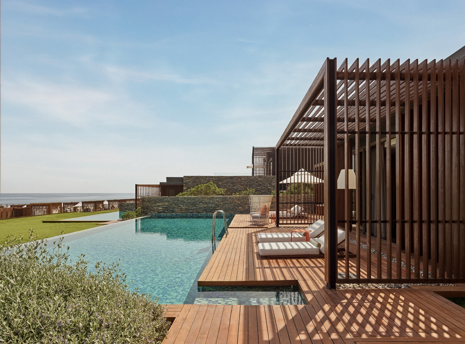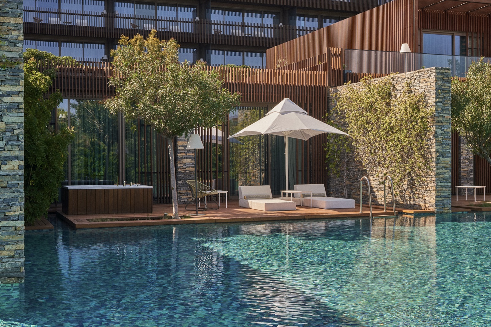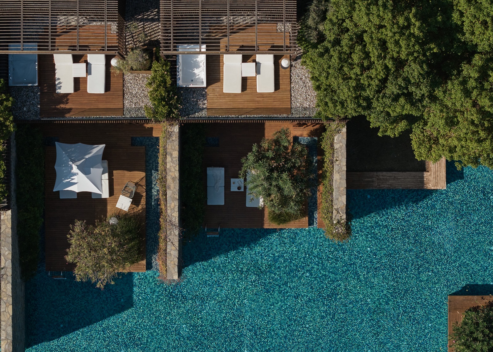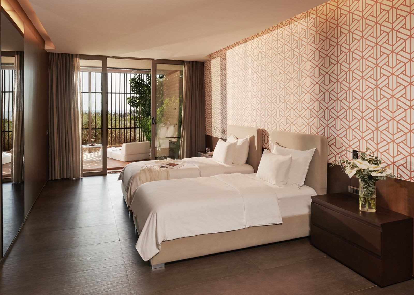 Maxx Lagoon Suites (150 m²) avec séjour, chambre à coucher séparée, terrasse avec jacuzzi et accès direct à la piscine partagée