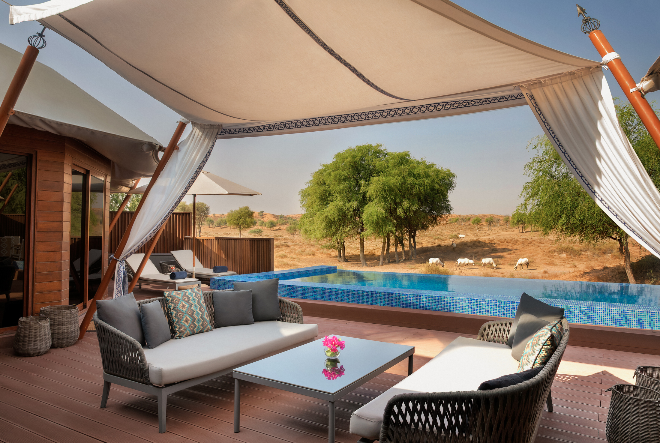 de schitterende Al Khaimah Tented Villas (253 m²) & Al Sahari Tented Pool Villas (253 m²) zijn vrijstaande villa’s (met de charme van een exclusieve bedoeïentent ) bestaande uit 2 vleugels: een ruime slaapkamer met zithoek en een schitterende badkamer, beiden met toegang tot het grote terras met privé zwembad