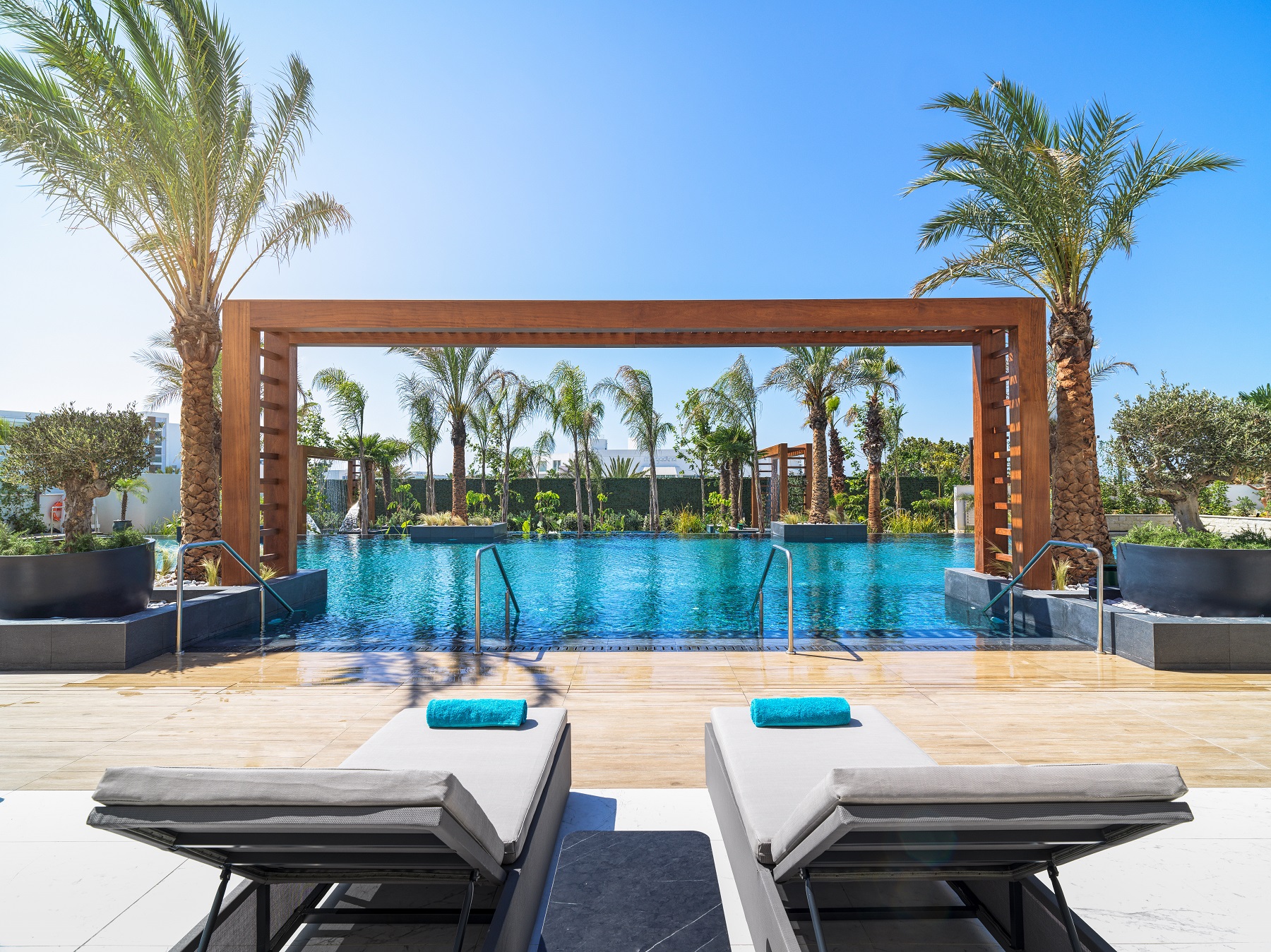 ligbedden, matrasjes en handdoeken aan zwembad met 'Sunbed allocation' waarbij elke gast een ligbed krijgt toegewezen