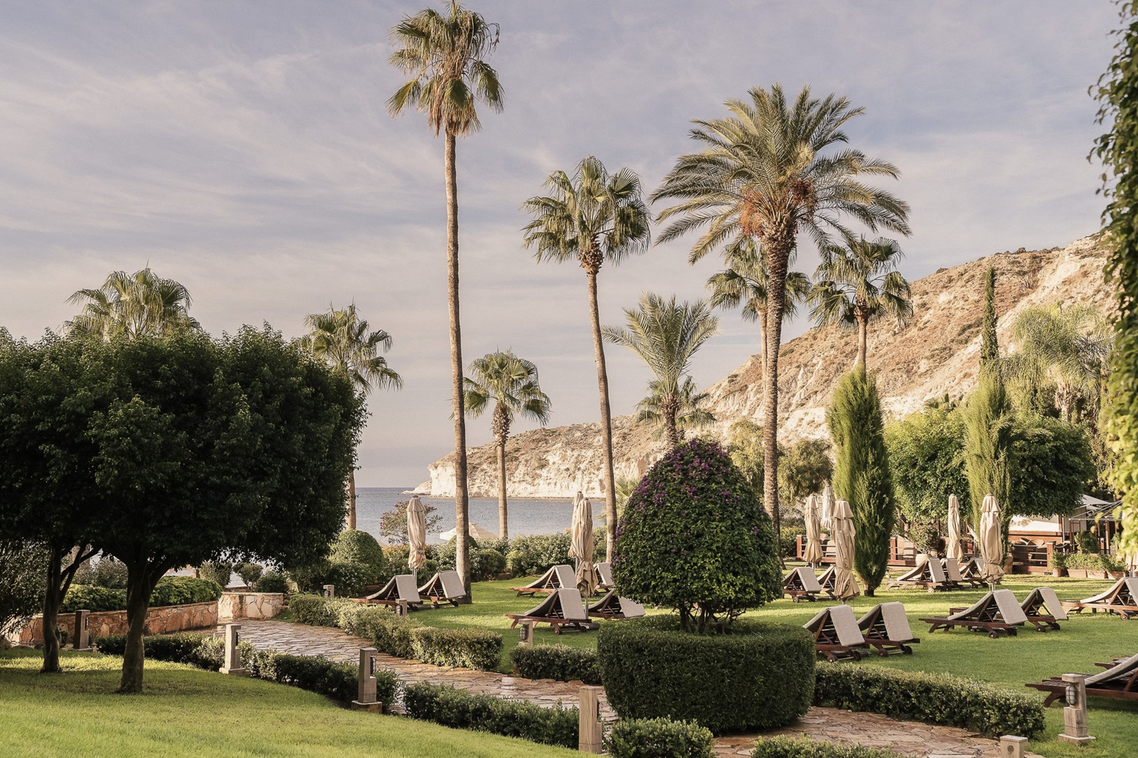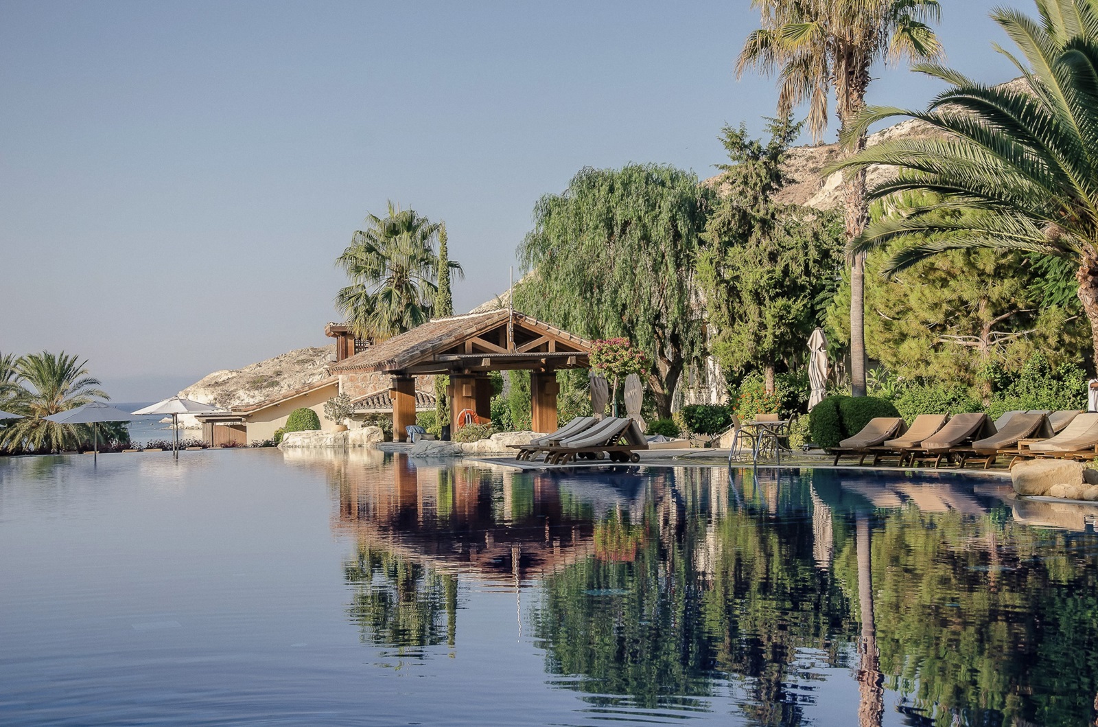 ligstoelen, parasols, matrasjes en handdoeken aan het zwembad en aan het strand