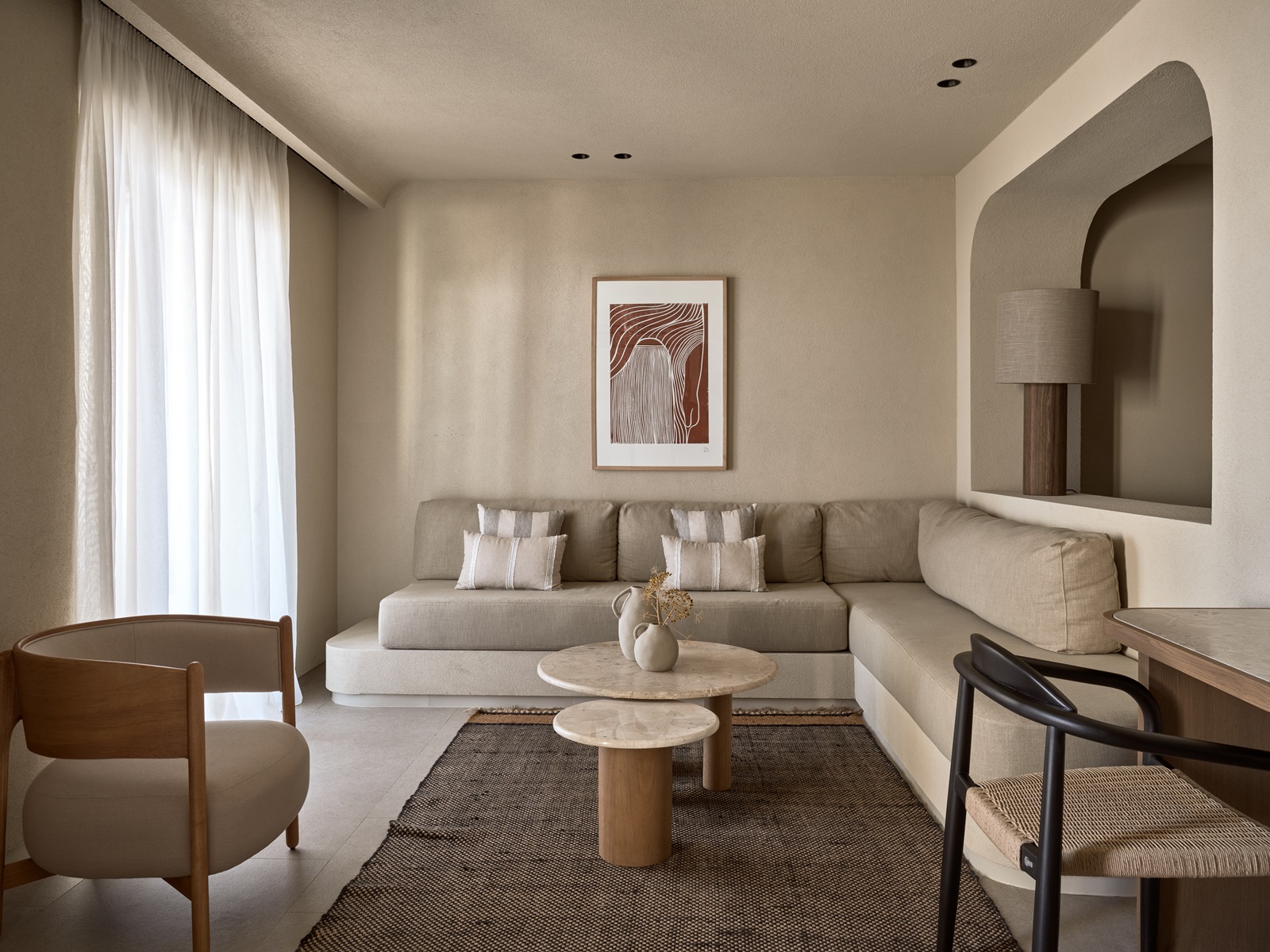 alle moderne en strak ingerichte kamers met warme en rustgevende inrichting met zandkleuren hebben een badkamer (inloopdouche, haardroger), flatscreen-tv, airconditioning, safe, thee-en koffiefaciliteiten, wifi (gratis), maxibar (€) en balkon of terras
