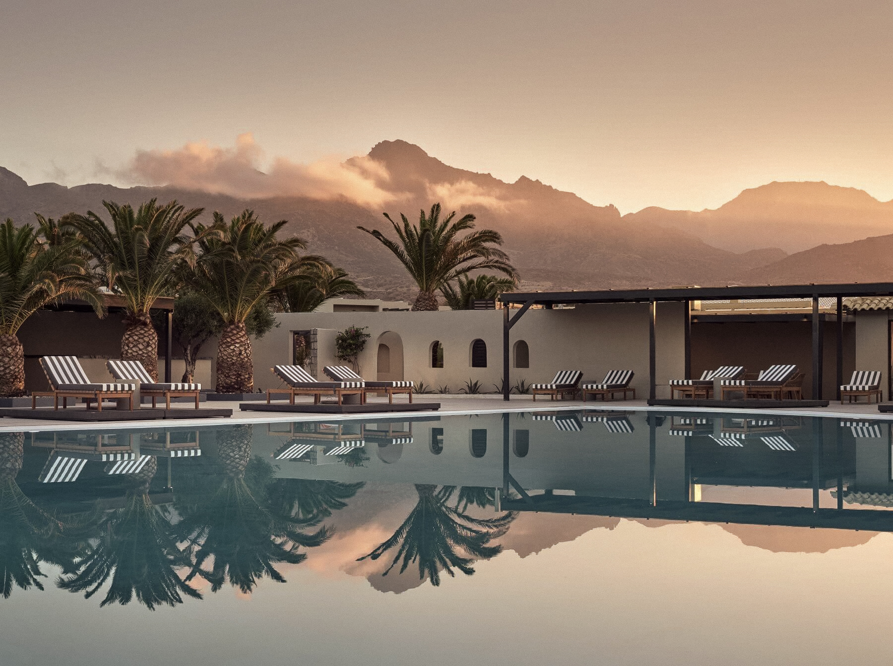 ligbedden, matrasjes, parasols en handdoeken aan het zwembad en strand