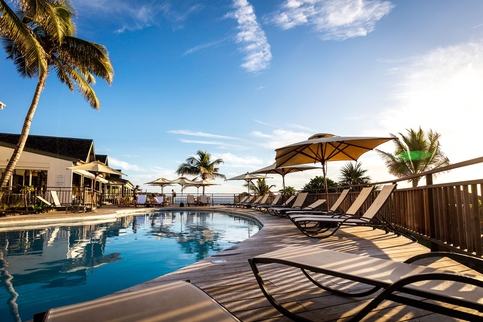 gratis ligbedden, handdoeken en parasols aan zwembad