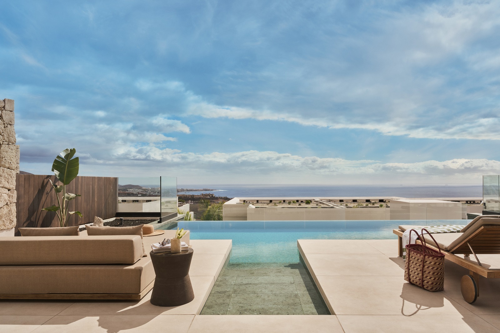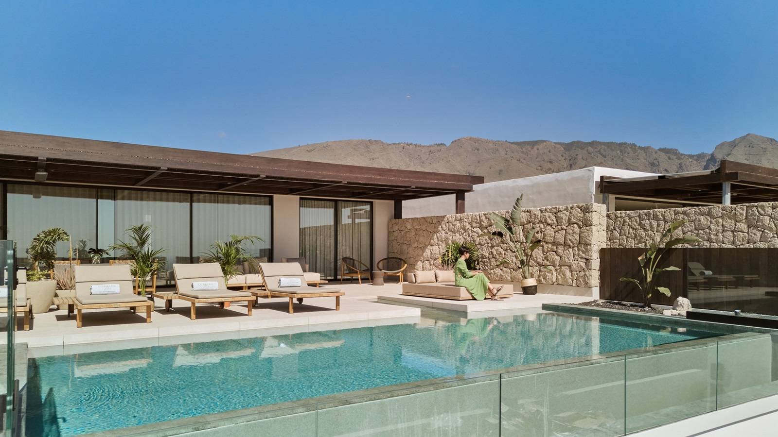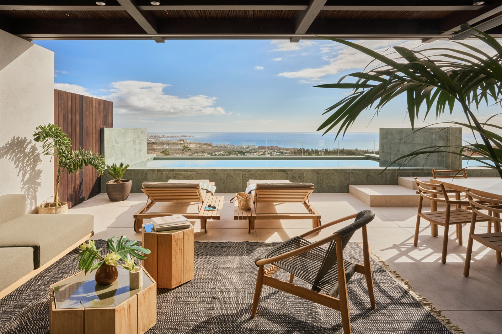 2 slpk deluxe suites panoramic sea view + pool (90 m²) met aparte living met ingerichte keuken, 2 slaapkamers en ruim terras van 39 m² met dagbed, ligstoelen, privé zwembad (9 m lang) en zeezicht