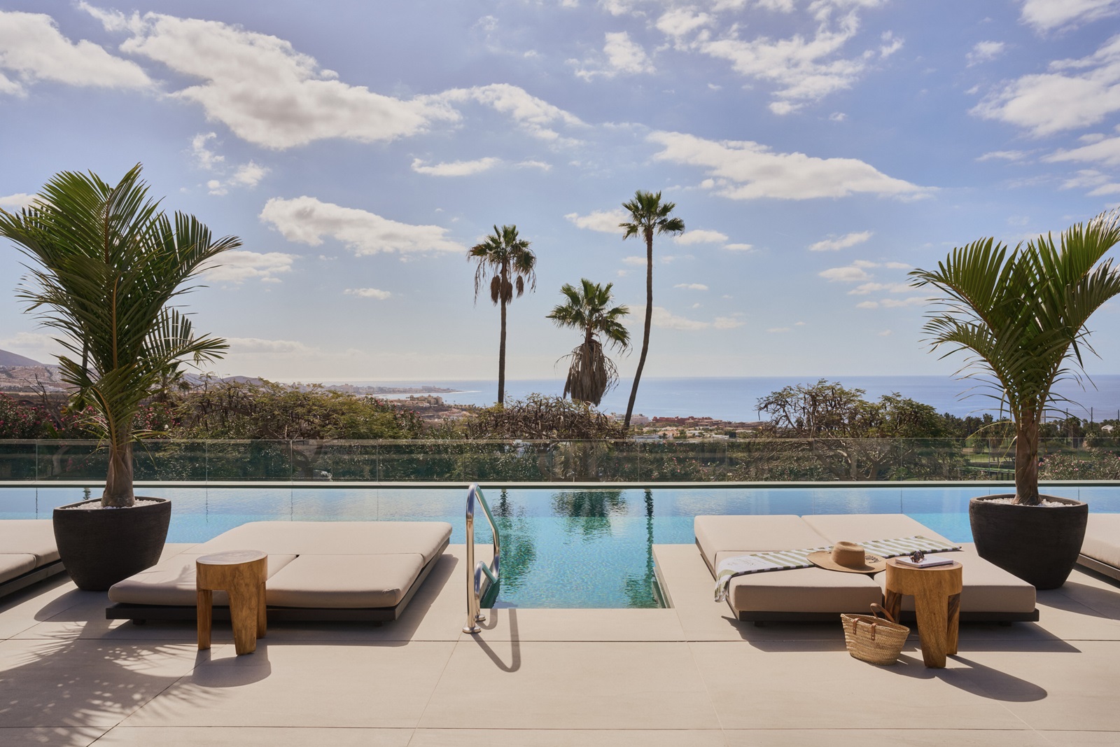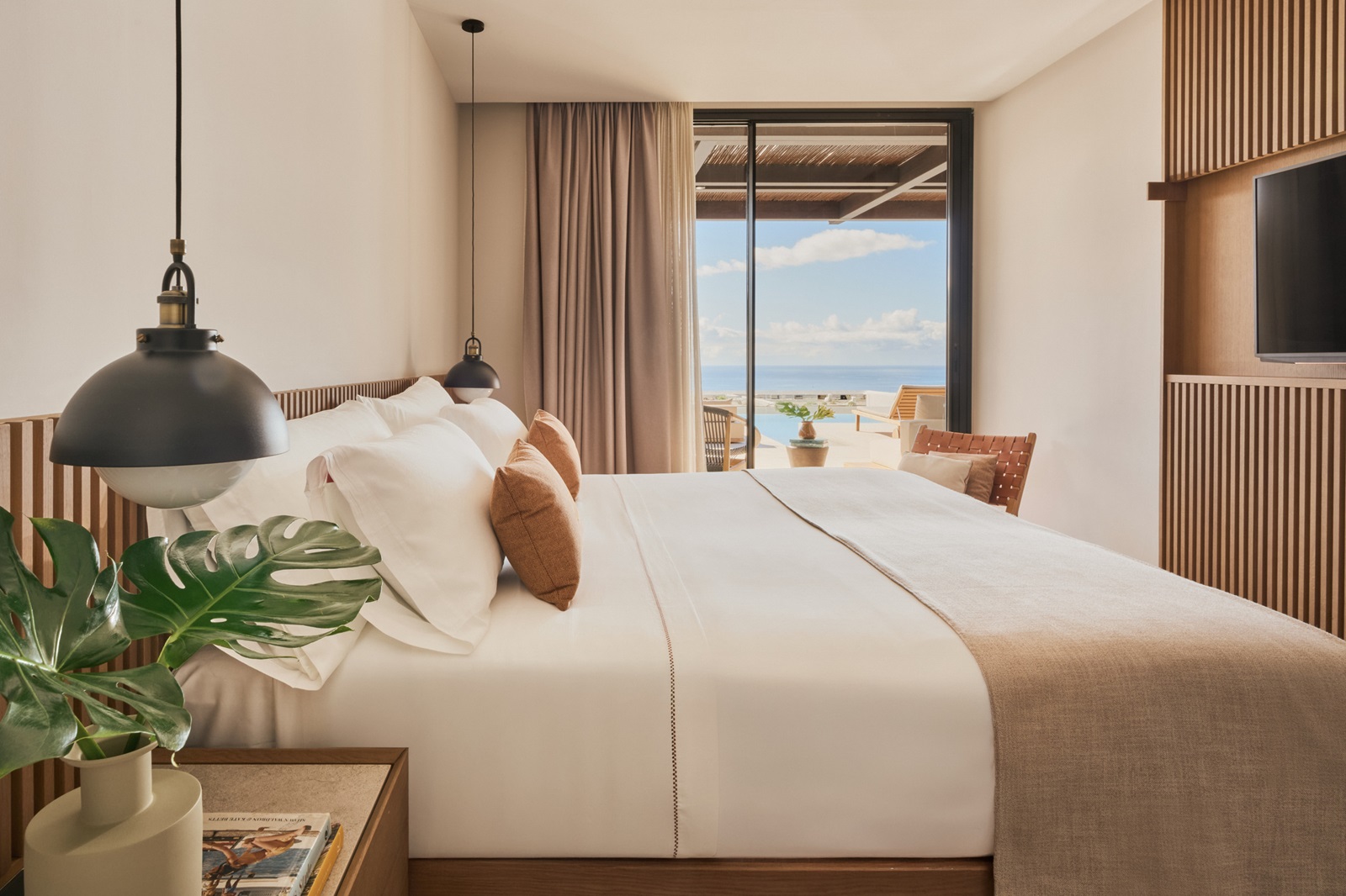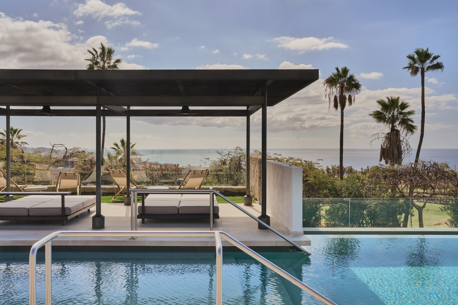 2 slpk deluxe suites panoramic sea view + pool (90 m²) met aparte living met ingerichte keuken, 2 slaapkamers en ruim terras van 39 m² met dagbed, ligstoelen, privé zwembad (9 m lang) en zeezicht