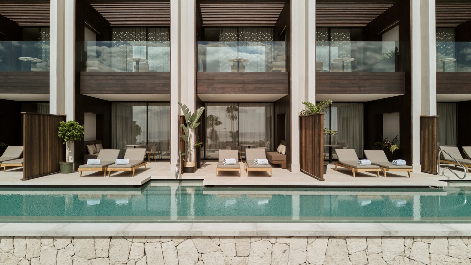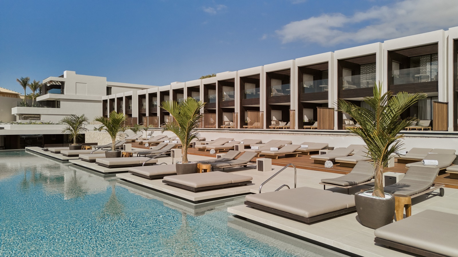 2 slpk deluxe suites sea view + pool (106 m²) met aparte living met ingerichte keuken, 2 slaapkamers en ruim terras van 47 m² met dagbed, ligstoelen en privé zwembad (9 m lang)