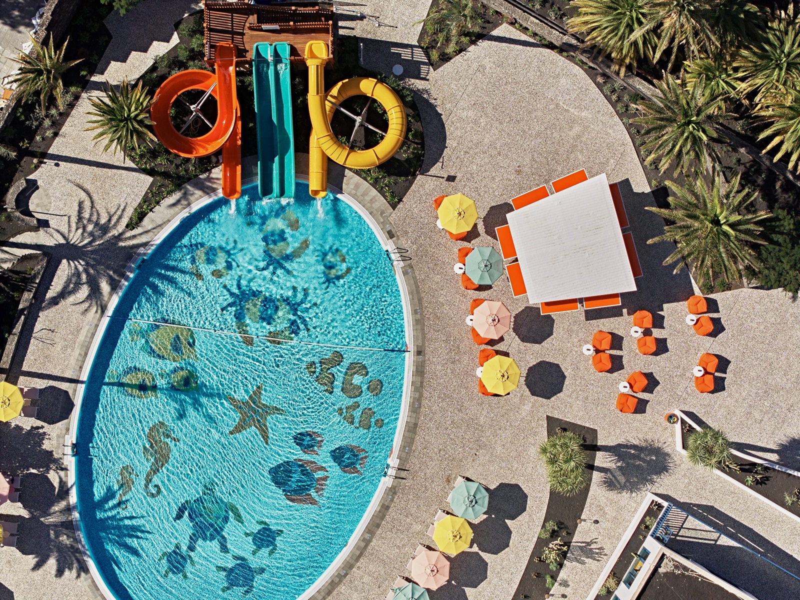 ligbedden, parasols, matrasjes en handdoeken aan de zwembaden