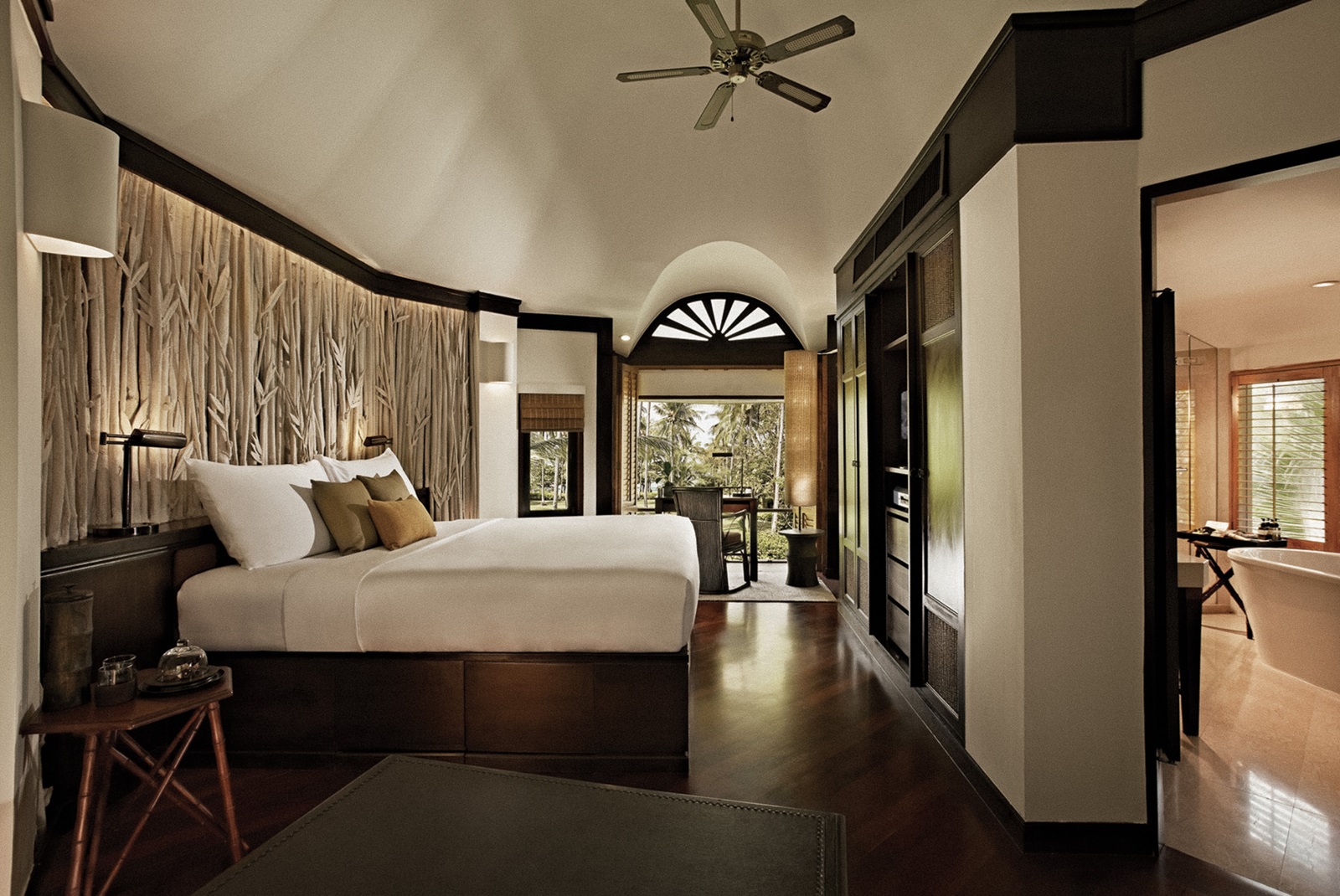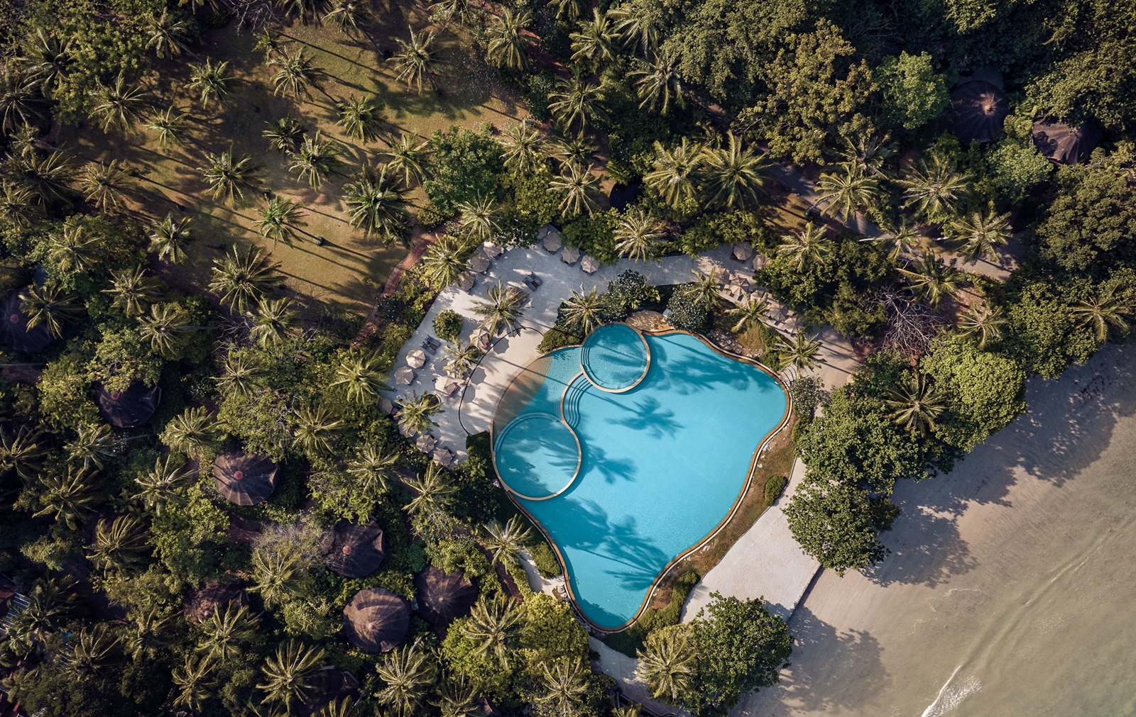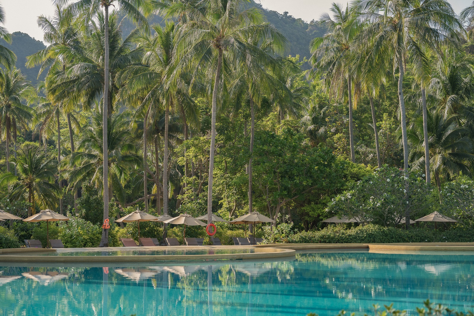 de paviljoens liggen verspreid over tropische tuinen en kokospalmen