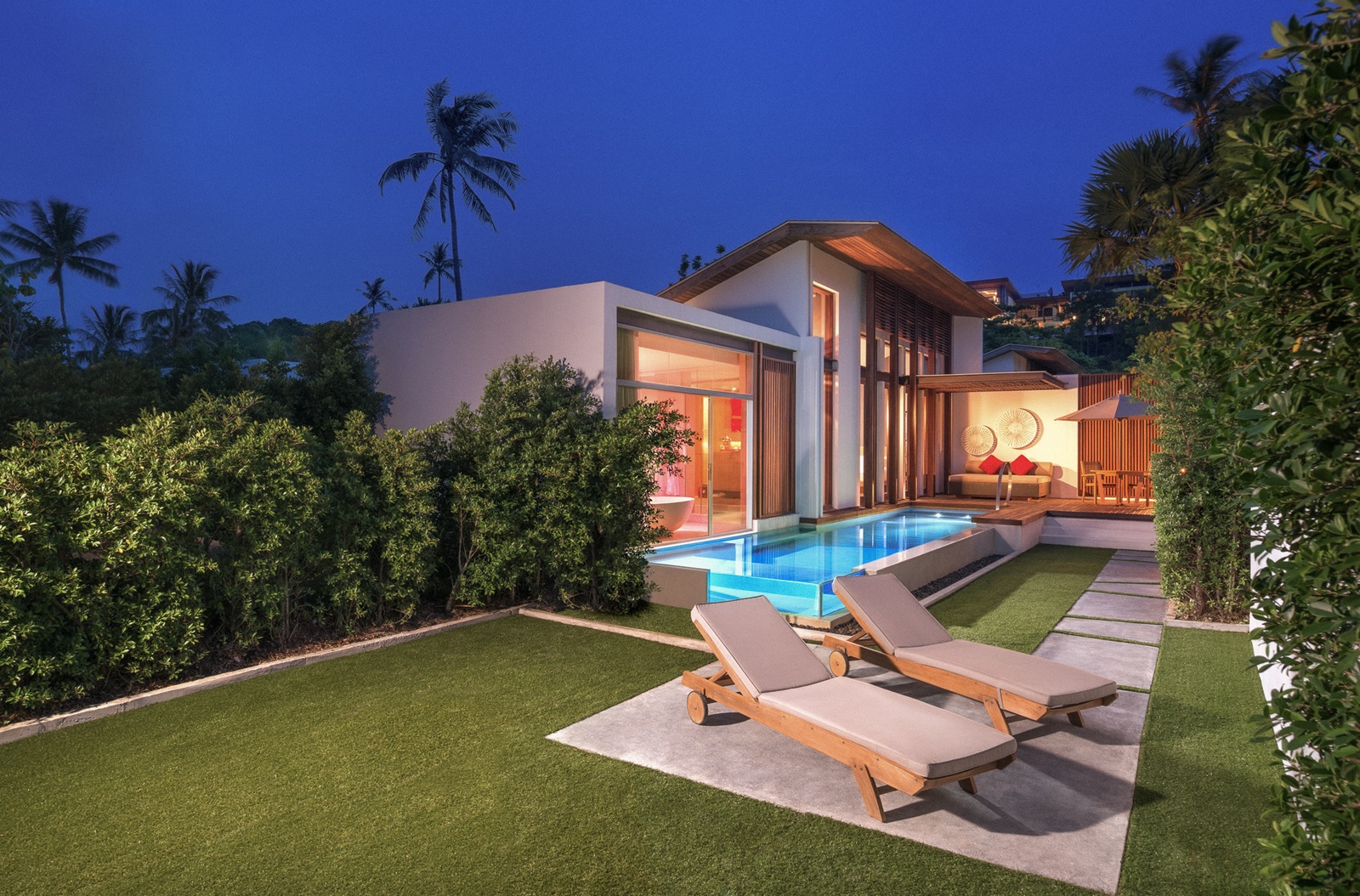 Elk van de 74 luxe Koh Samui villa's heeft een privé patio en zwembad, een adembenemend uitzicht op zee en het eiland, op maat gemaakte meubels, state-of-the-art technologie en ruime badkamers.